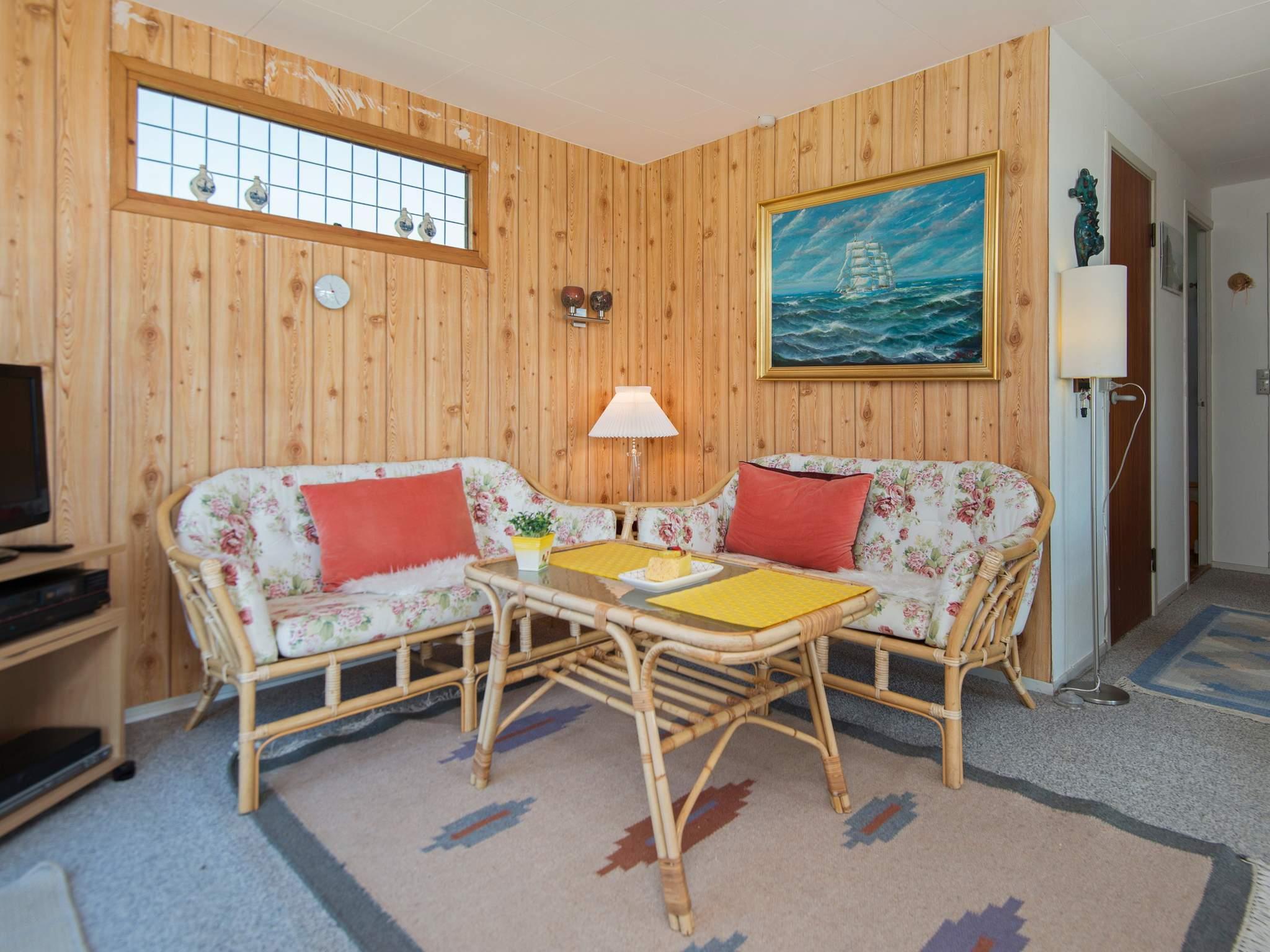 Ældre sommerhus med panoramaudsigt fra stue, udestue og den store veranda. Niveauforskellen mellem stue og udestue giver en god effekt. Der er åben forbindelse fra stuen til køkkenet. Sommerhuset har et værelse med køjeseng og et værelse med 2 enkeltsenge. Lille legeplads findes længere henne ad vejen.