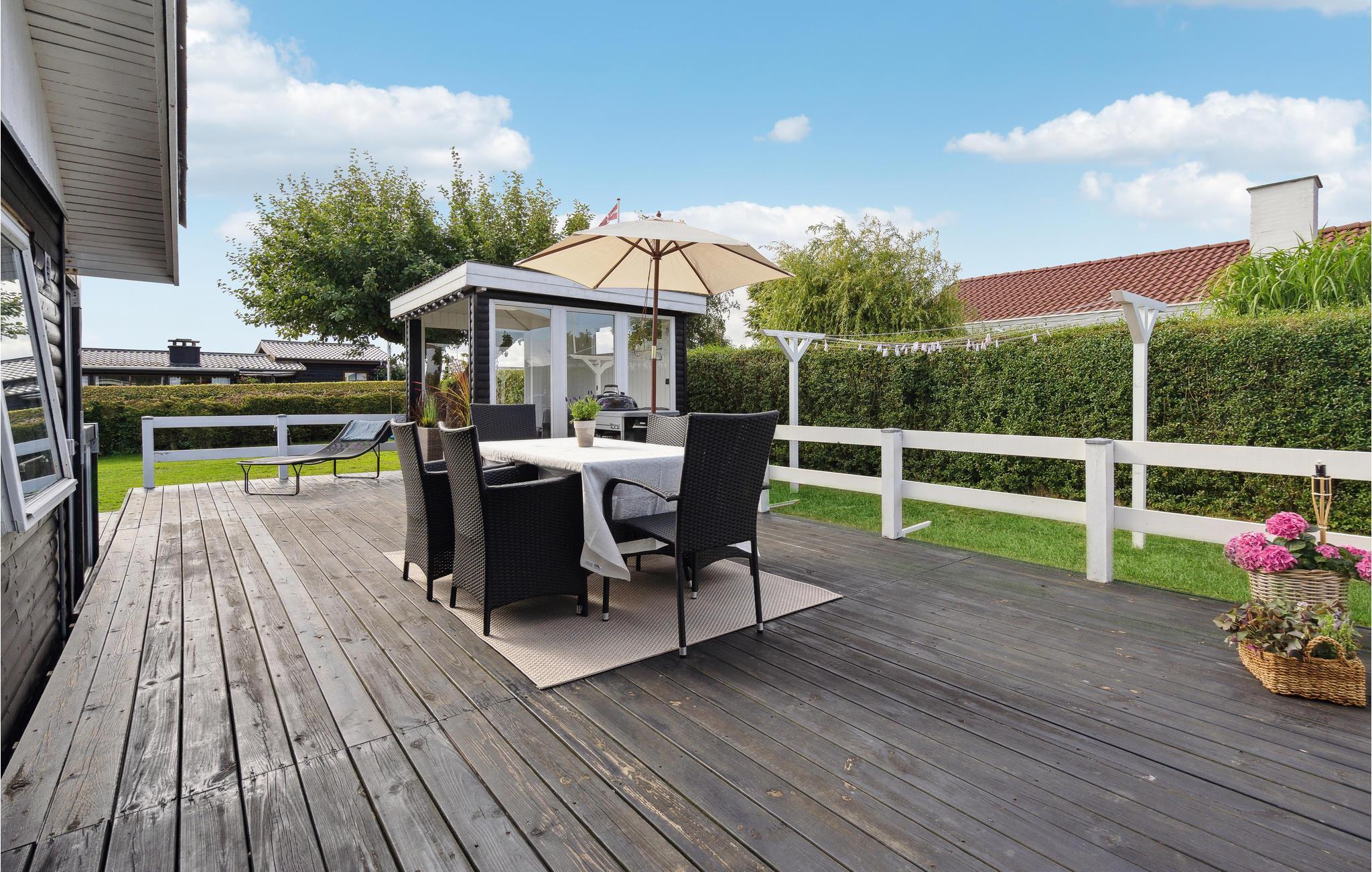 Hyggeligt sommerhus i Hejlsminde med havudsigt, flere terrasser og nær legeplads samt strand.