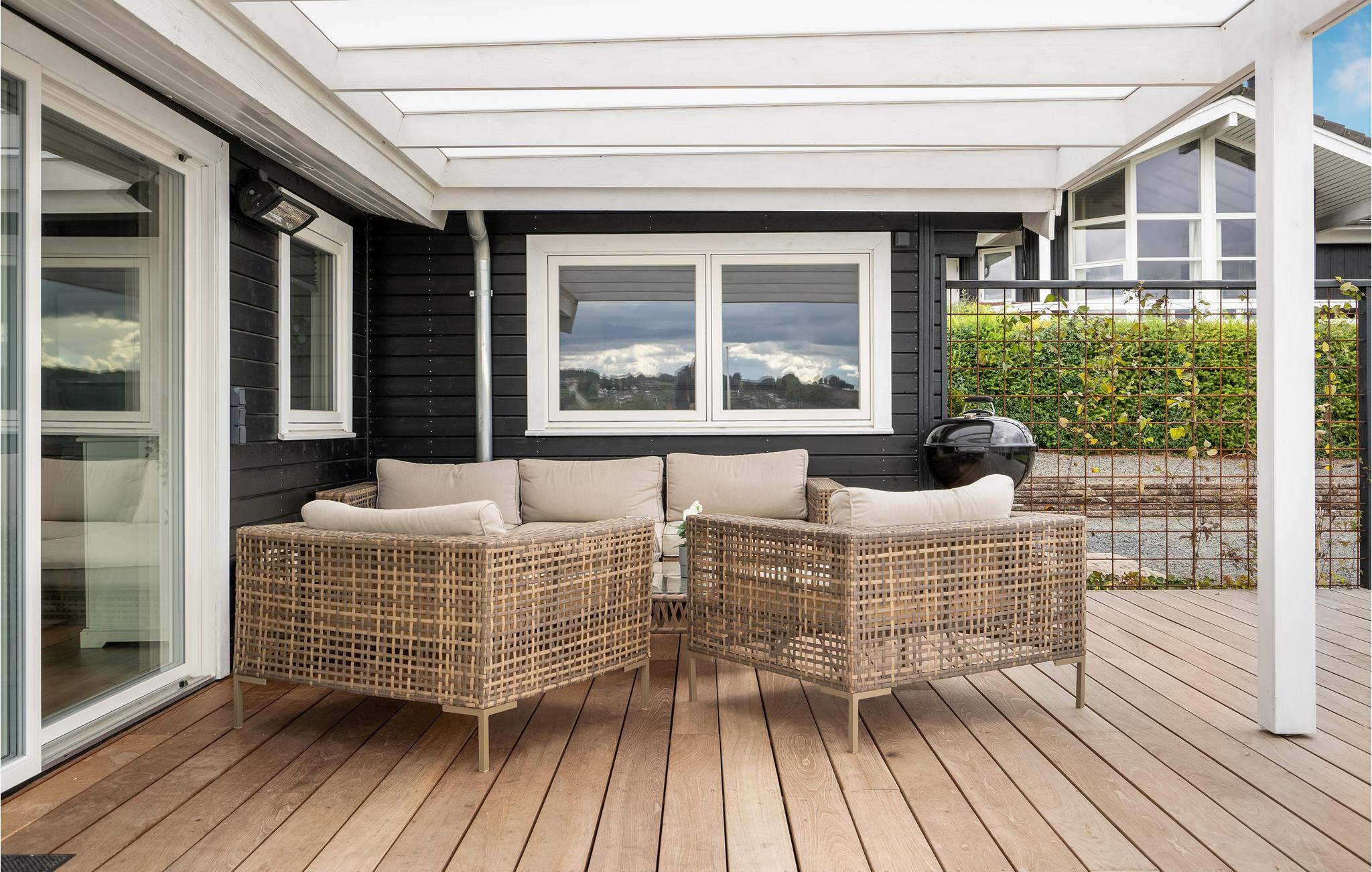 Den store træterrasse giver jer god plads i udesæsonen, hvor I kan læne jer tilbage i gode havemøbler og nyde udsigten til vandet. I kan også grille her eller nyde en pause i vildmarksbadet.
