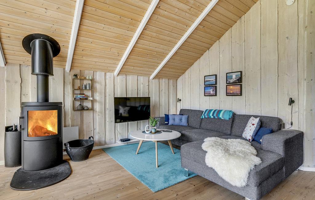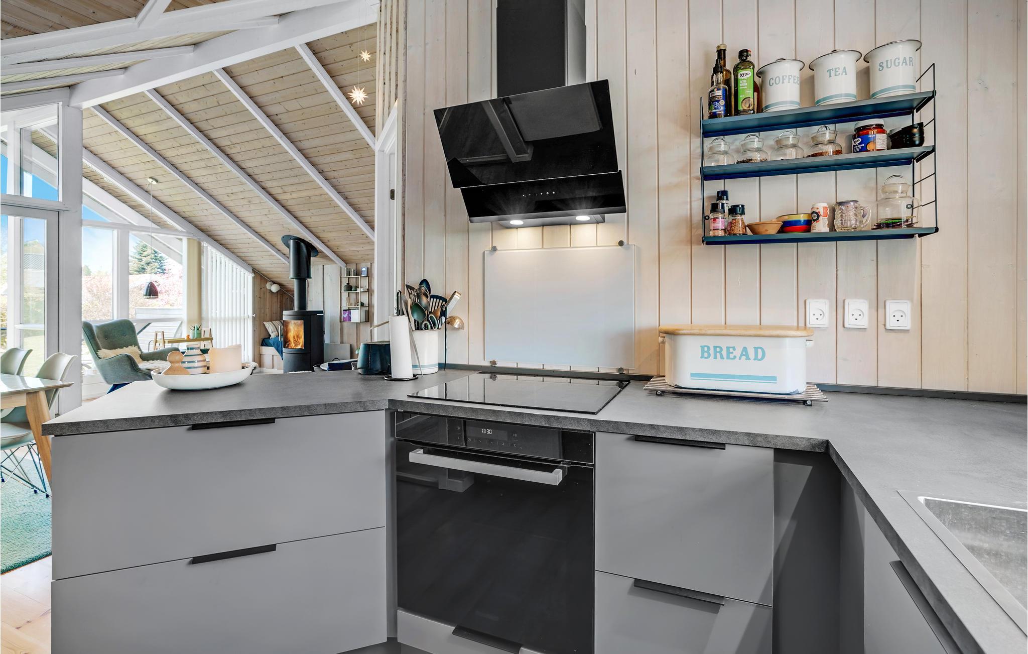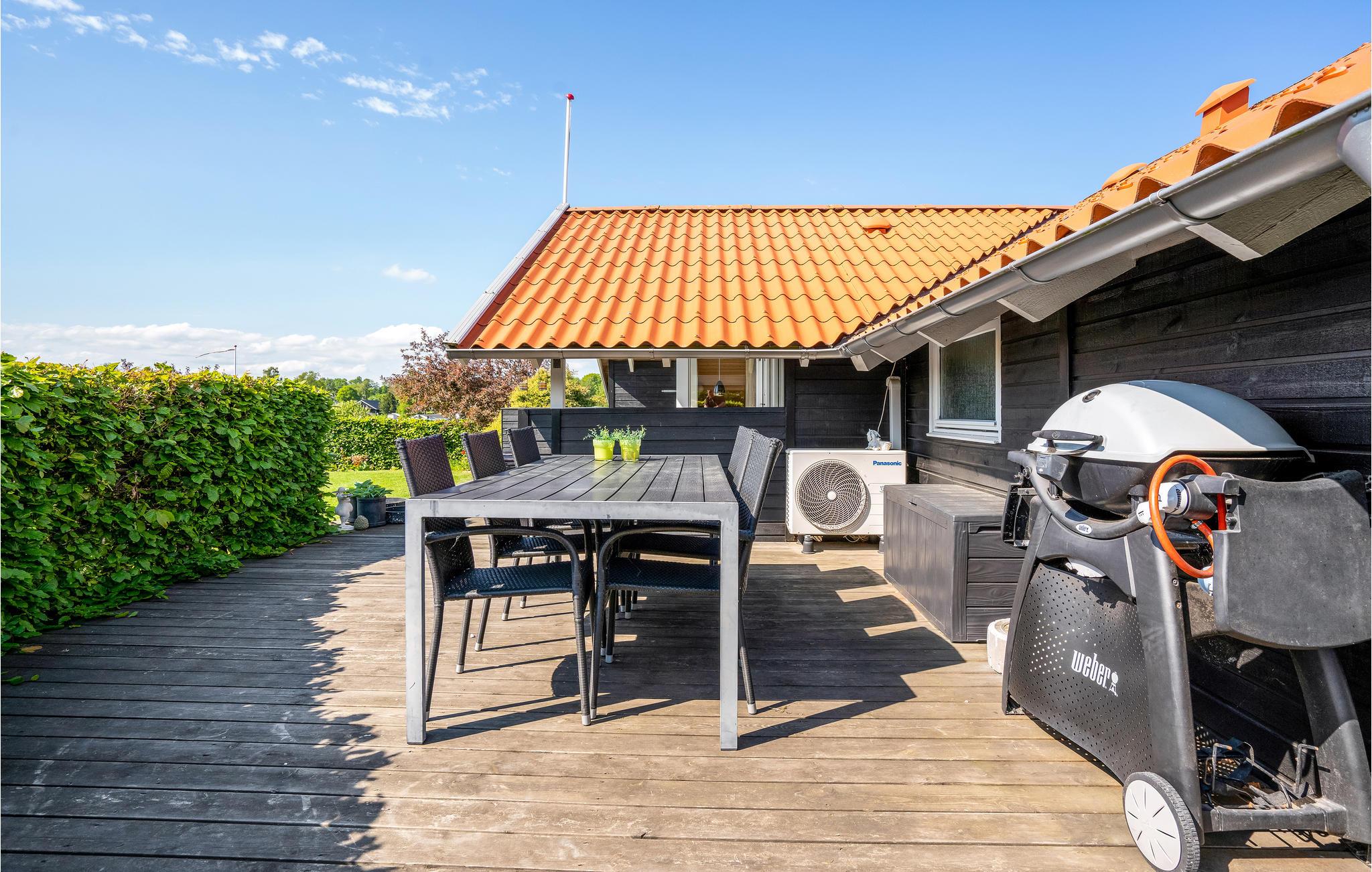Dette hyggelige feriehus ligger på en blind vej med en grund, hvor I kan opholde jer ugeneret. Stuen og køkkenet er i åben forbindelse med direkte udgang til en dejlig, delvis overdækket terrasse med udsyn ud over haven. I huset findes desuden tre gode soveværelser og et fint badeværelse, hvor også vaskemaskinen er placeret. Nyd de lyse sommeraftener på terrassen eller slap af inde foran brændeovnen i stuen på kølige dage og aftener.