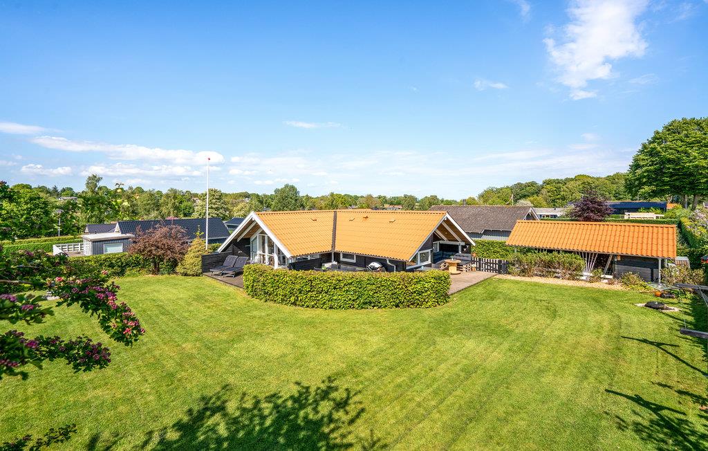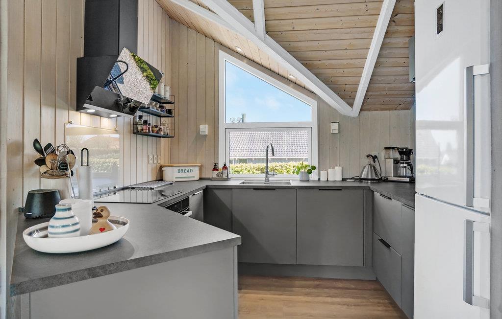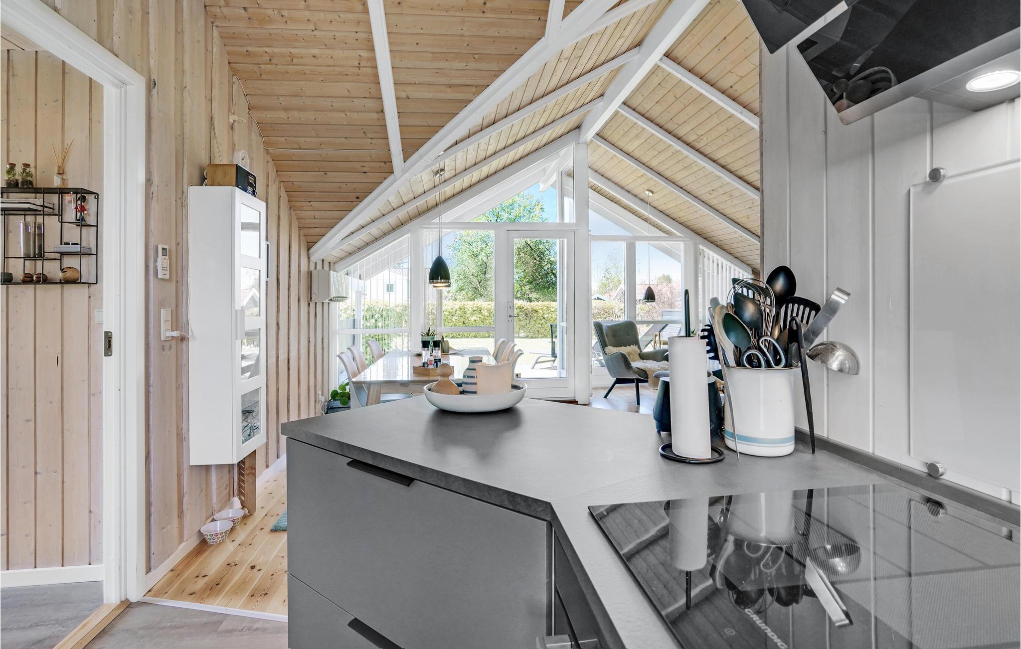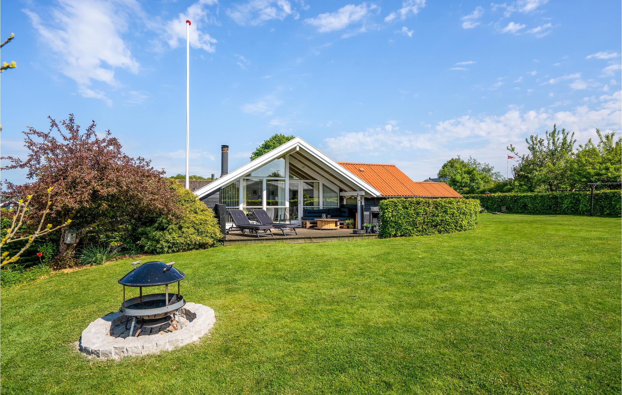 Dette hyggelige feriehus ligger på en blind vej med en grund, hvor I kan opholde jer ugeneret. Stuen og køkkenet er i åben forbindelse med direkte udgang til en dejlig, delvis overdækket terrasse med udsyn ud over haven. I huset findes desuden tre gode soveværelser og et fint badeværelse, hvor også vaskemaskinen er placeret. Nyd de lyse sommeraftener på terrassen eller slap af inde foran brændeovnen i stuen på kølige dage og aftener.