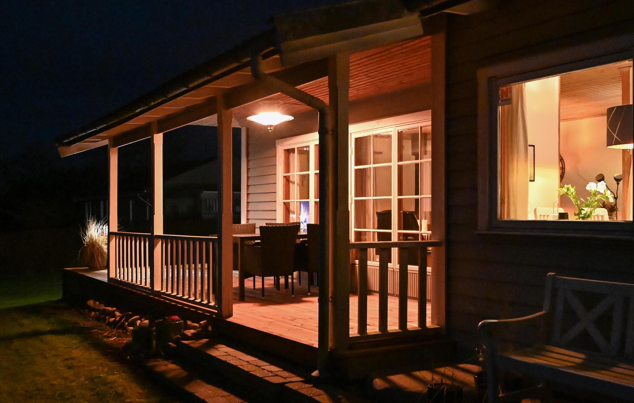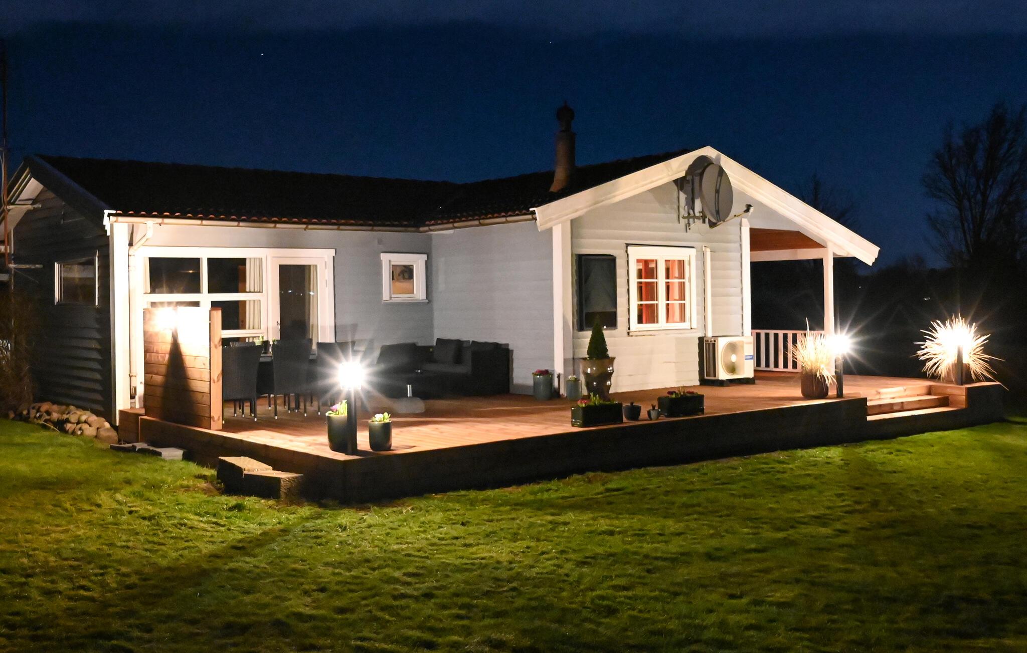 Hyggeligt træferiehus i naturskønne Hejlsminde med overdækket terrasse og udsigt over området.