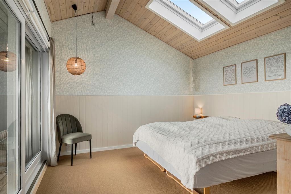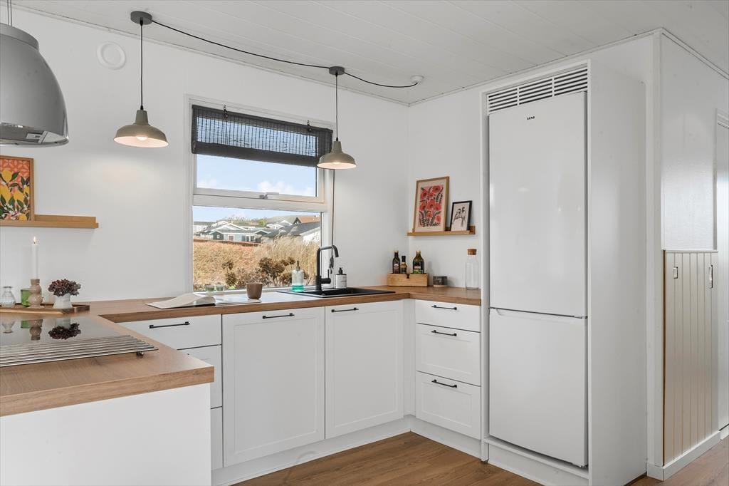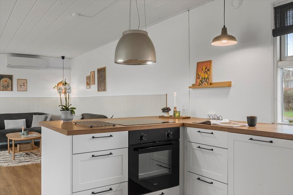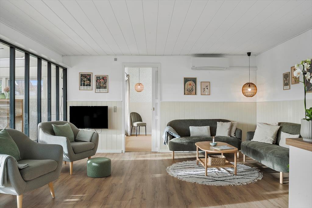 Når du træder ind i dette lyse sommerhus, mødes du straks af en indbydende atmosfære. Den store havestue er husets hjerte, og dens store vinduer fylder rummet med naturligt lys, hvilket skaber en varm og hyggelig stemning i resten af huset. Her kan du nyde udsigten til haven eller tilbringe rolige eftermiddage med en bog i hånden, mens lyset strømmer ind. I den åbne opholdsstue er der god plads til både afslapning og samvær, og det åbne køkken indbyder til hyggelige måltider sammen med familien. Det rummelige soveværelse har direkte adgang til haven, så du kan vågne op til lyden af fuglesang og gå en morgentur i den friske luft, lige når du står op. Hele huset er indrettet med komfort og ro i fokus, hvilket gør det nemt at koble af og nyde ferien.