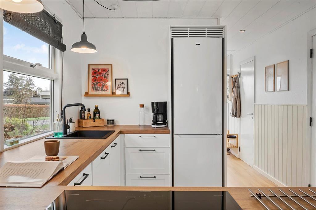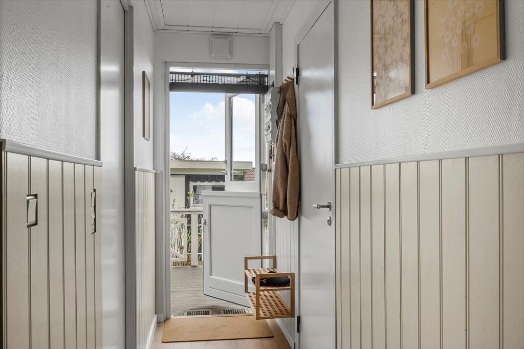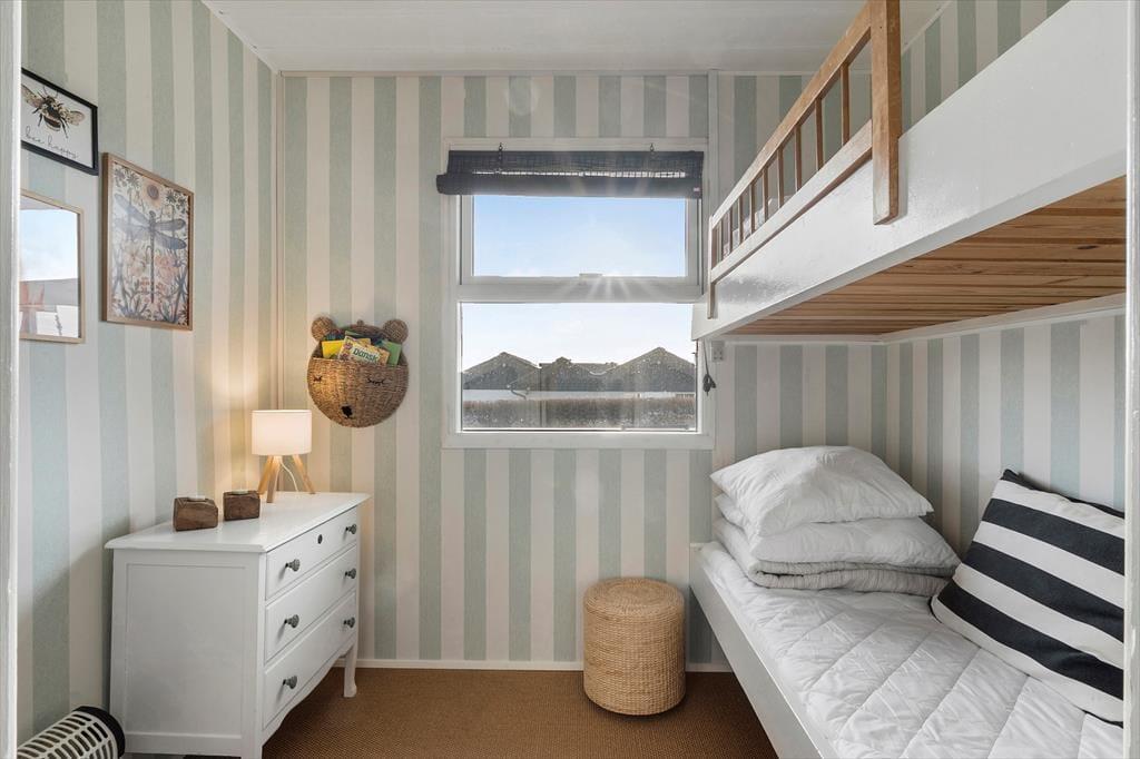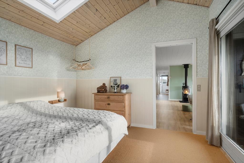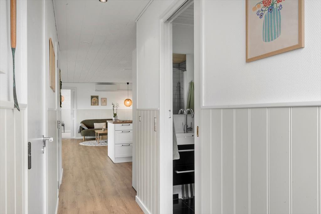 Når du træder ind i dette lyse sommerhus, mødes du straks af en indbydende atmosfære. Den store havestue er husets hjerte, og dens store vinduer fylder rummet med naturligt lys, hvilket skaber en varm og hyggelig stemning i resten af huset. Her kan du nyde udsigten til haven eller tilbringe rolige eftermiddage med en bog i hånden, mens lyset strømmer ind. I den åbne opholdsstue er der god plads til både afslapning og samvær, og det åbne køkken indbyder til hyggelige måltider sammen med familien. Det rummelige soveværelse har direkte adgang til haven, så du kan vågne op til lyden af fuglesang og gå en morgentur i den friske luft, lige når du står op. Hele huset er indrettet med komfort og ro i fokus, hvilket gør det nemt at koble af og nyde ferien.
