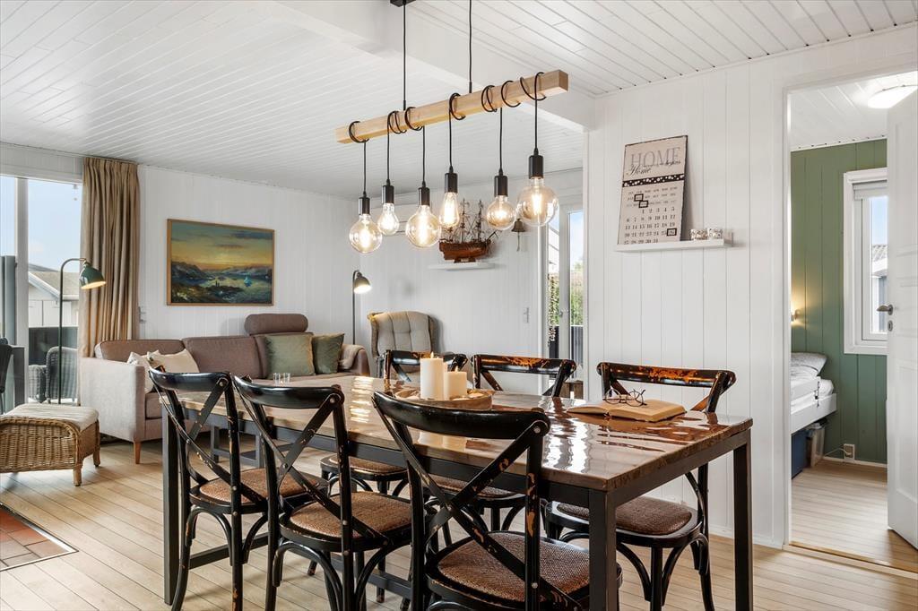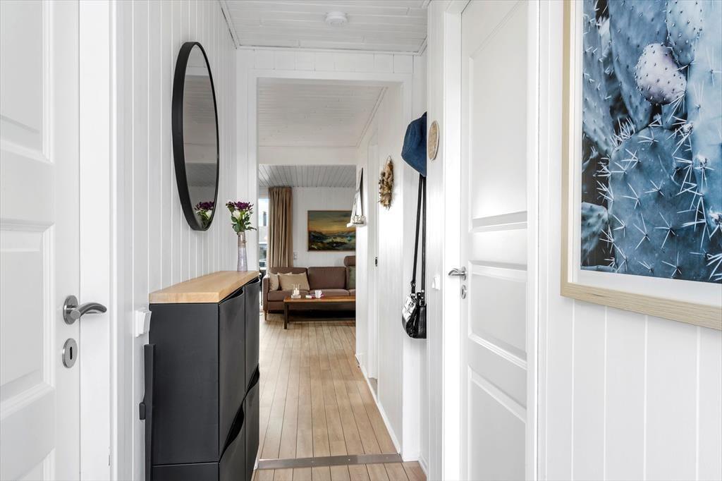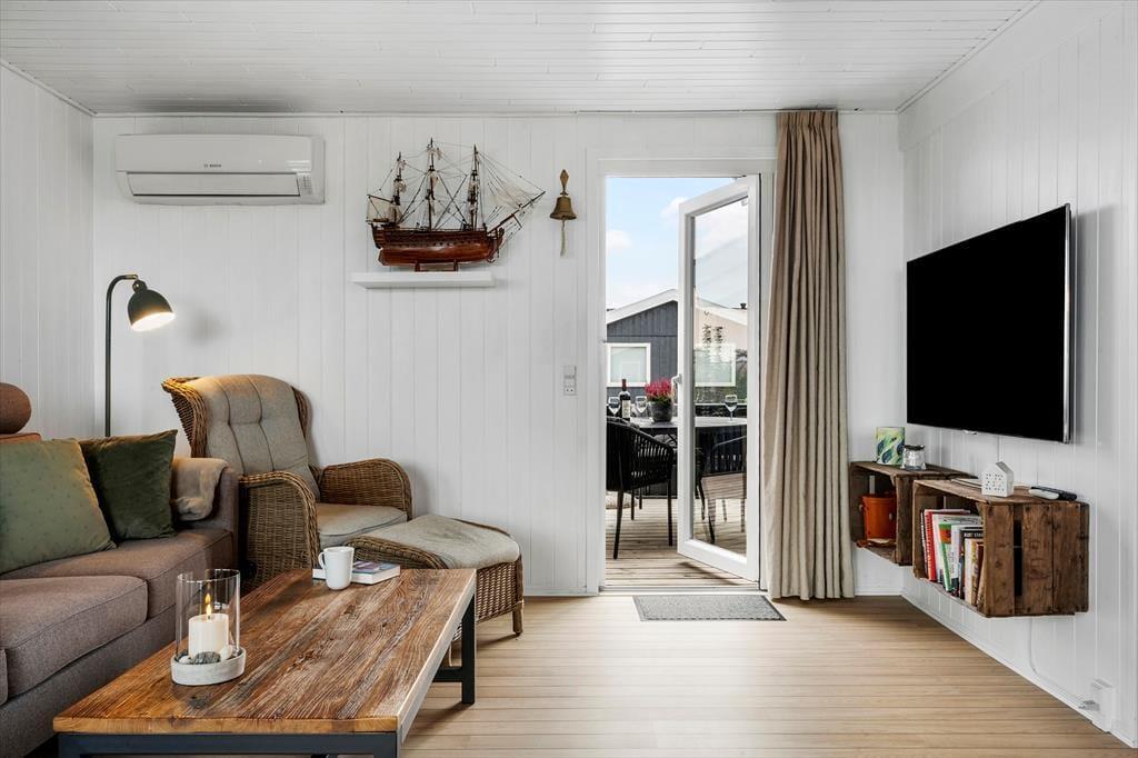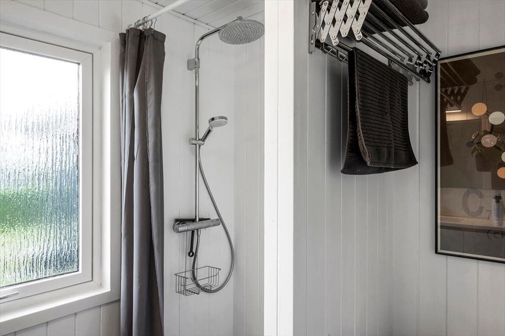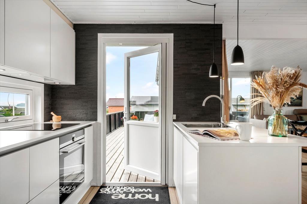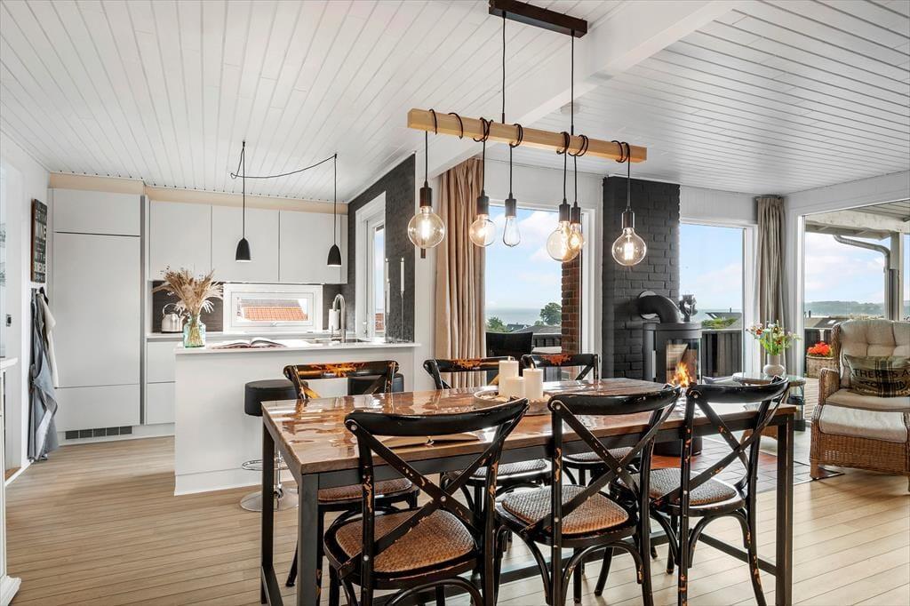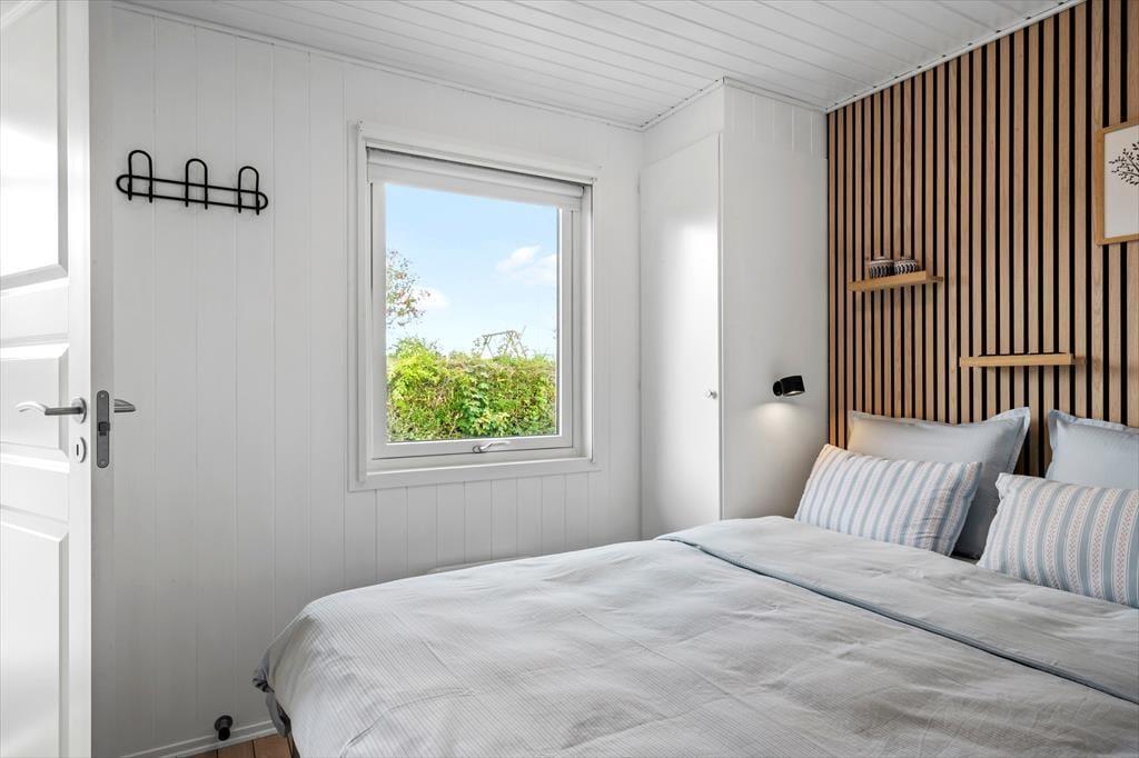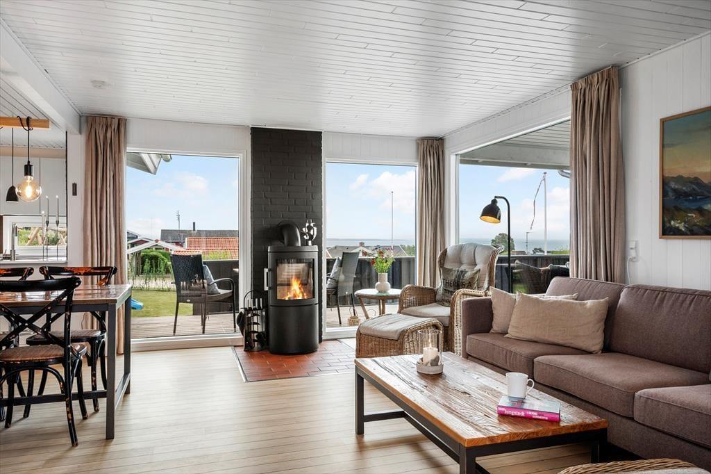Når du træder ind i sommerhuset, mødes du af et lyst og indbydende opholdsrum, hvor køkken og stue smelter harmonisk sammen i ét åbent rum. Her er der tænkt på både æstetik og funktionalitet, så du hurtigt føler dig hjemme. De store vinduespartier trækker lyset ind og giver dig kig til haven og det omkringliggende landskab – og i horisonten skimter du det blå vand. Indretningen er moderne og velafstemt, og de fine detaljer i huset skaber en varm og imødekommende stemning. Her kan I samles til fælles madlavning, hyggelige måltider og lange aftener med spil og snak – alt sammen i rammer, der inviterer til nærvær. Soveværelserne er rolige og rare, og badeværelset fremstår lyst og velholdt – alt sammen med til at understøtte den afslappede ferieatmosfære.