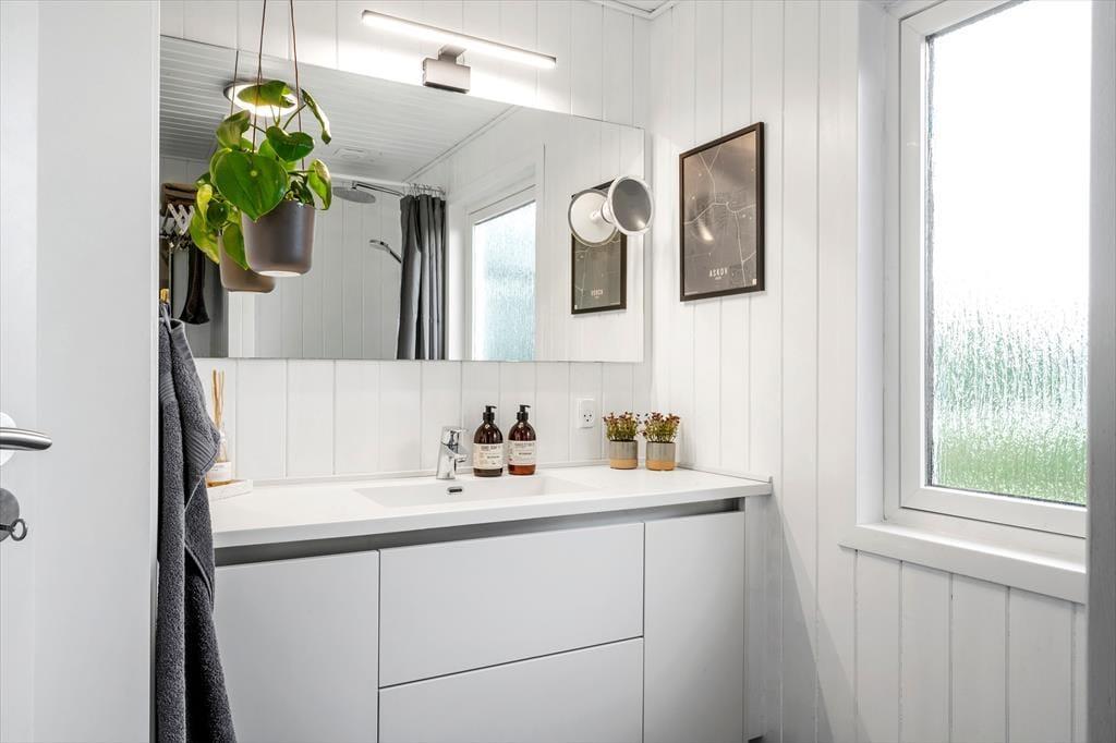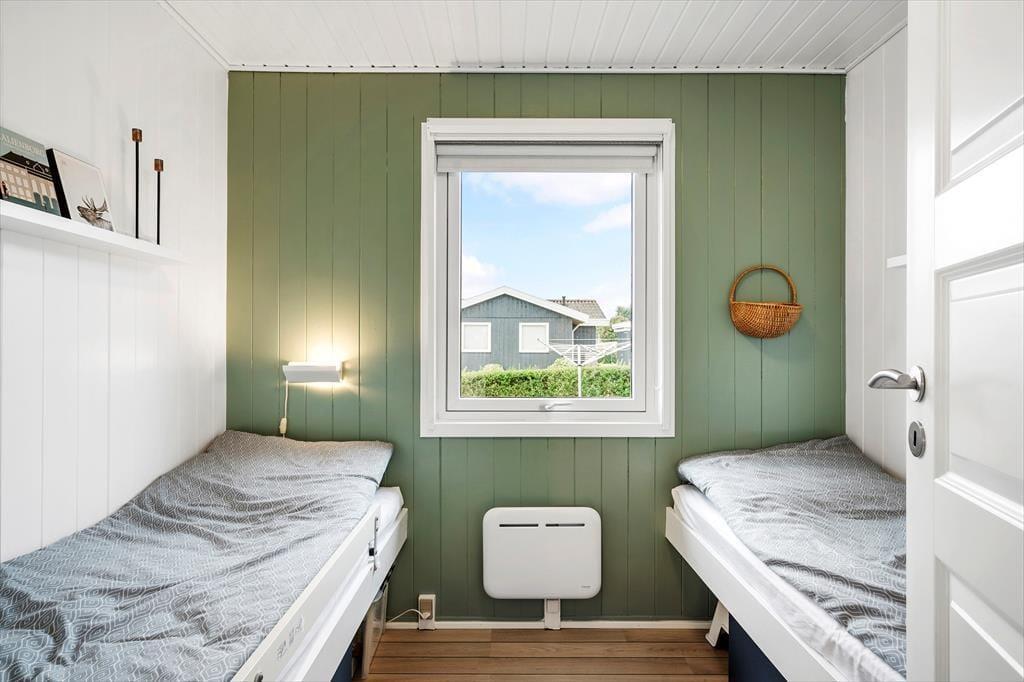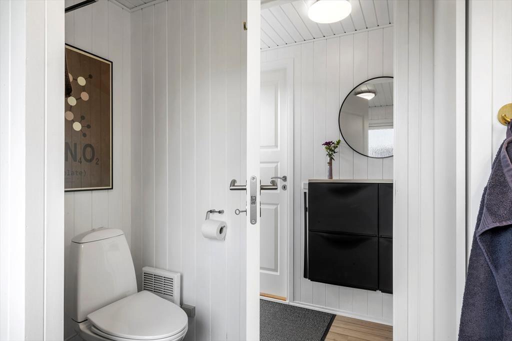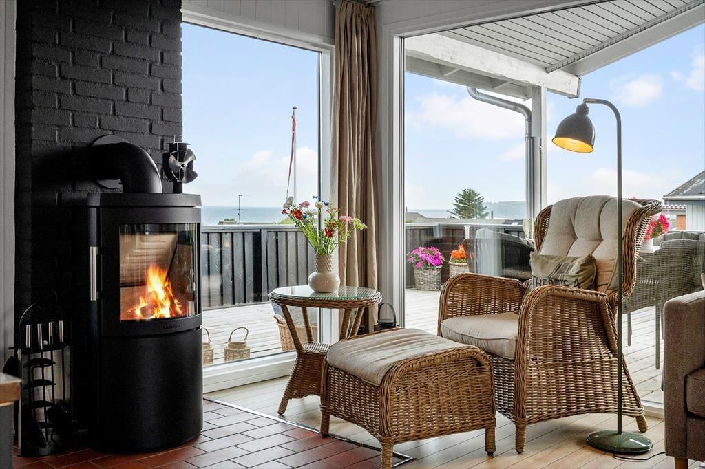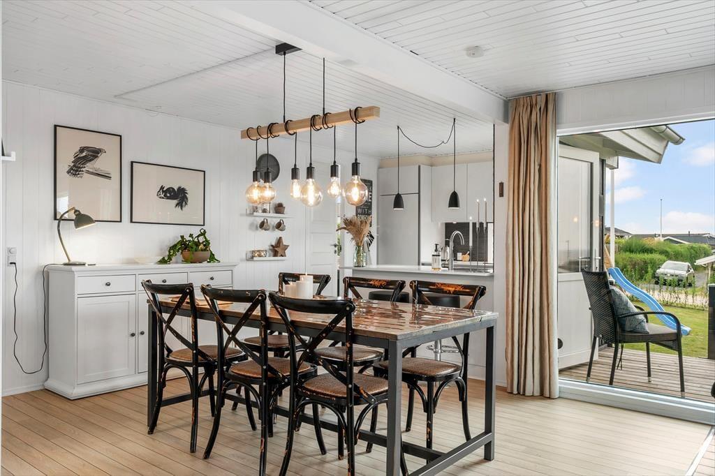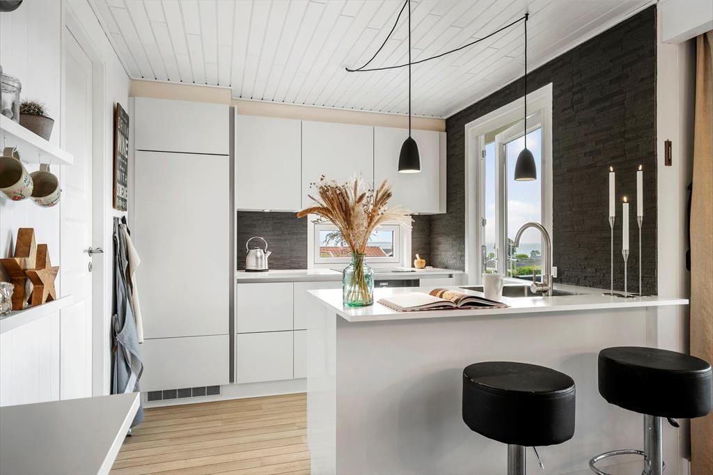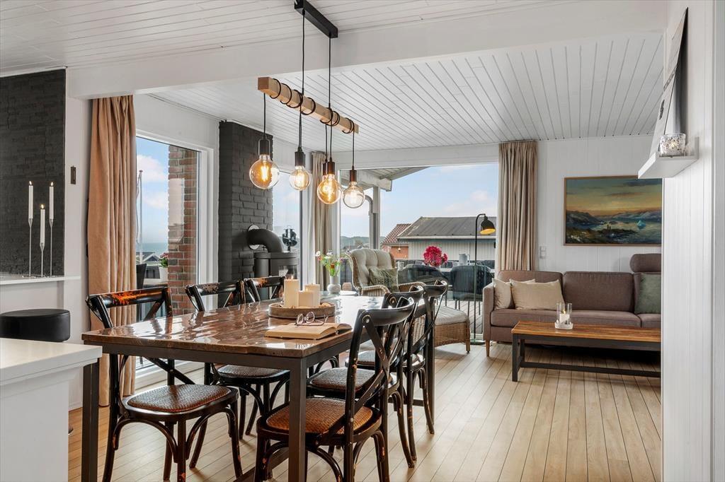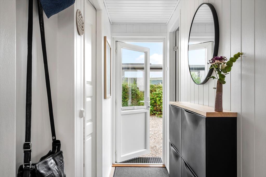 Når du træder ind i sommerhuset, mødes du af et lyst og indbydende opholdsrum, hvor køkken og stue smelter harmonisk sammen i ét åbent rum. Her er der tænkt på både æstetik og funktionalitet, så du hurtigt føler dig hjemme. De store vinduespartier trækker lyset ind og giver dig kig til haven og det omkringliggende landskab – og i horisonten skimter du det blå vand. Indretningen er moderne og velafstemt, og de fine detaljer i huset skaber en varm og imødekommende stemning. Her kan I samles til fælles madlavning, hyggelige måltider og lange aftener med spil og snak – alt sammen i rammer, der inviterer til nærvær. Soveværelserne er rolige og rare, og badeværelset fremstår lyst og velholdt – alt sammen med til at understøtte den afslappede ferieatmosfære.