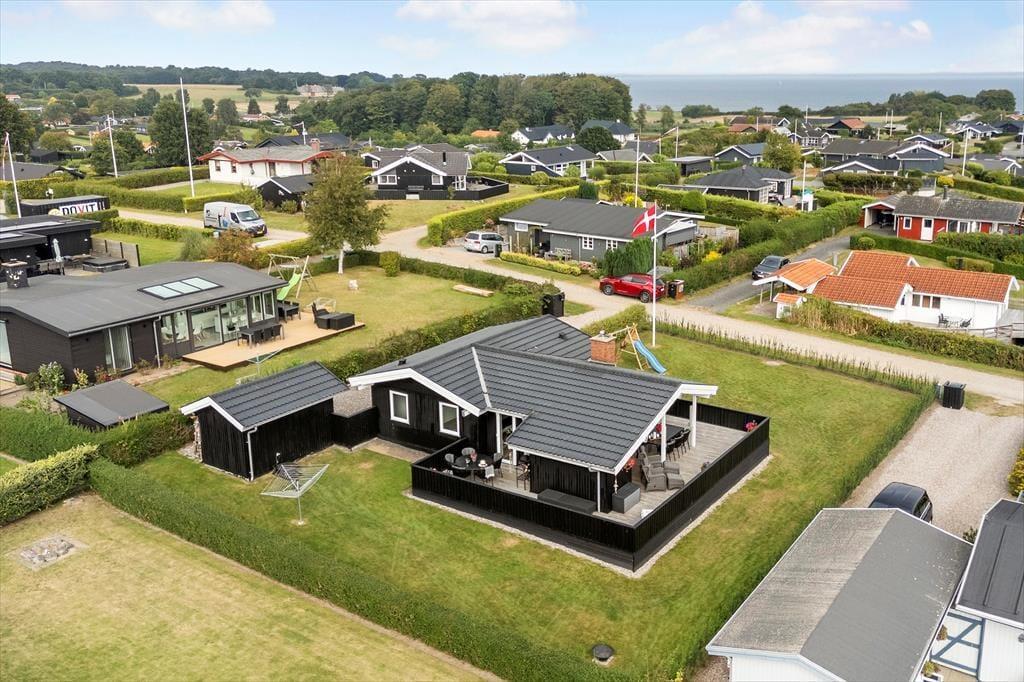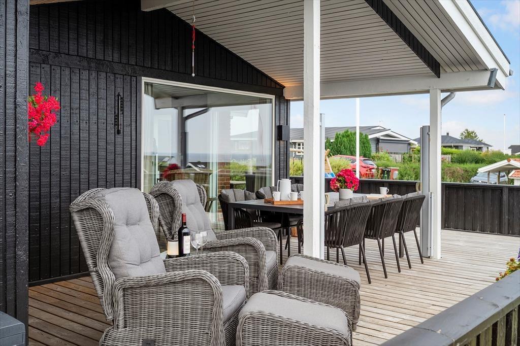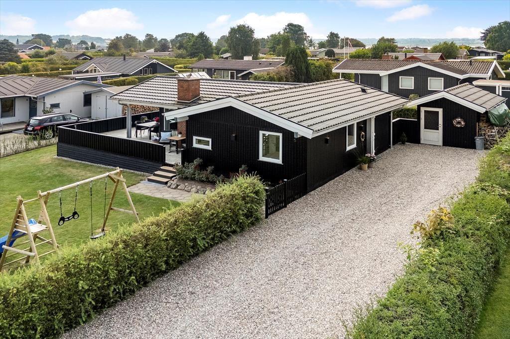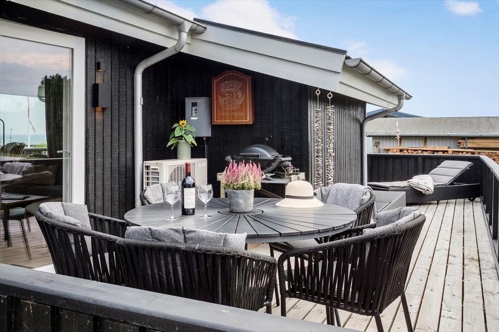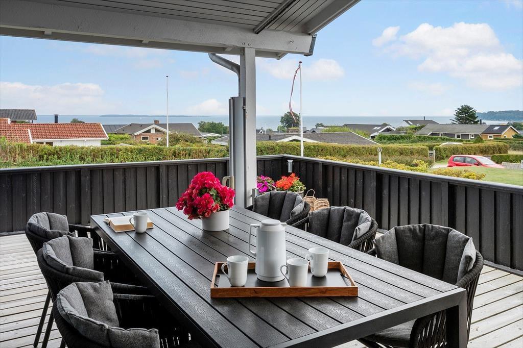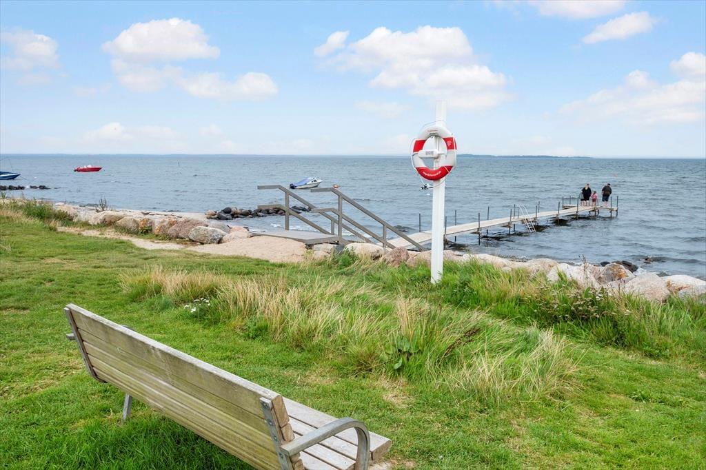 Udenfor fortsætter den afslappede stemning. Den store terrasse omkranser huset og giver dig både sol og skygge dagen igennem. Her kan du nyde morgenkaffen med udsigt til vandet eller samle hele familien til grill og aftenhygge under åben himmel. Havemøblerne inviterer til ren afslapning, og det føles helt naturligt at læne sig tilbage og lytte til fuglesangen fra de omkringliggende træer. Haven er både grøn og indbydende – og her er god plads til leg og bevægelse for familiens yngste, som helt sikkert vil finde glæde i rutsjebanen. Uanset om du søger ro i solen med en bog, eller om børnene skal aktiveres, rummer udeområdet alle muligheder for kvalitetstid i det fri.