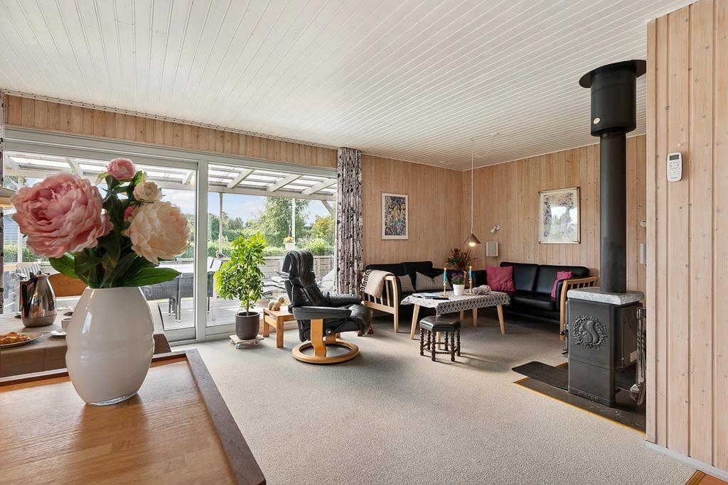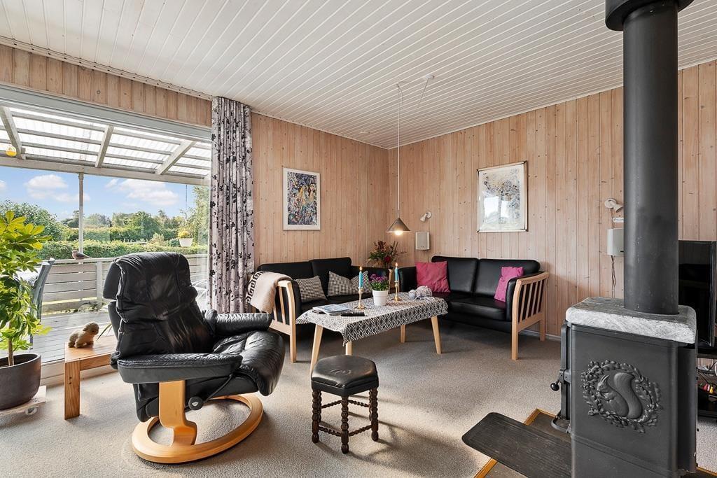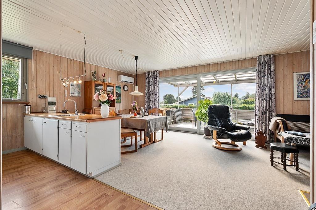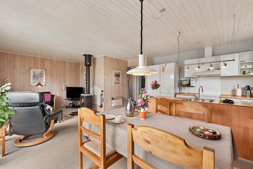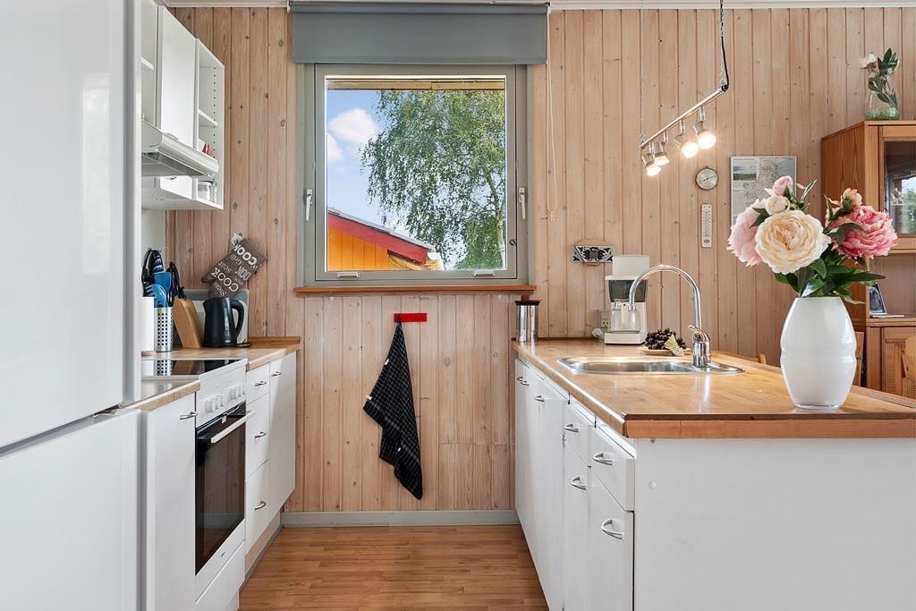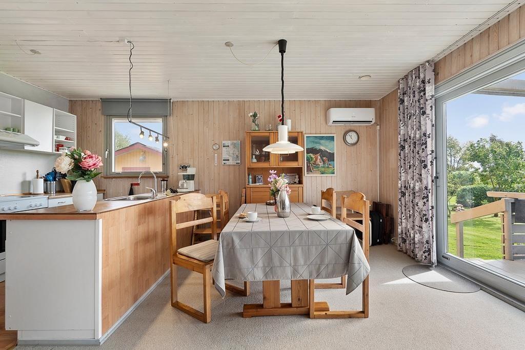 Når du træder indenfor i dette sommerhus, bliver du mødt af en lys og imødekommende atmosfære, hvor køkken og stue er forbundet i ét stort, åbent rum. Her kan du nemt samle hele familien om fælles måltider eller lade samtalerne flyde, mens du nyder en stille stund i sofaen. De store vinduespartier trækker lyset ind i stuen og giver et naturligt kig ud til den grønne have, som bidrager til en fornemmelse af nærhed til naturen – selv når du er indendørs. Indretningen er hyggelig og funktionel, hvilket gør det nemt at føle sig hjemme fra første øjeblik.