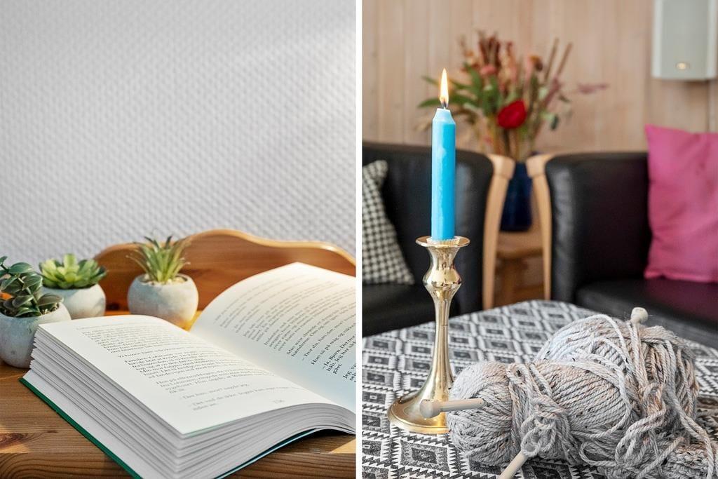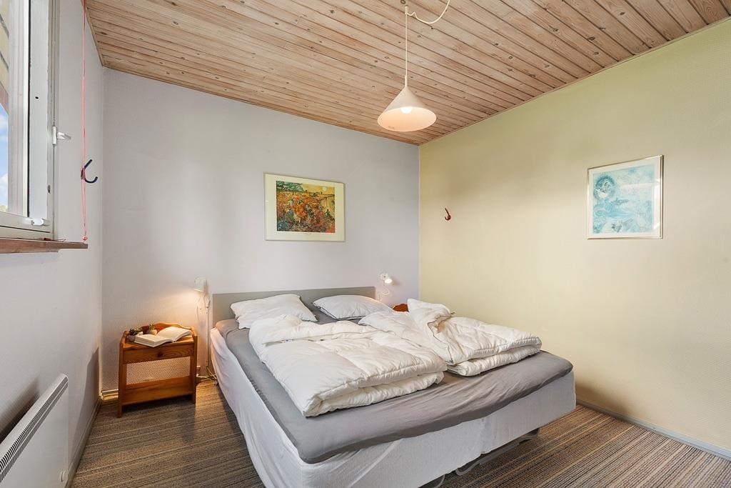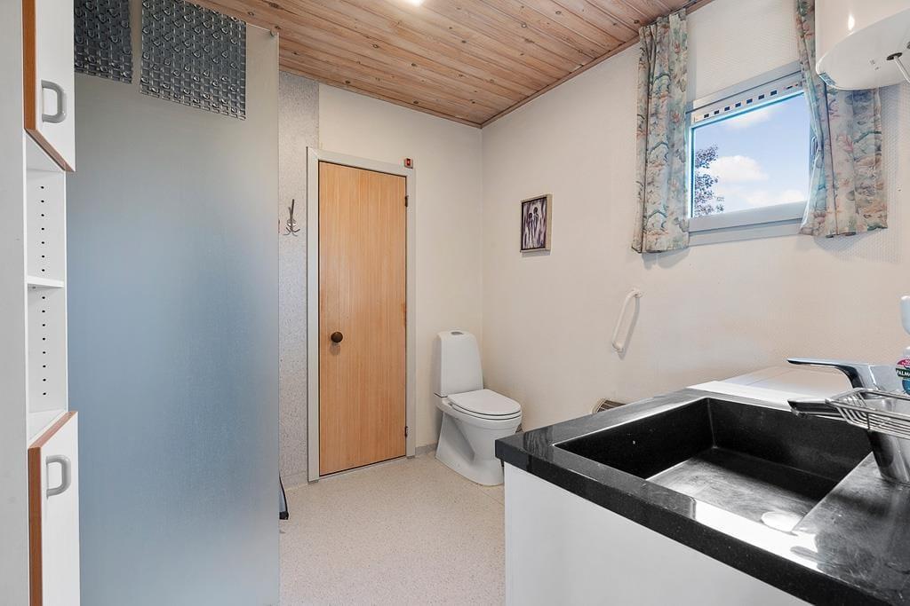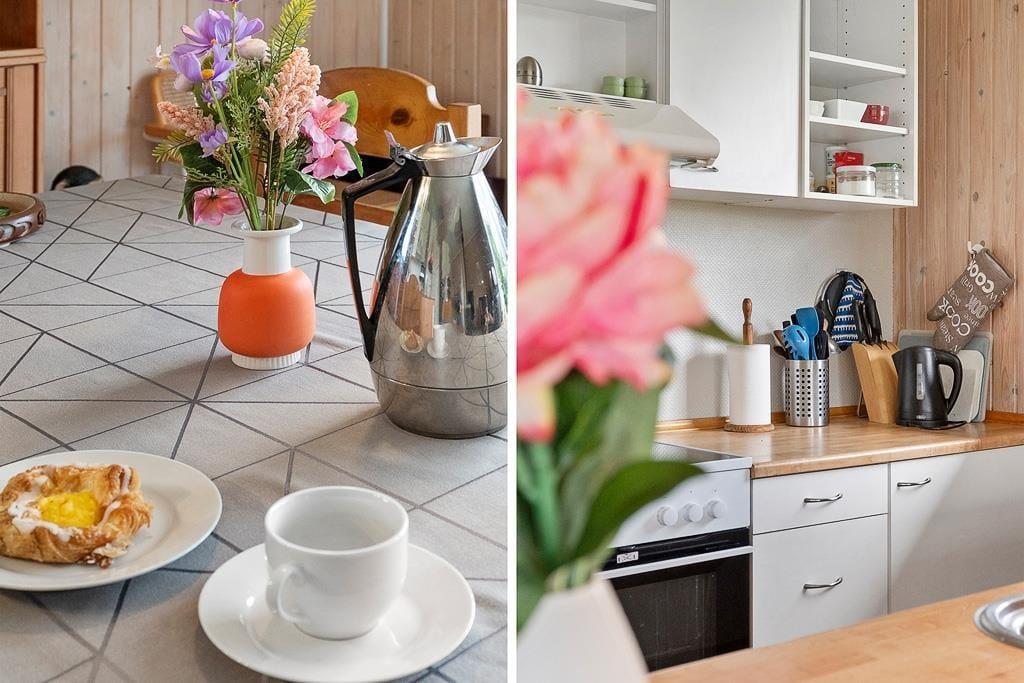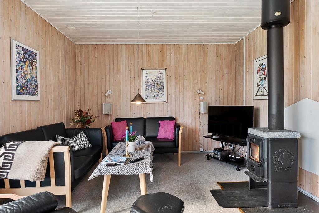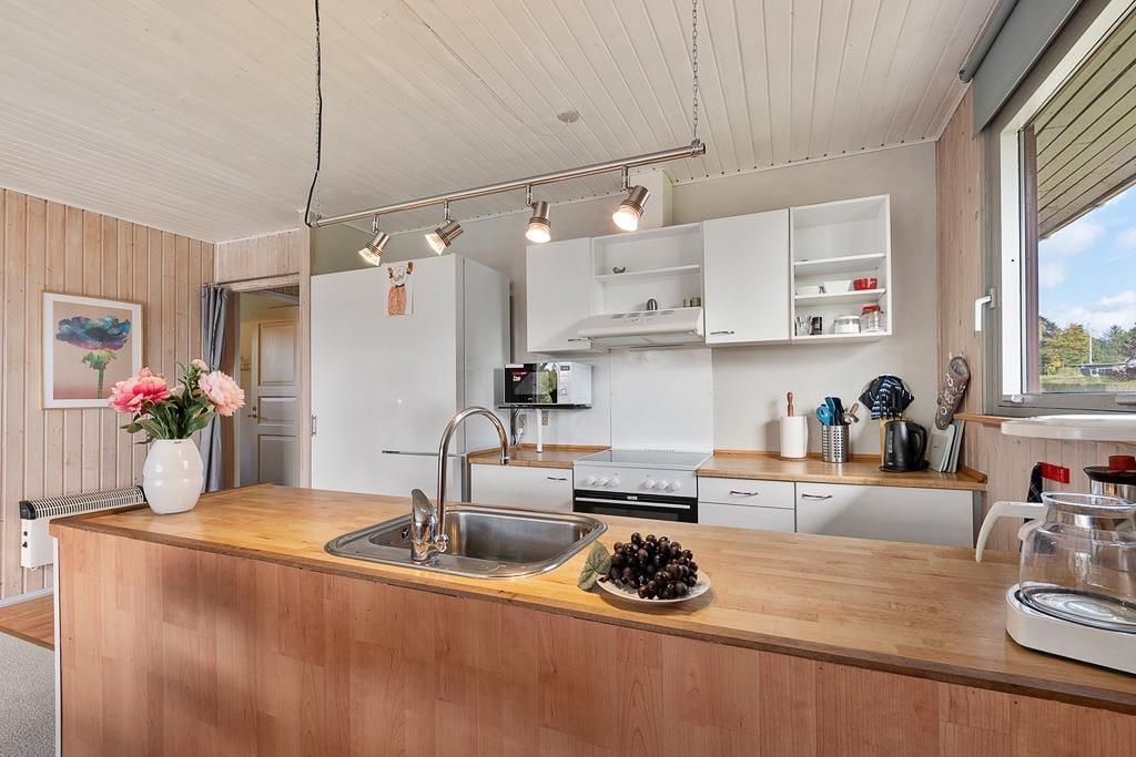 Når du træder indenfor i dette sommerhus, bliver du mødt af en lys og imødekommende atmosfære, hvor køkken og stue er forbundet i ét stort, åbent rum. Her kan du nemt samle hele familien om fælles måltider eller lade samtalerne flyde, mens du nyder en stille stund i sofaen. De store vinduespartier trækker lyset ind i stuen og giver et naturligt kig ud til den grønne have, som bidrager til en fornemmelse af nærhed til naturen – selv når du er indendørs. Indretningen er hyggelig og funktionel, hvilket gør det nemt at føle sig hjemme fra første øjeblik.