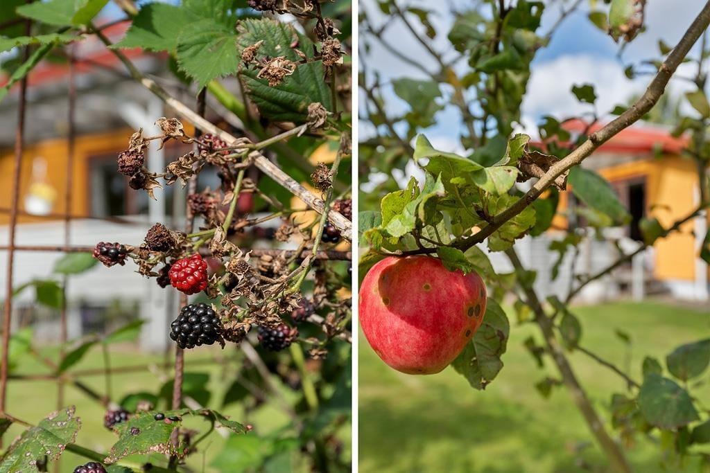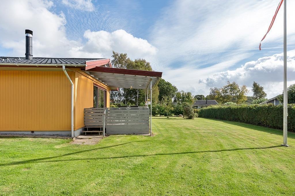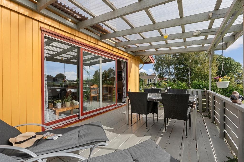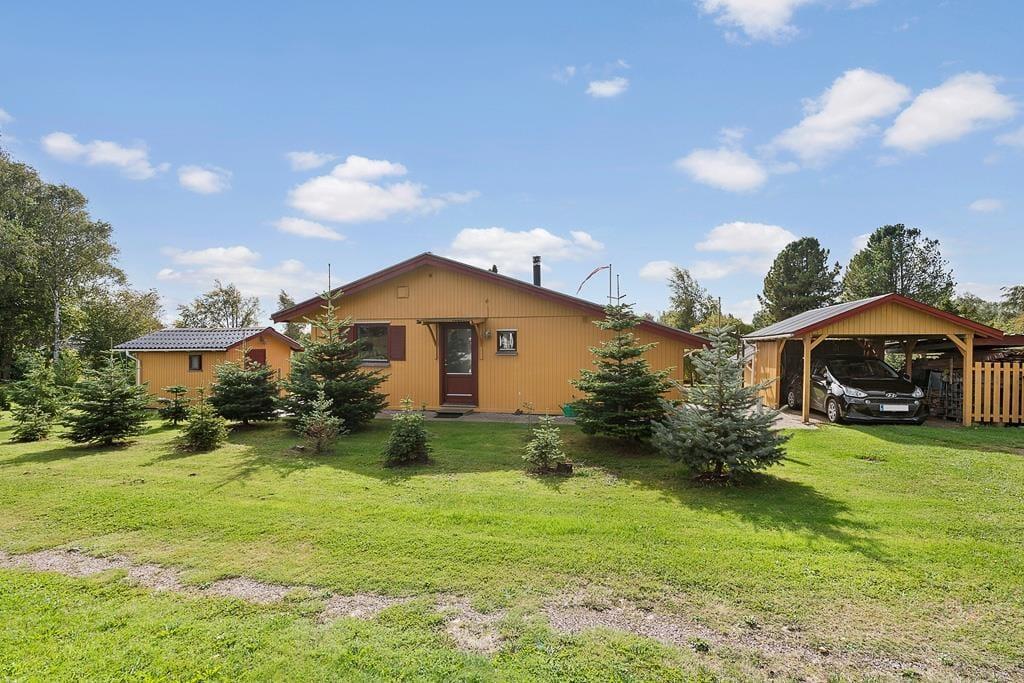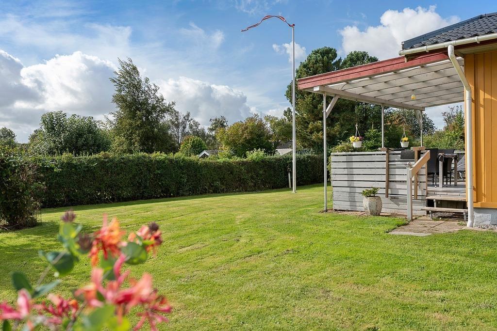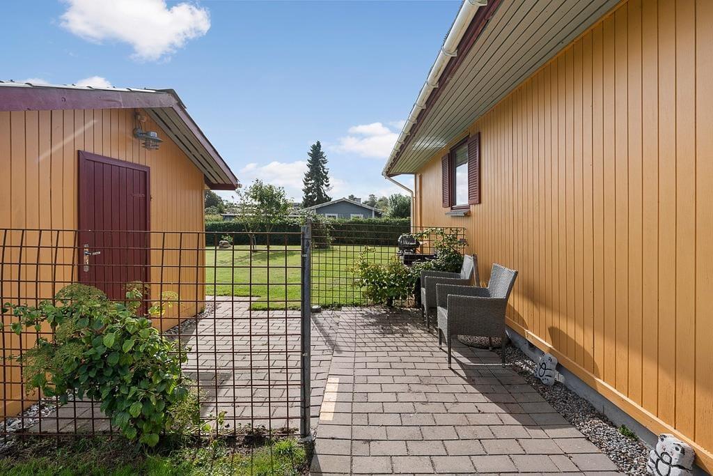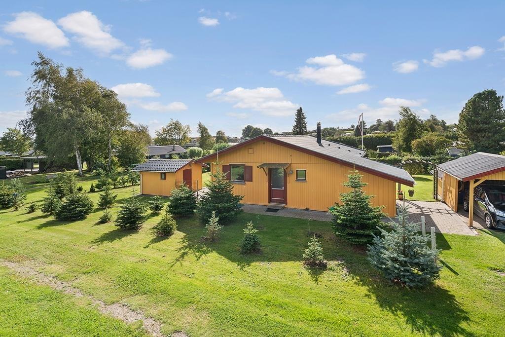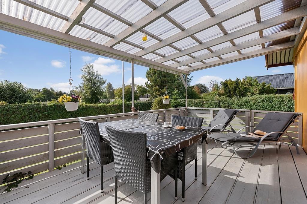 Udenfor venter en skøn have, hvor børnene kan more sig på gyngen eller lege frit på plænen, mens de voksne nyder freden og fuglesangen. Den overdækkede terrasse er et naturligt samlingspunkt til både morgenkaffen og de lange, lyse sommeraftener, hvor grillen kan tændes, og hyggen får lov at brede sig. Huset har desuden en carport, så bilen står i læ, mens du selv kan lade skuldrene falde ned og nyde de rolige omgivelser. Haven rummer både solrige kroge og små læ-steder, hvor du kan trække dig tilbage med en bog eller blot sidde og lytte til naturens egne lyde.