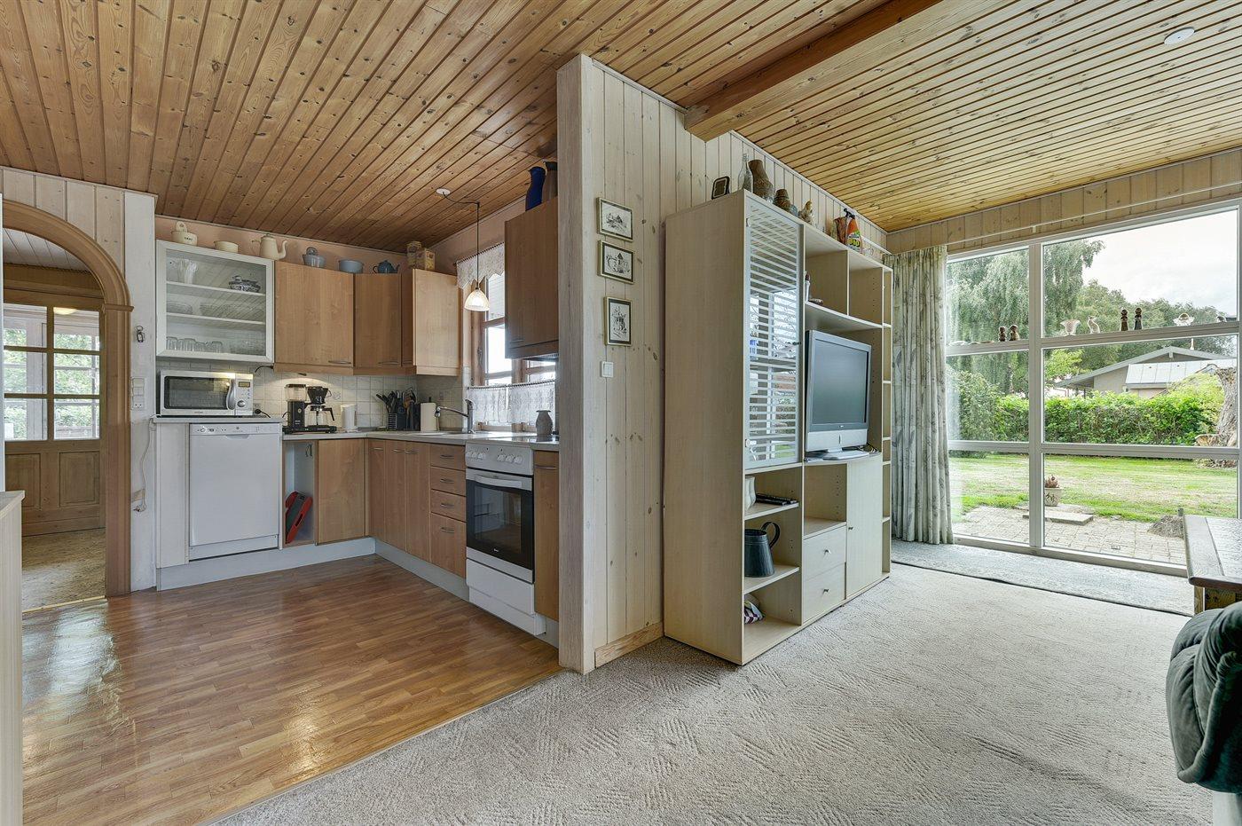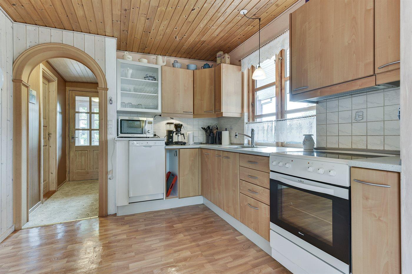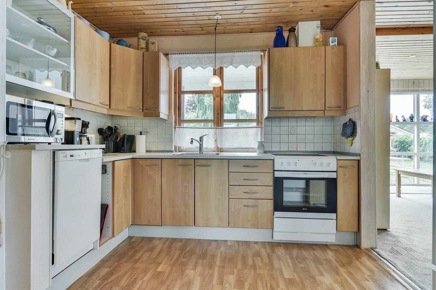 Køkkenet er udstyret med 1 køleskab. Der er 4 keramiske kogeplader, bageovn, mikrobølgeovn samt opvaskemaskine.