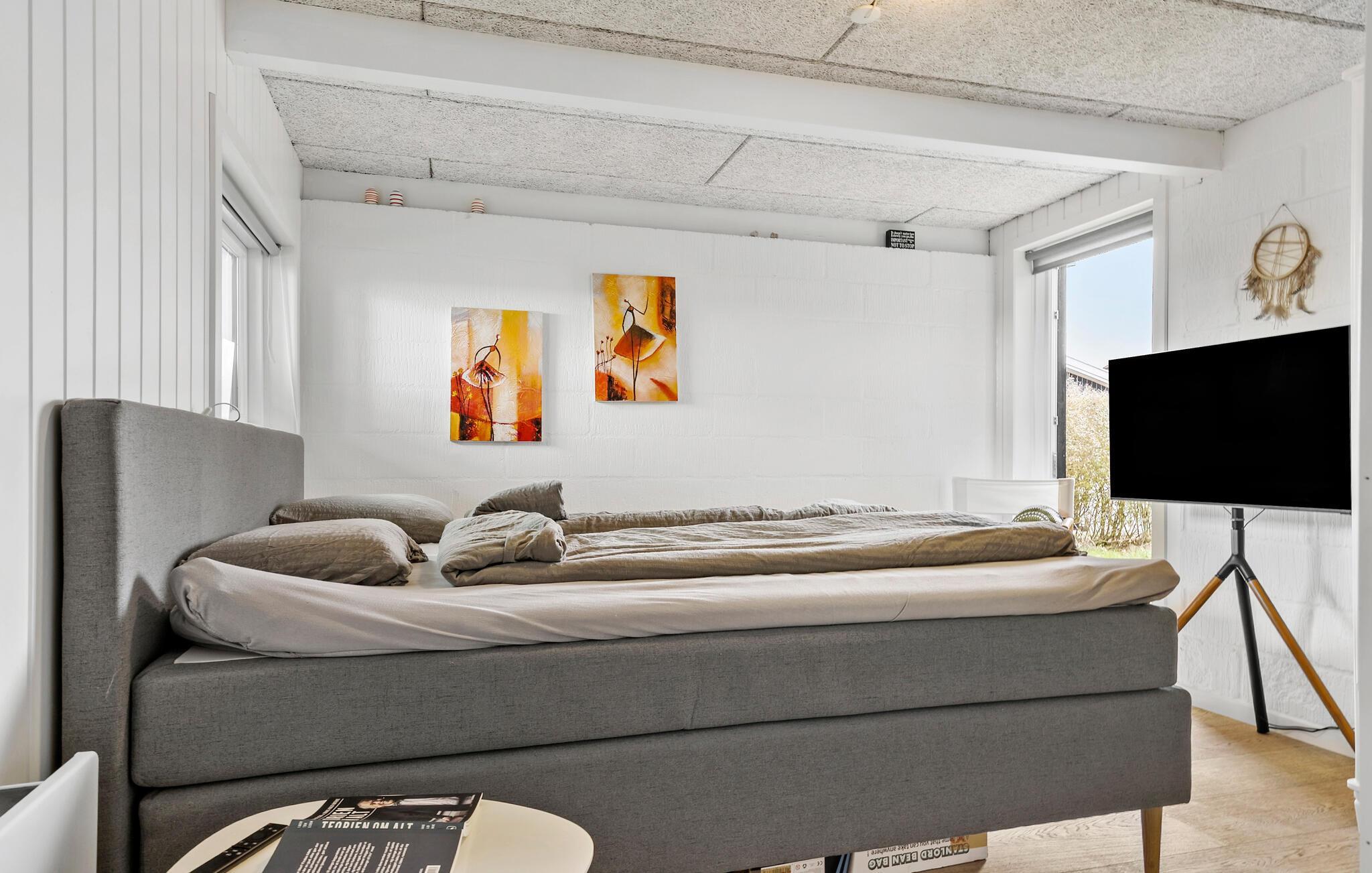 Tilbring en afslappende familieferie i dette moderne feriehus, nogle få skridt fra havet. Den lyse opholdsstue med store panoramavinduer giver jer en vid udsigt over Sandvig Bugt. Slap af i det hyggelige sofahjørne, se en film sammen eller spil brætspil. I det åbne, rummelige køkken kan I lave mad sammen på en afslappet måde, mens alle samles ved det store spisebord for at spise, snakke eller planlægge dagen efter. En sauna er også tilgængelig for yderligere afslapning.