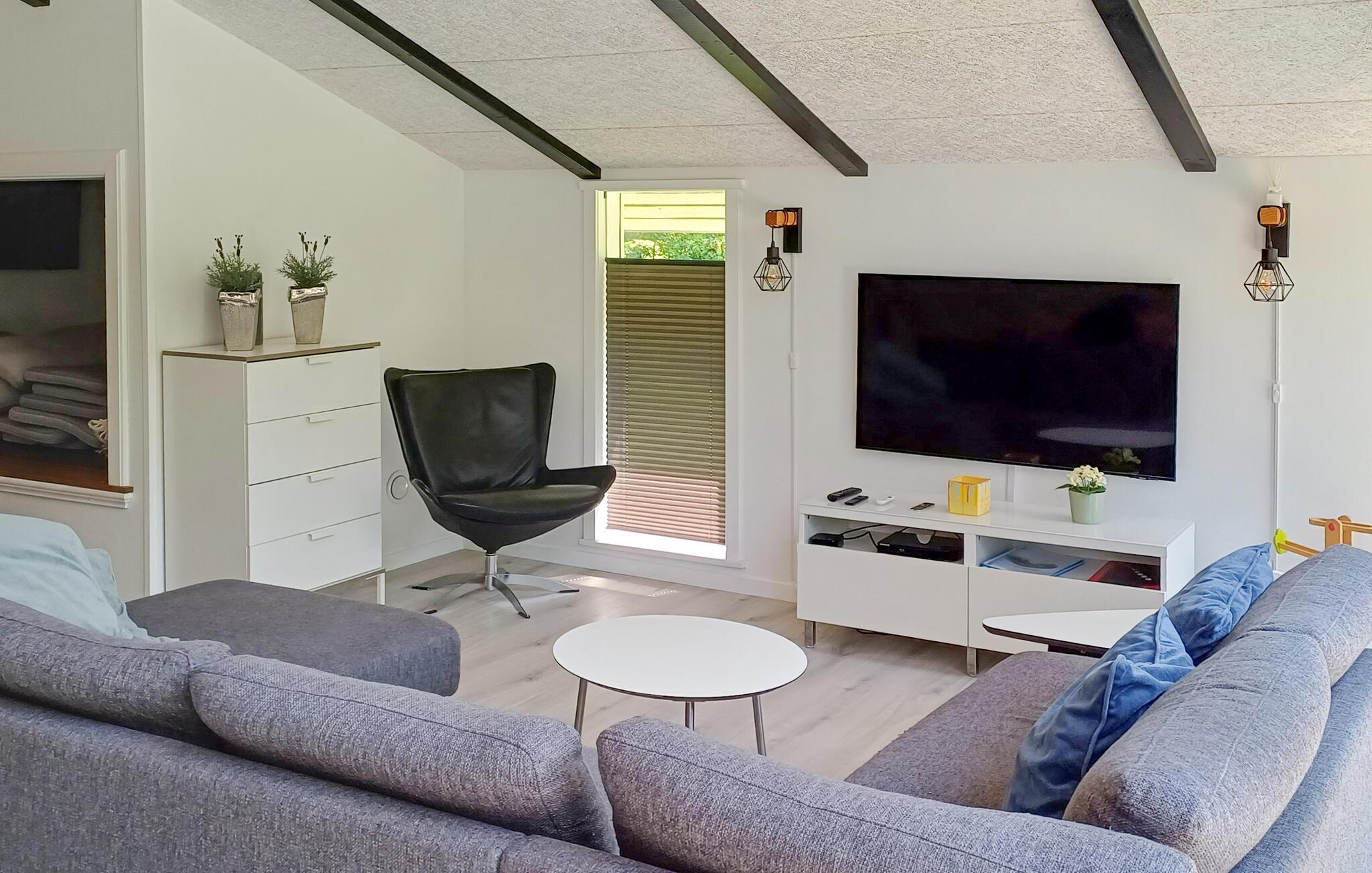 Husets hjerte er den store stue med en åben forbindelse til køkkenet, hvorfra man har adgang til terrassen med det smukke vildmarksbad. Huset er lyst og pænt dekoreret og takket være de store vinduer i stuen kan I nyde naturen selv når I er inde i huset. På dage, hvor vejret driller, kan I tilbringe tiden med en knitrende ild brændeovnen.