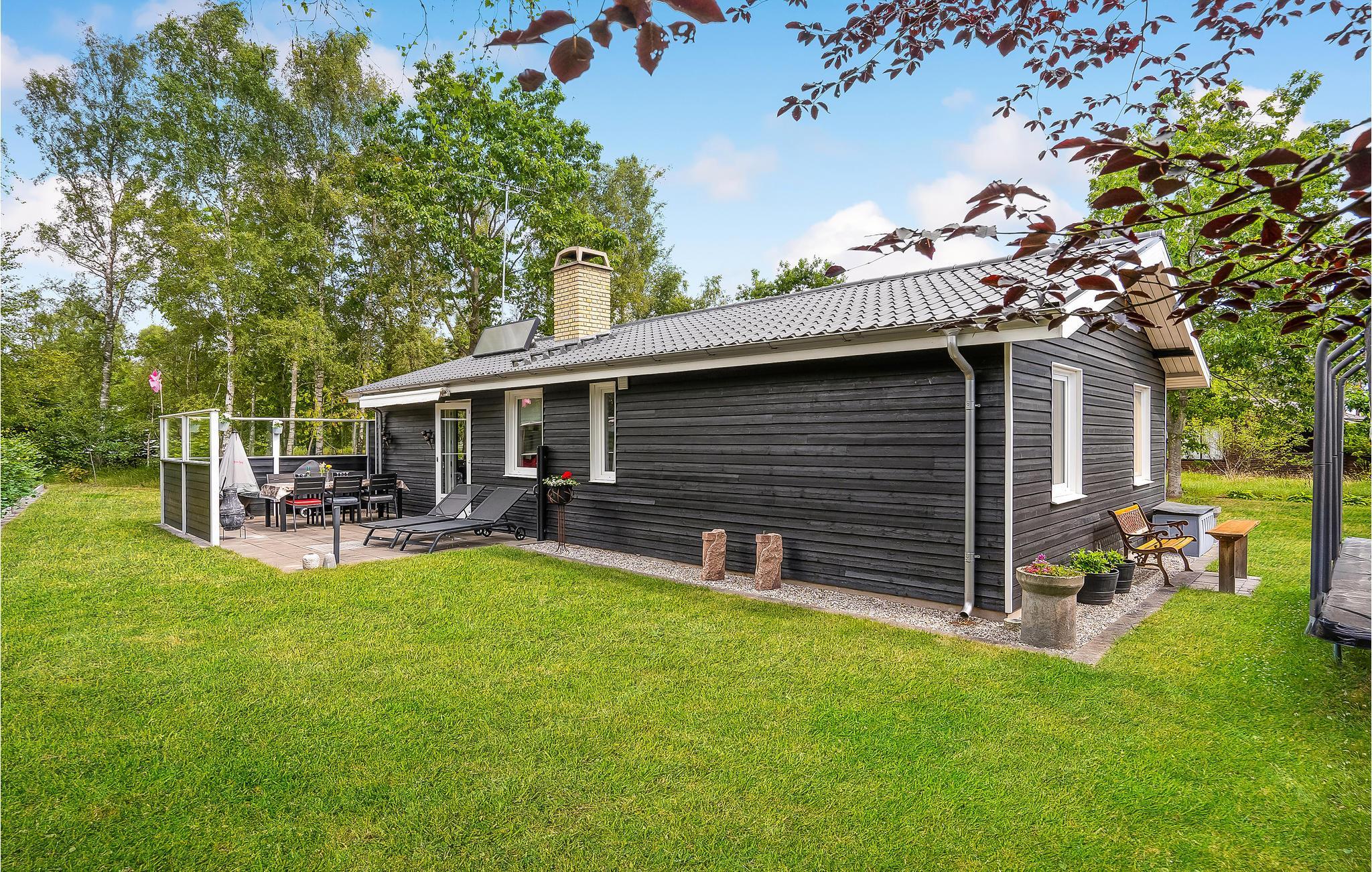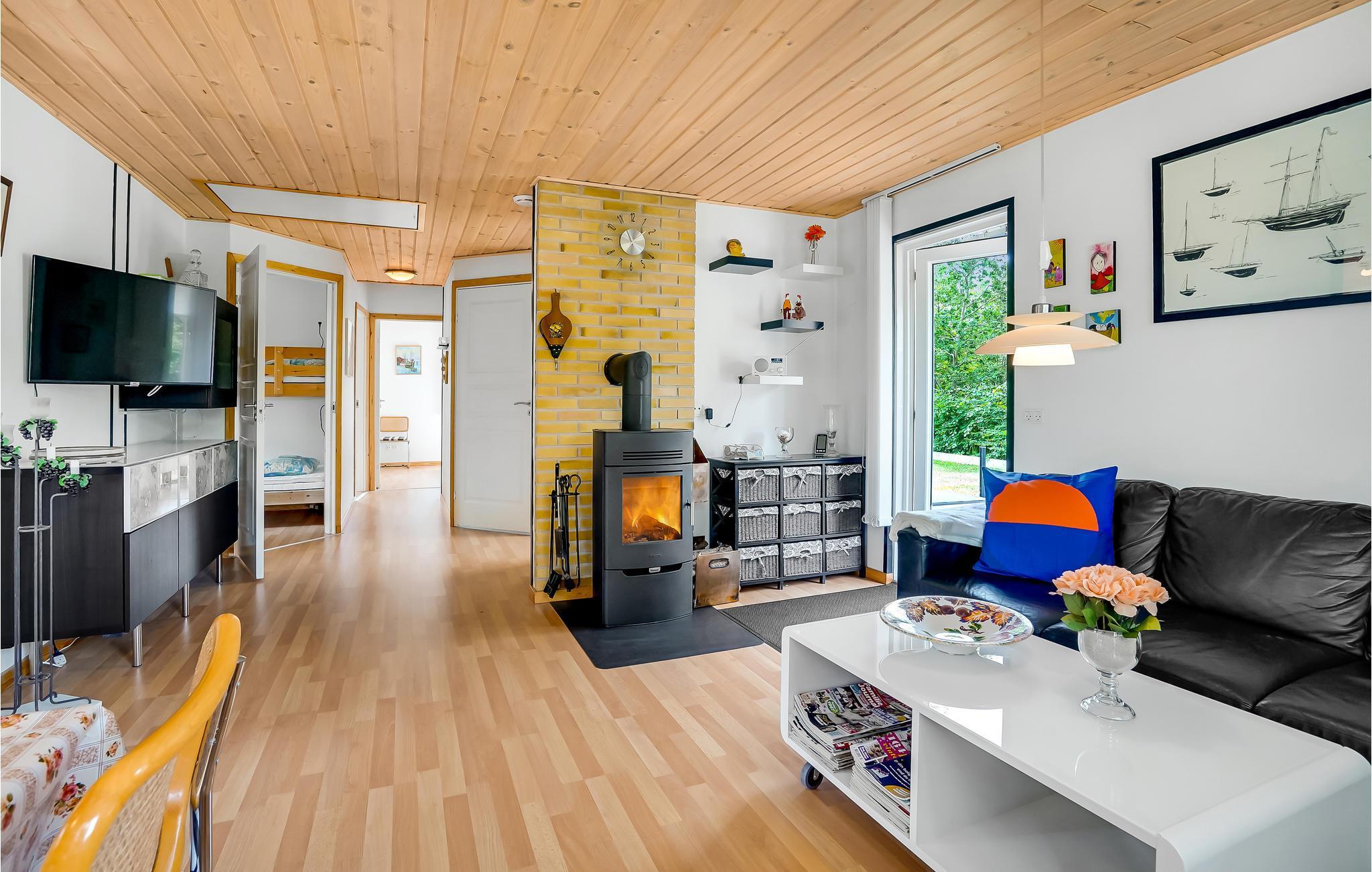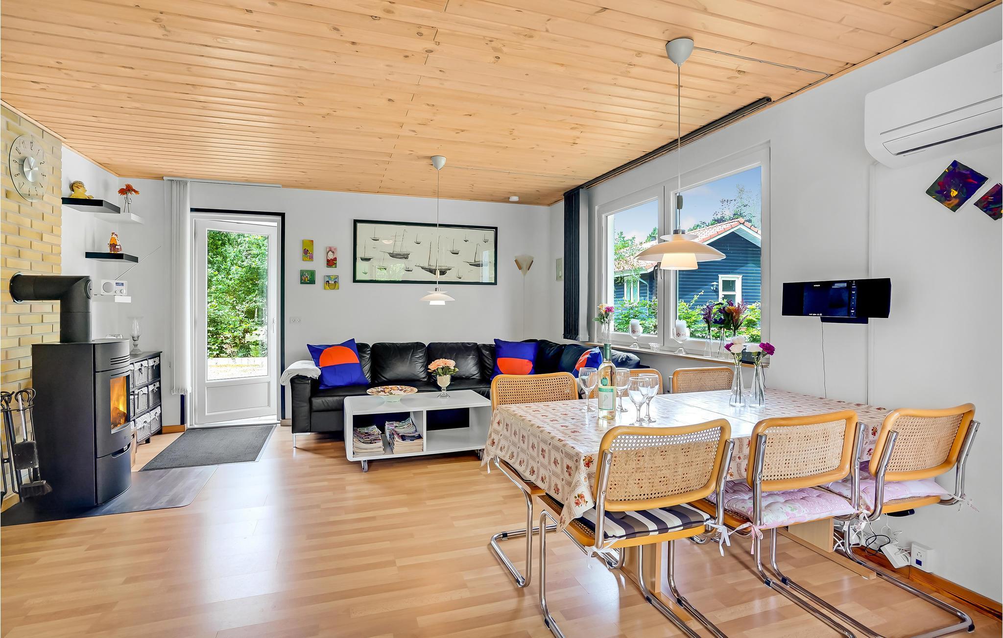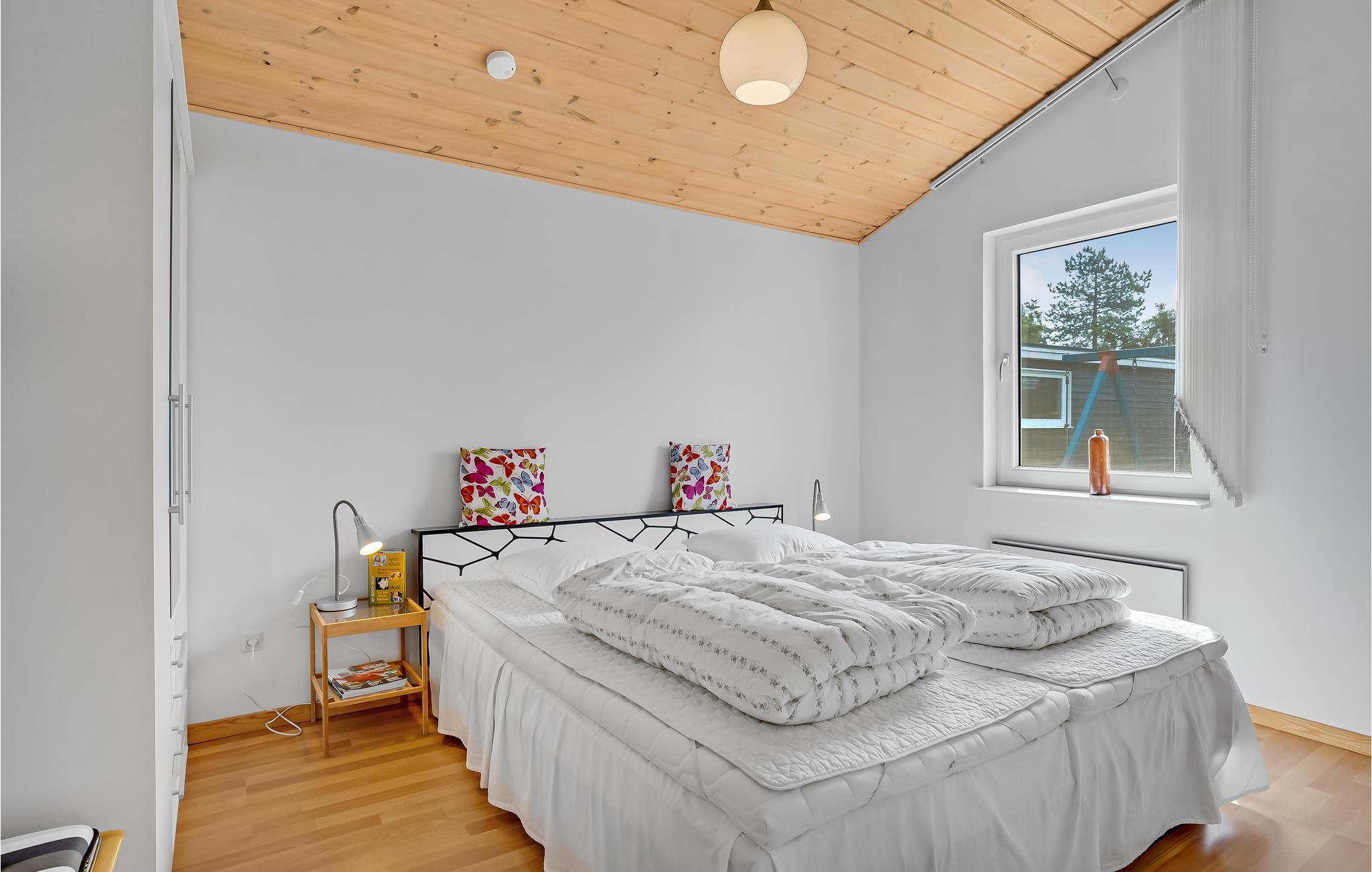 Dette hus har tre soveværelser, så her kan I være seks personer. Vinduerne lukker masser af dagslys ind i huset og en smuk udsigt til haven. På kølige dage kan I sætte jer godt til rette i stuen og lytte til ilden, der knitrer i brændeovnen. Brænde kan købes på stedet.
