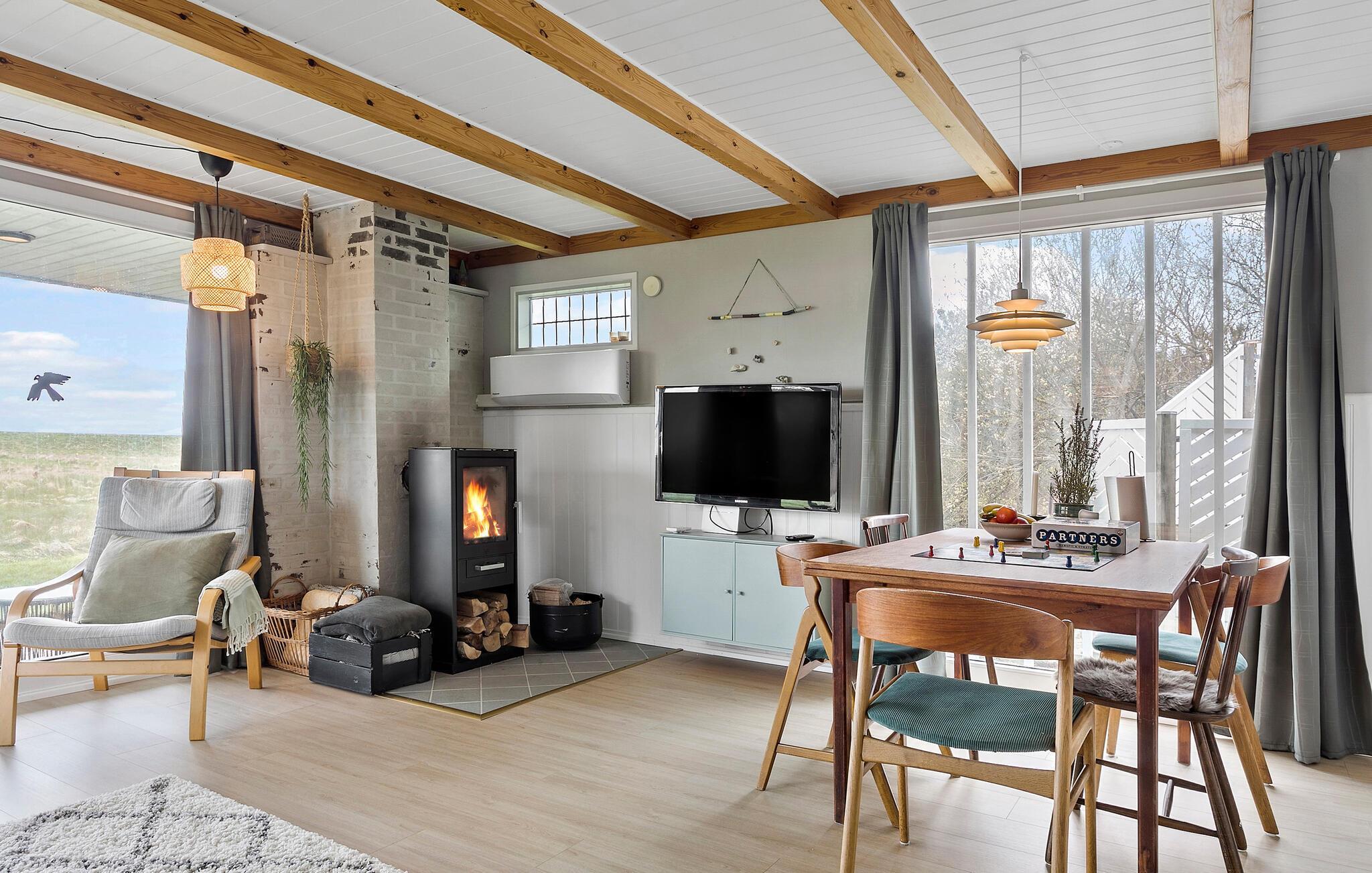 Hvis I er på udkig efter en feriebolig, der emmer af fred, ro og ligger i naturskønne omgivelser, er dette indbydende hus ved Helligsø Strand det helt rette valg. Huset er nydeligt indrettet med åben stue, træbjælker og delvist fritlagte murværk, der giver det indre et varmt udtryk og gør det nemt at sænke skuldrene. Tænd op i brændeovnen på de køligere dage og nyd dens varme knitren, mens I hygger med madlavningen eller brætspillene til langt ud på aftenen.