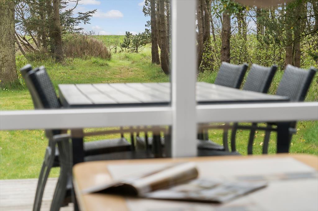 Huset ligger på en 2701 m2 stor og ugeneret naturgrund, som går helt ned til stranden. Petanquebane på friarealet syd for huset. På nordsiden af huset kan bilen stå parkeret i carporten, mens I formentlig mest vil opholde jer på sydsiden, for her er der anlagt en stor, hævet og delvist overdækket træterrasse. Den nybyggede terrasse er et skønt sted at nyde solen og det langsomme ferietempo med få planer. Hvis I har lyst, kan I grille og dække op ved spisebordet, eller også kan I bare læne jer tilbage i liggestolene.