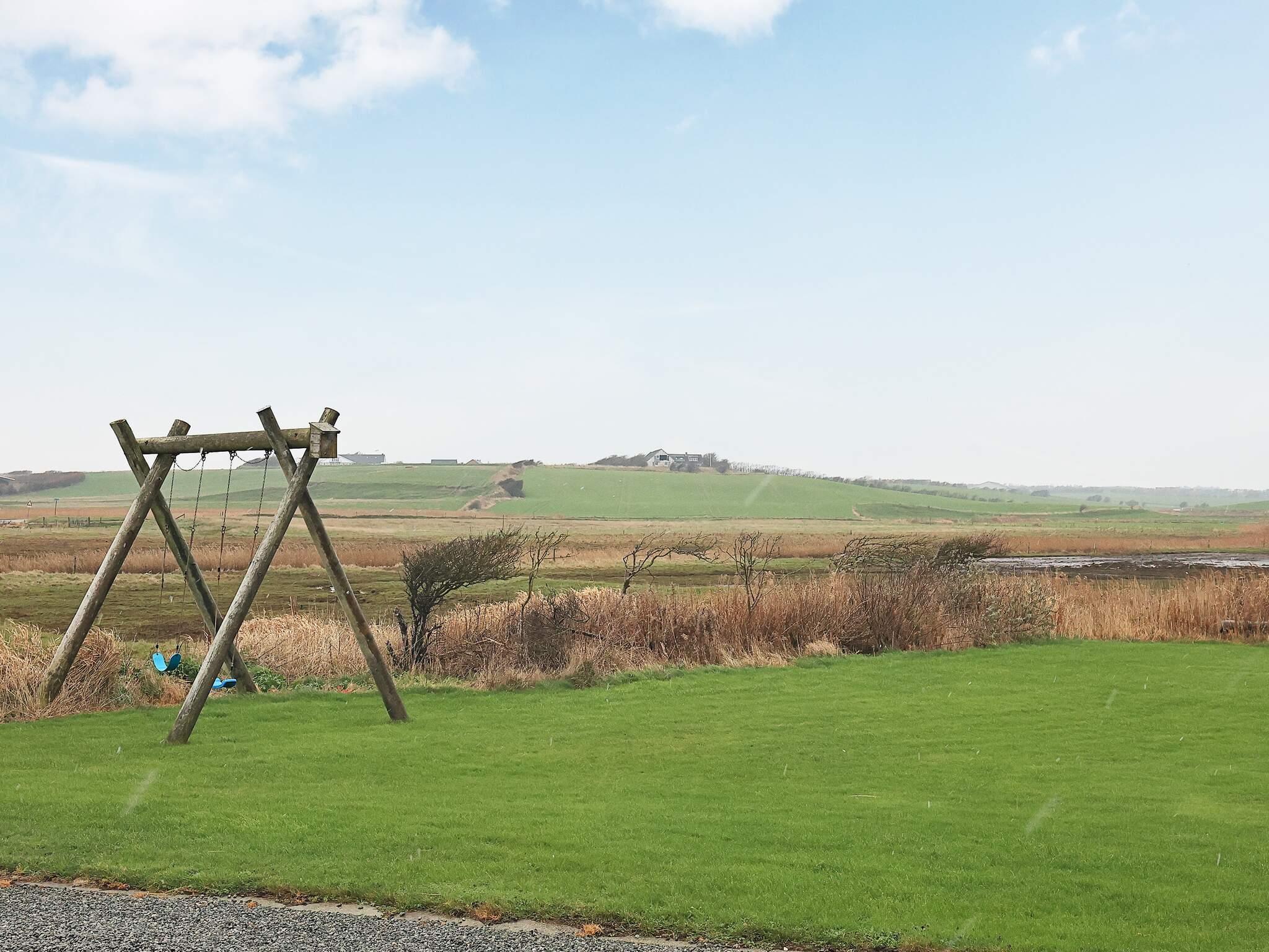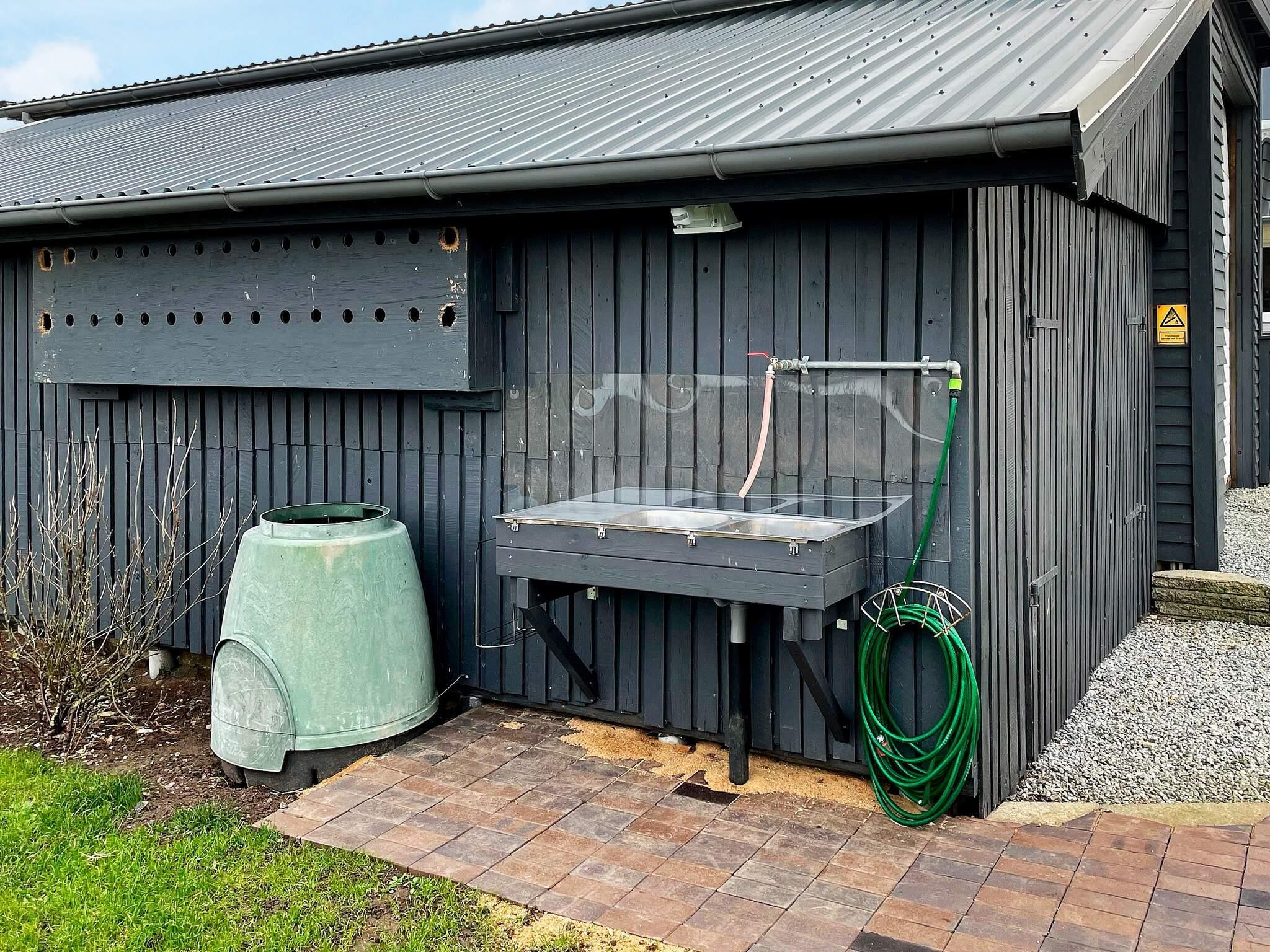 Der er åbne terrasser med havemøbler samt grill. Bag ved garagen kan det rige dyreliv opleves på bænk og solopgang. Ved siden af vildmarksbadet er der fra endnu en bænk med udsigt ud over landskabet og fjorden. Haven bagved huset er der at finde en stor græsplæne med gynger og mulighed for boldspil. Foran huset er græsplænen indhegnet, velegnet til små børn og hunde.
