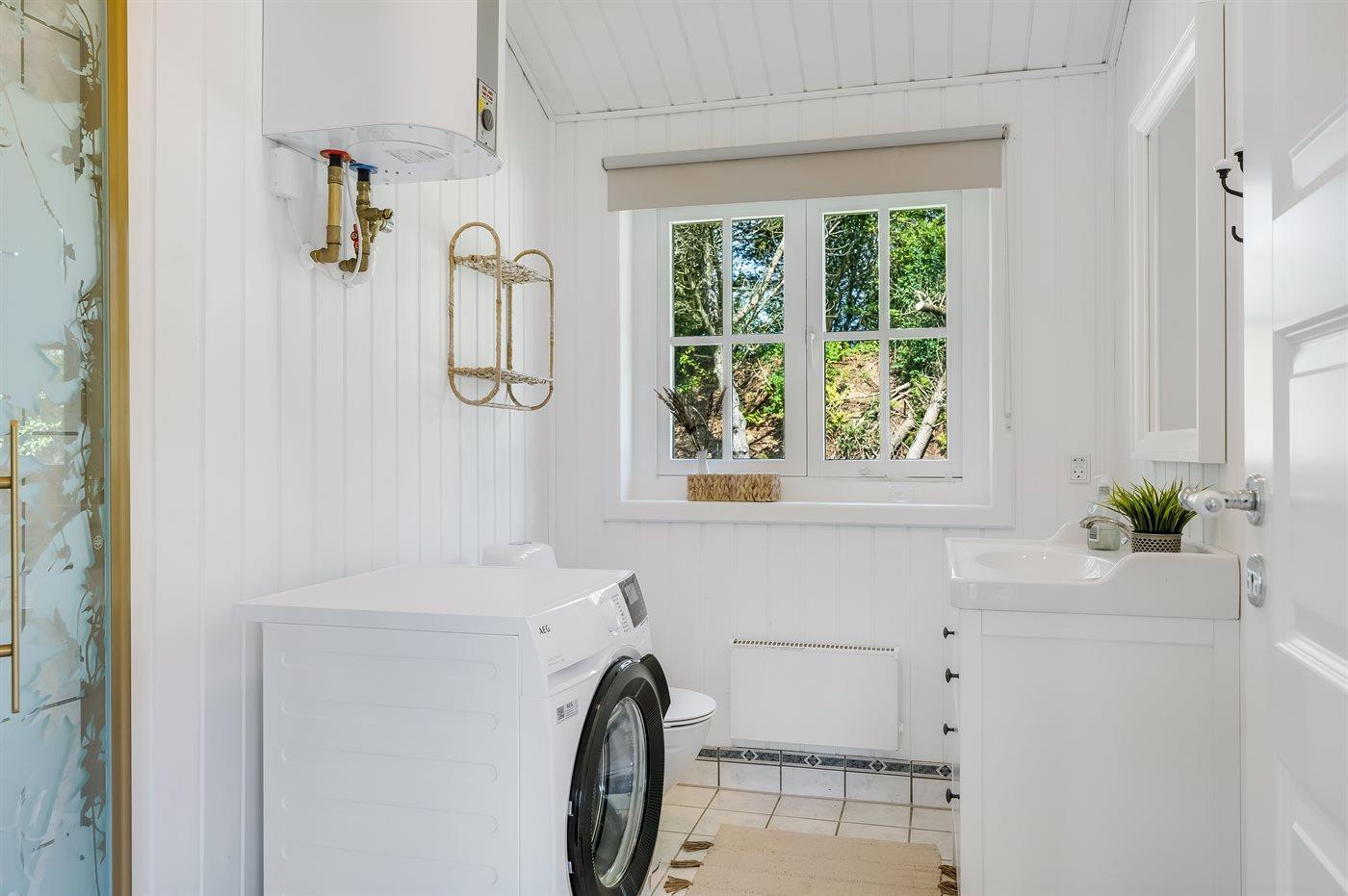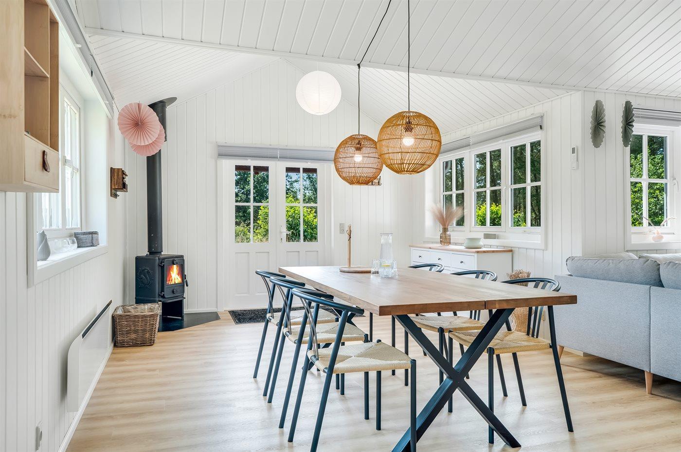 Nyligt renoveret sommerhus i skov nær fjord med moderne faciliteter og plads til 5 personer.