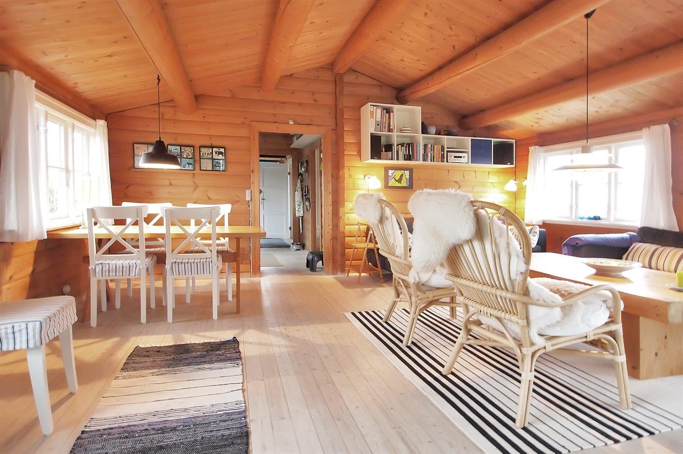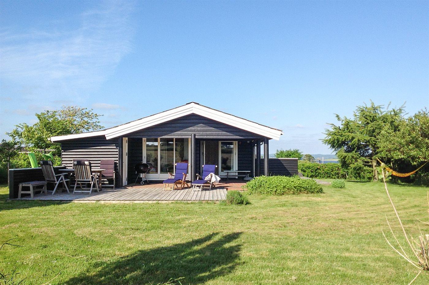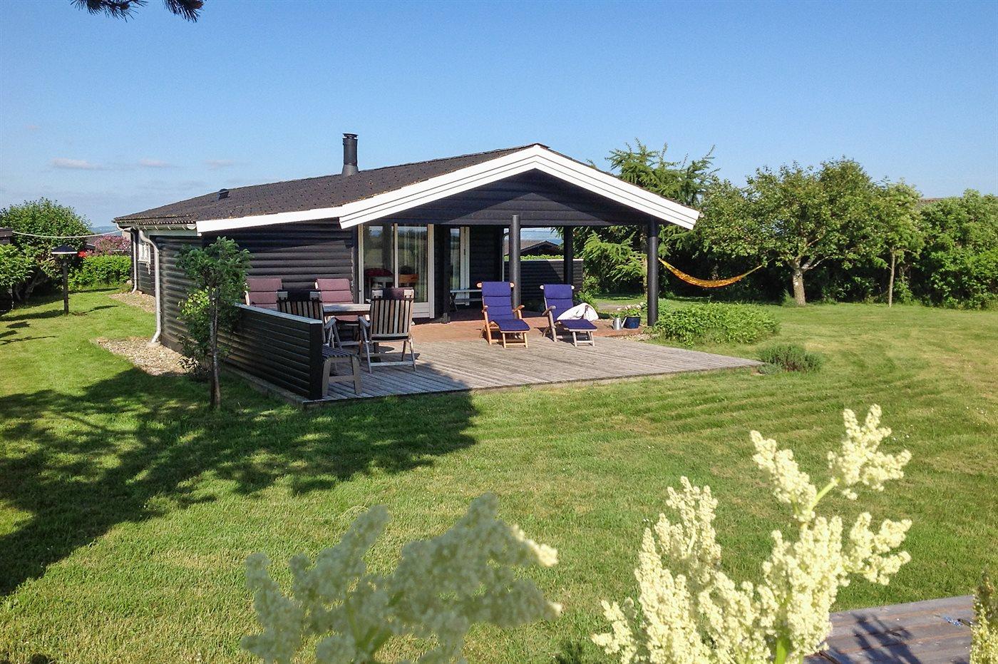Skønt bjælkesommerhus, bygget i 1973 og moderniseret i 2009 med bl.a. nyt køkken og badeværelse. Huset ligger på en dejlig havegrund med udsigt over vandet fra såvel hus som grund. Til huset hører 2 nye, åbne samt overdækket terrasse med havemøbler. Indvendig er der bjælkevægge og -lofter. Afhøvlede, ludbehandlede trægulve overalt. Det flotte kvalitetskøkken er bl.a. udstyret med opvaskemaskine og komfur med induktions kogeplader. Pænt badeværelse med vinylgulv og bruseniche. Den hyggelige og pænt møblerede opholdsstue er udstyret med brændeovn, stereoanlæg og fladskærms-TV (fuld HD) med tyske programmer. Husets sovepladser fordeler sig på 3 soveværelser; 2 med dobbeltseng og 1 med 2 enkeltsenge. Af yderligere udstyr kan gratis, trådløs internetforbindelse nævnes (computer skal medbringes) og der er installeret energibesparende varmepumpe. Fryser i redskabsrum. Til børnene er der høj barnestol og sandkasse til rådighed. Et dejligt hus i fredelige og børnevenlige omgivelser. Der er gode fiskemuligheder i nærheden.