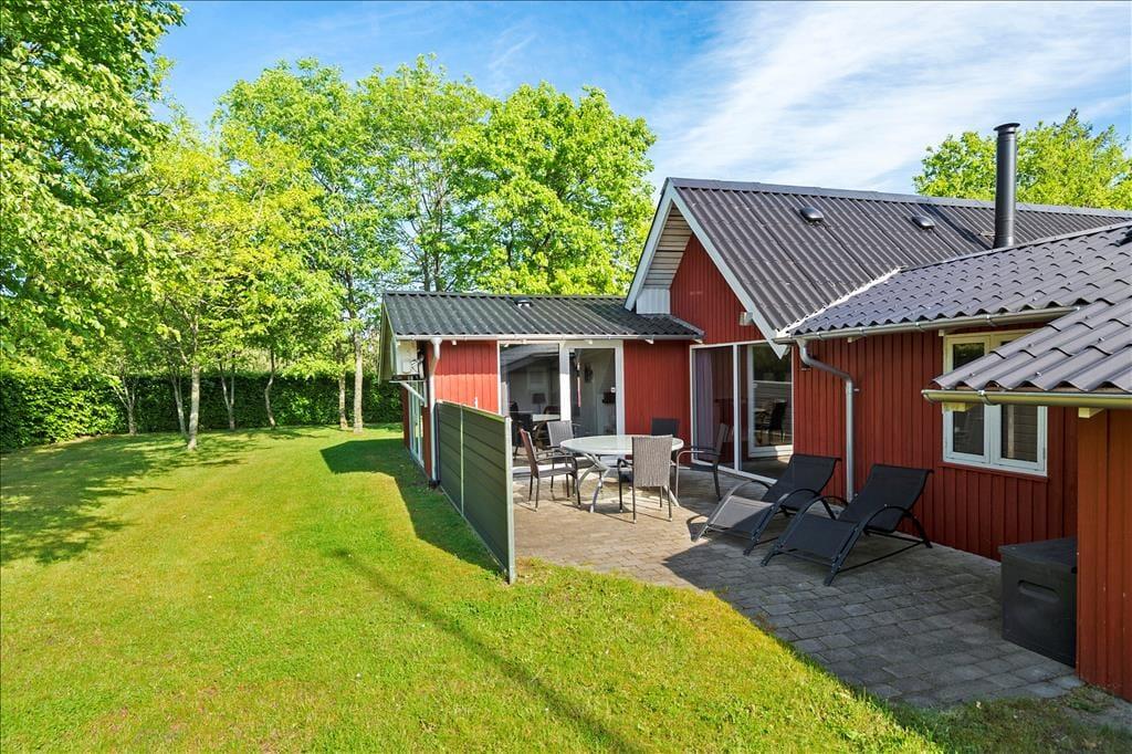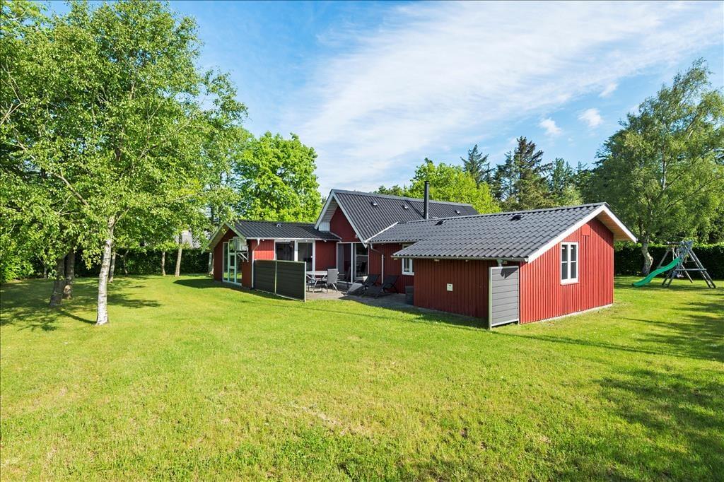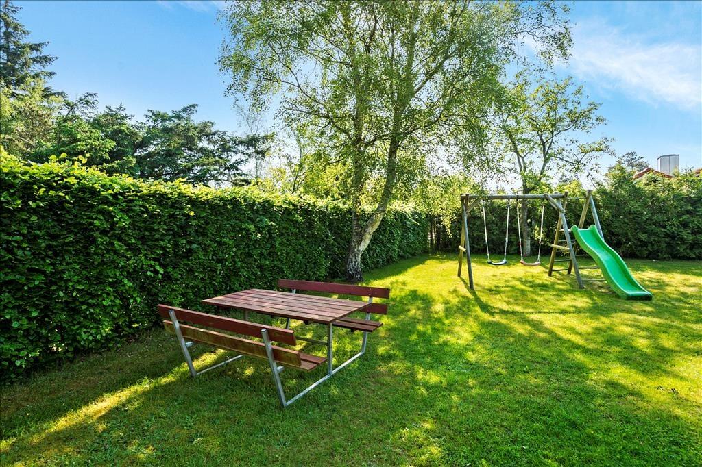 Med en grund på 1000 m2 har I god plads til at lege og slappe af ude i det fri på de solrige dage. Til børnene er der gynger og sandkasse – og hvis det ikke er nok, ligger der en dejlig legeplads meget tæt på sommerhuset. På den grønne grund er der for øvrigt carport til bilen, mens I selv kan sætte jer på en af terrasserne eller slå jer ned ved bord-bænke-sættet på græsplænen.