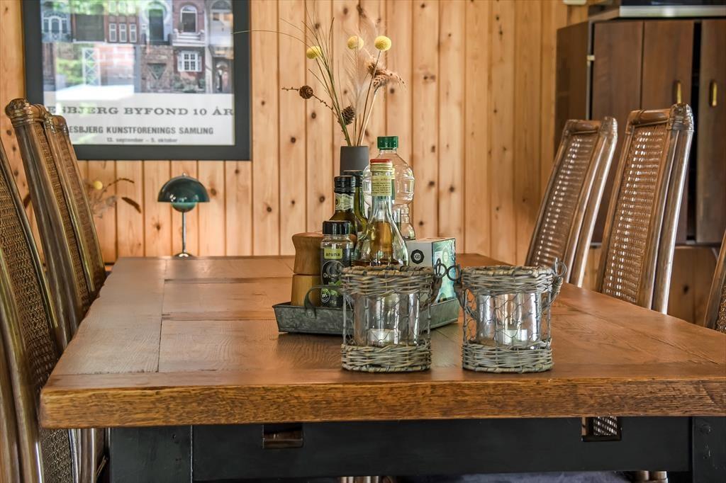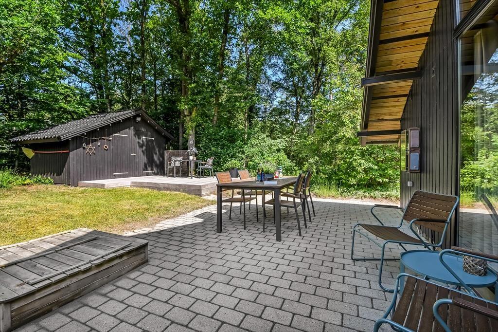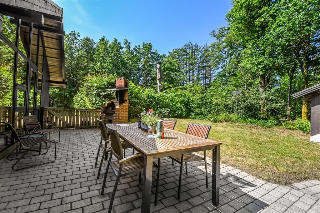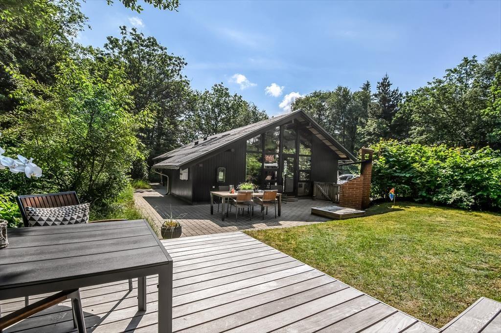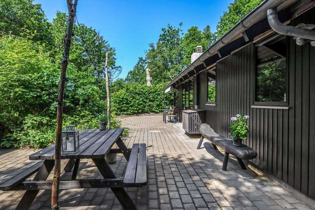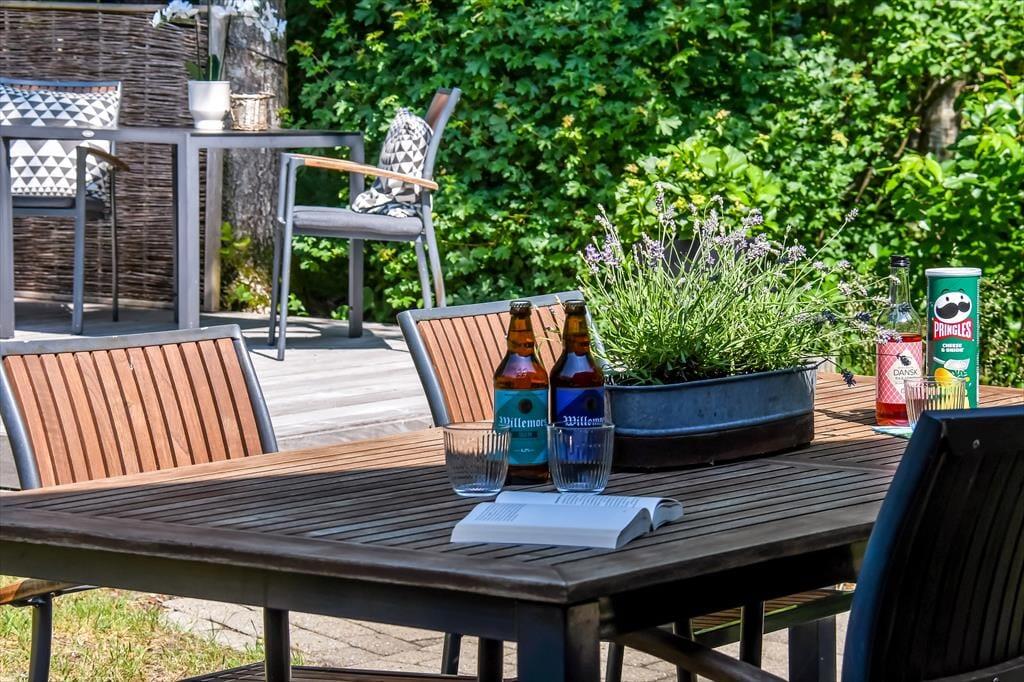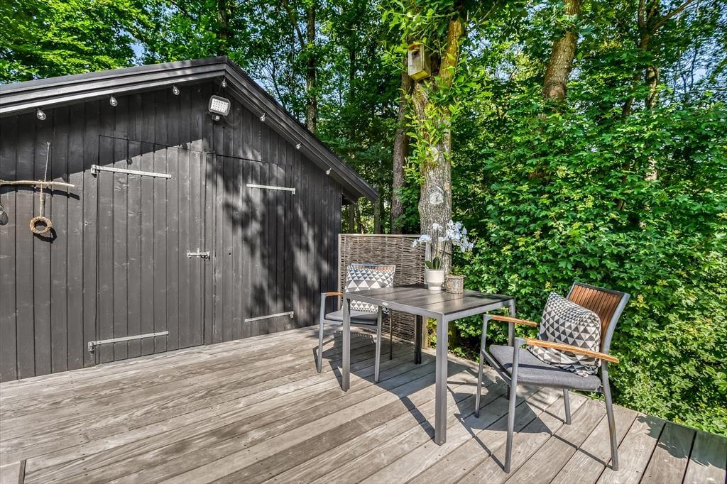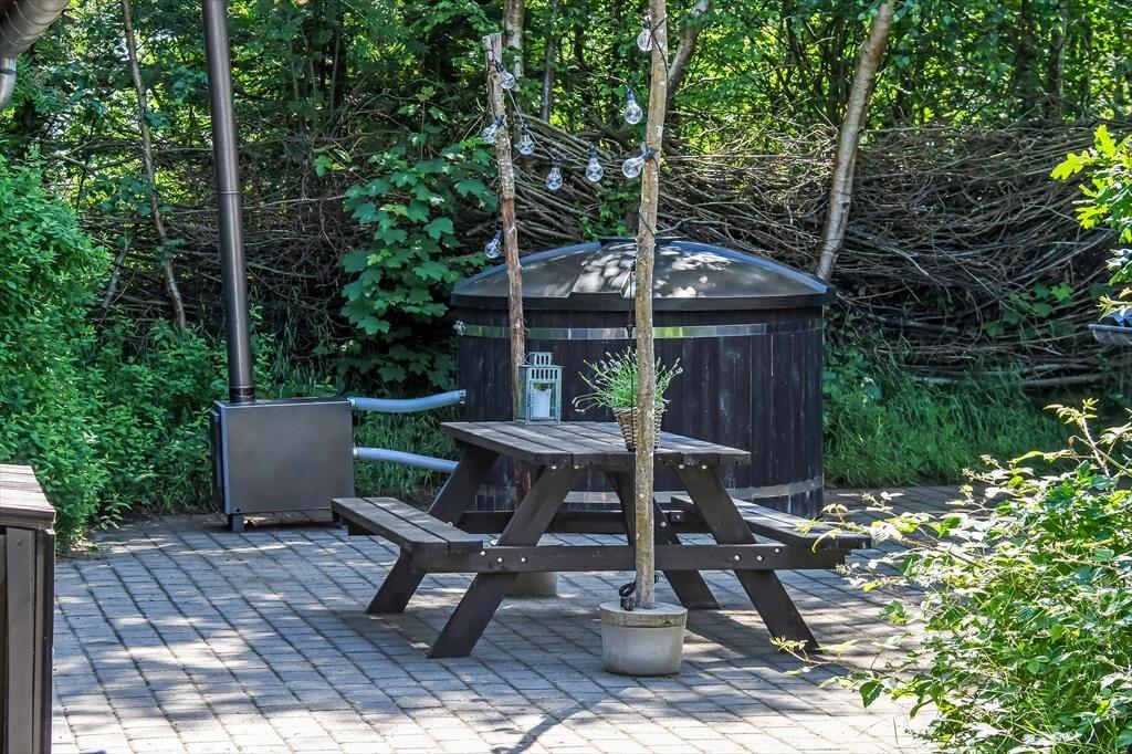På den store naturgrund er der skruet helt op for idyllen, når løvtræerne bugner af bladgrønt, fuglene kvidrer, og sommersolen står højt på den høje, blå himmel. Her i feriens ugenerede og rolige helle har du flere opholdspladser at vælge imellem, som udover dejlige terrasser også inkluderer et lækkert vildmarksbad. På en kølig dag er det herligt at læne sig tilbage i det varme vand, når du vender hjem fra en cykel- eller fisketur, og om sommeren bliver de lyse aftner blot endnu mere magiske, når du kan sidde her med dem, du holder allermest af.