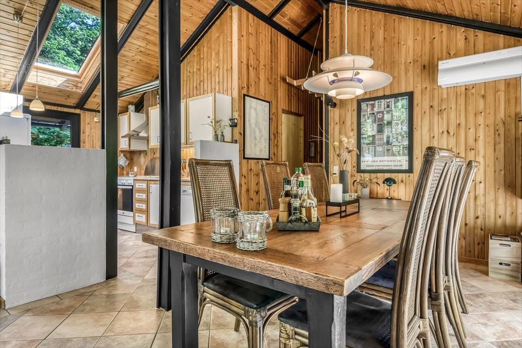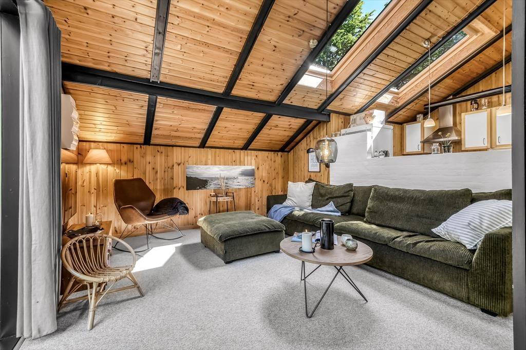 Sommerhusets badeværelse og tre soveværelser er alle sammen gode rum med en rar atmosfære, men det er ganske givet stuen, du kommer til at tilbringe de fleste af døgnets vågne timer i. Det er nemlig et lækkert opholdsrum med rustikke trævægge, loft til kip og ovenlysvinduer – såvel som store glaspartier, der inviterer naturgrundens grønne frodighed indenfor og gør det nemt at tage terrasserne i brug. En brændeovn bidrager til hyggestemningen: Hvis du og dine kære holder ferie udenfor højsæsonen, er det herligt at sidde nær den knitrende varme, mens I spiller brætspil eller nyder et overdådigt måltid. Maden kan I tilberede i det åbne køkken, og her er der alt, hvad I skal bruge, uanset om I laver en let sommersalat eller en omgang rigtig comfort food.