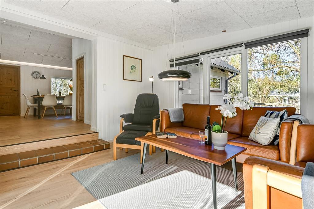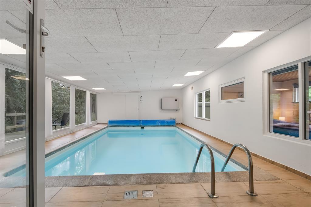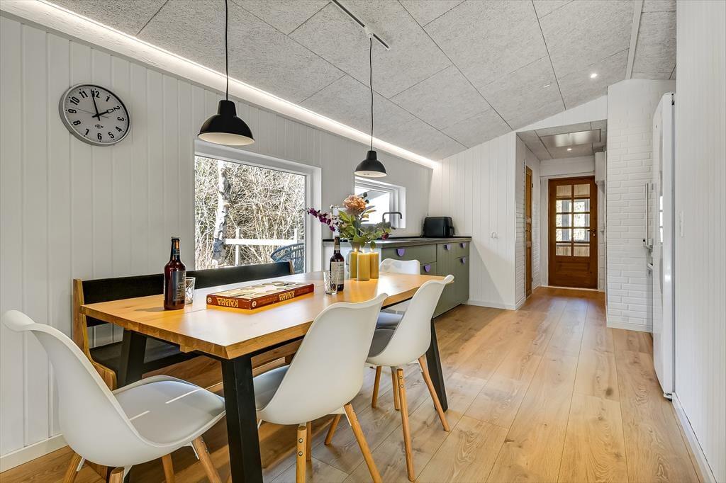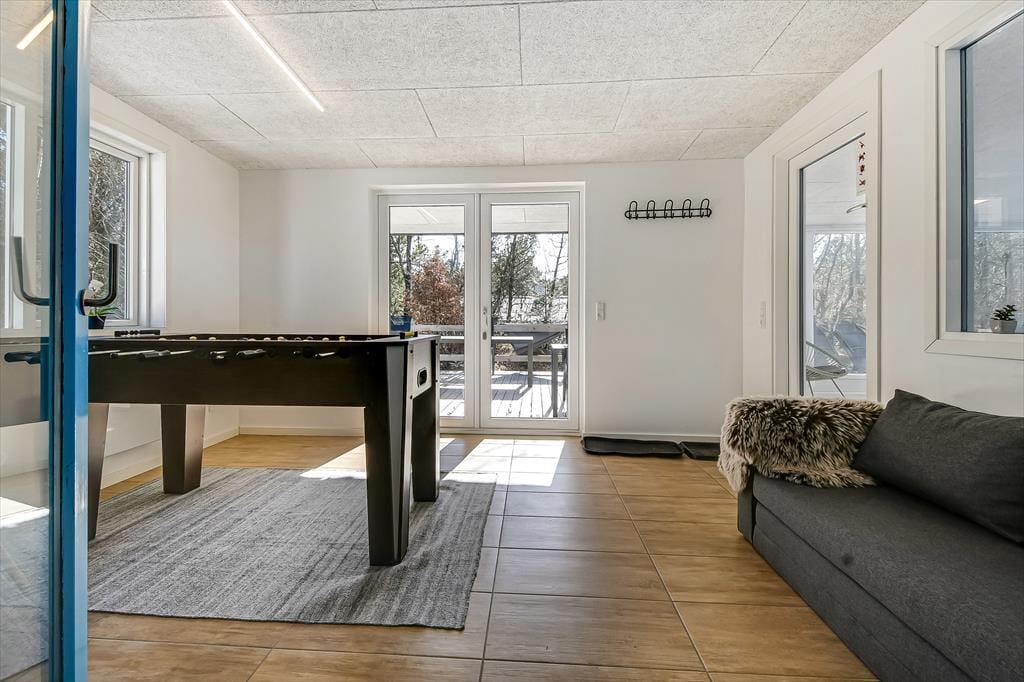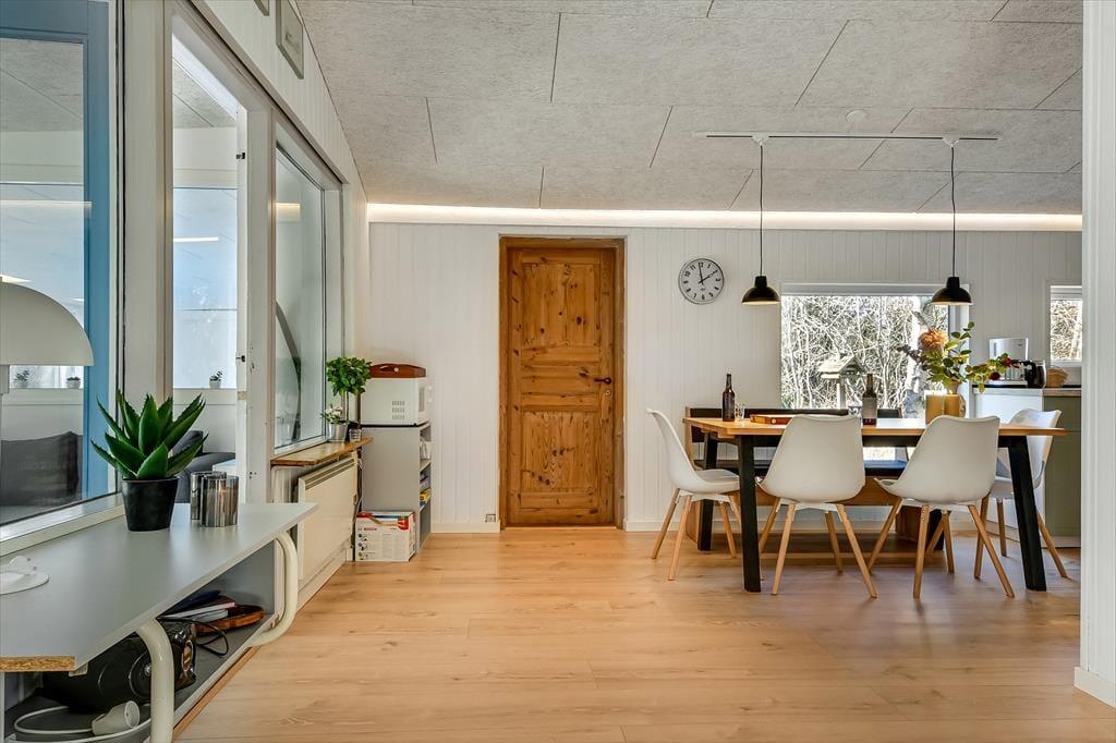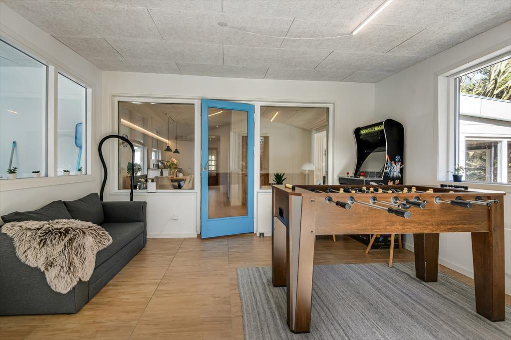 Det lyse sommerhus er med sine 161 m2 dejligt stort og rummeligt, og med tre soveværelser og to badeværelser passer planløsningen perfekt til seks personer. Efter seneste renovering fremstår alle rum lyse og indbydende, og ikke mindst opholdsmiljøet er et herligt sted at samles: Her ligger køkken-alrum og stue i åben forbindelse, blot adskilt af et par trin, så det er nemt at bære eftermiddagskaffen hen til sofaafdelingen, hvis I vil drikke den i nærheden af brændeovnen. Hvis I ikke kan sidde stille, kan I rykke ind i aktivitetsrummet for at spille bordfodbold eller dyste i arkadespil – når ikke I hellere vil plaske, svømme og lege i sommerhusets dejlige swimmingpool.