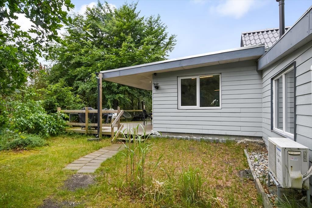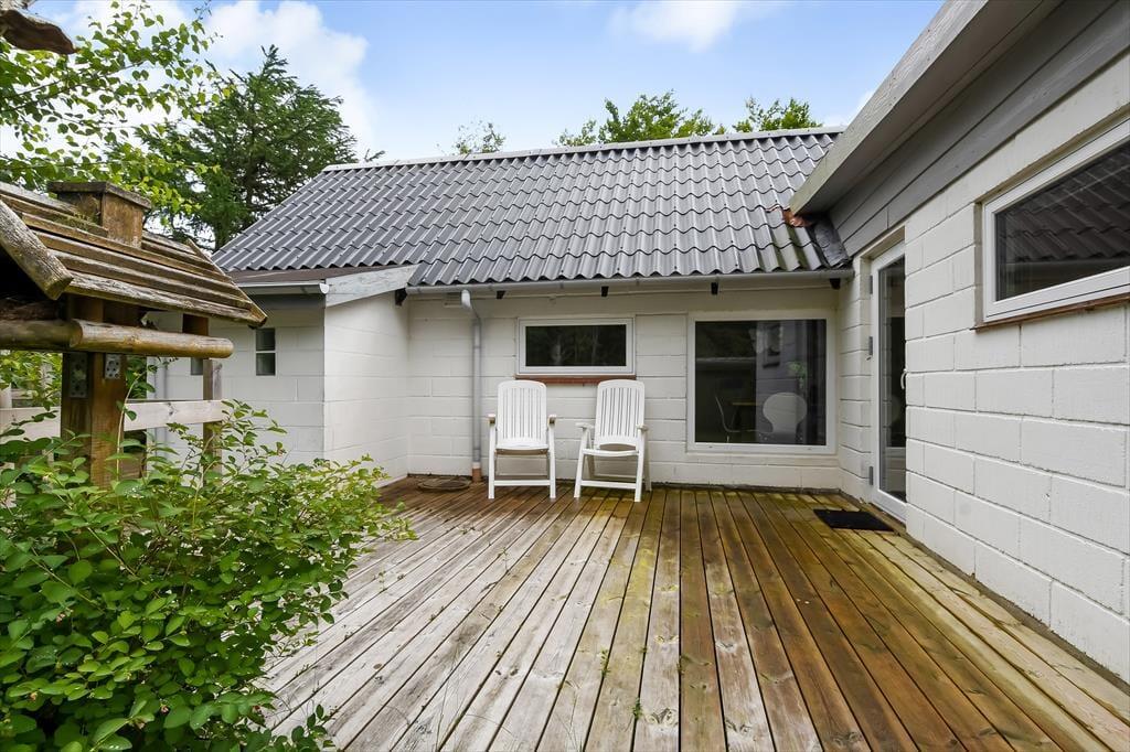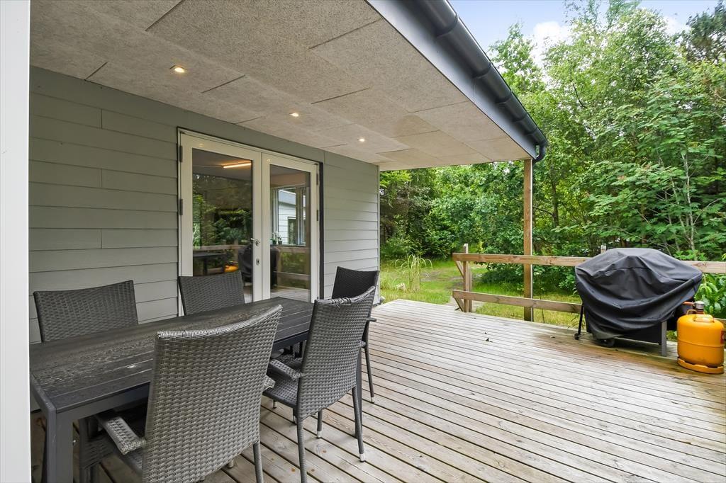 Ligesom selve sommerhuset er naturgrunden stor, og udearealerne er godt afskærmede af randbevoksningen, så du og dine kære får en ugeneret ramme om det udendørs driverliv. Rundt om sommerhuset venter der flere dejlige terrasser, så hvis du vil finde en opholdsplads i en solstråle efter svømmeturen eller tage sommerfrokosten med ud i det fri, er det oplagte muligheder. En del af terrassemiljøet er overdækket, hvis I vil sidde i ly, når duggen begynder at falde om aftenen – det er dejligt at samles her i tusmørket med udsigt til løvtræernes bladhang og lyden af naturgrundens fugle, der synger dagens sidste melodier.