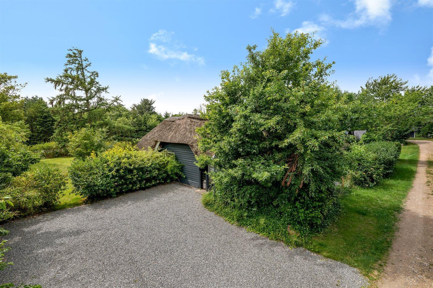 Hyggeligt stråtækt sommerhus i naturskønne Hemmet med lukket terrasse og indhegnet have, perfekt til børn og hunde.