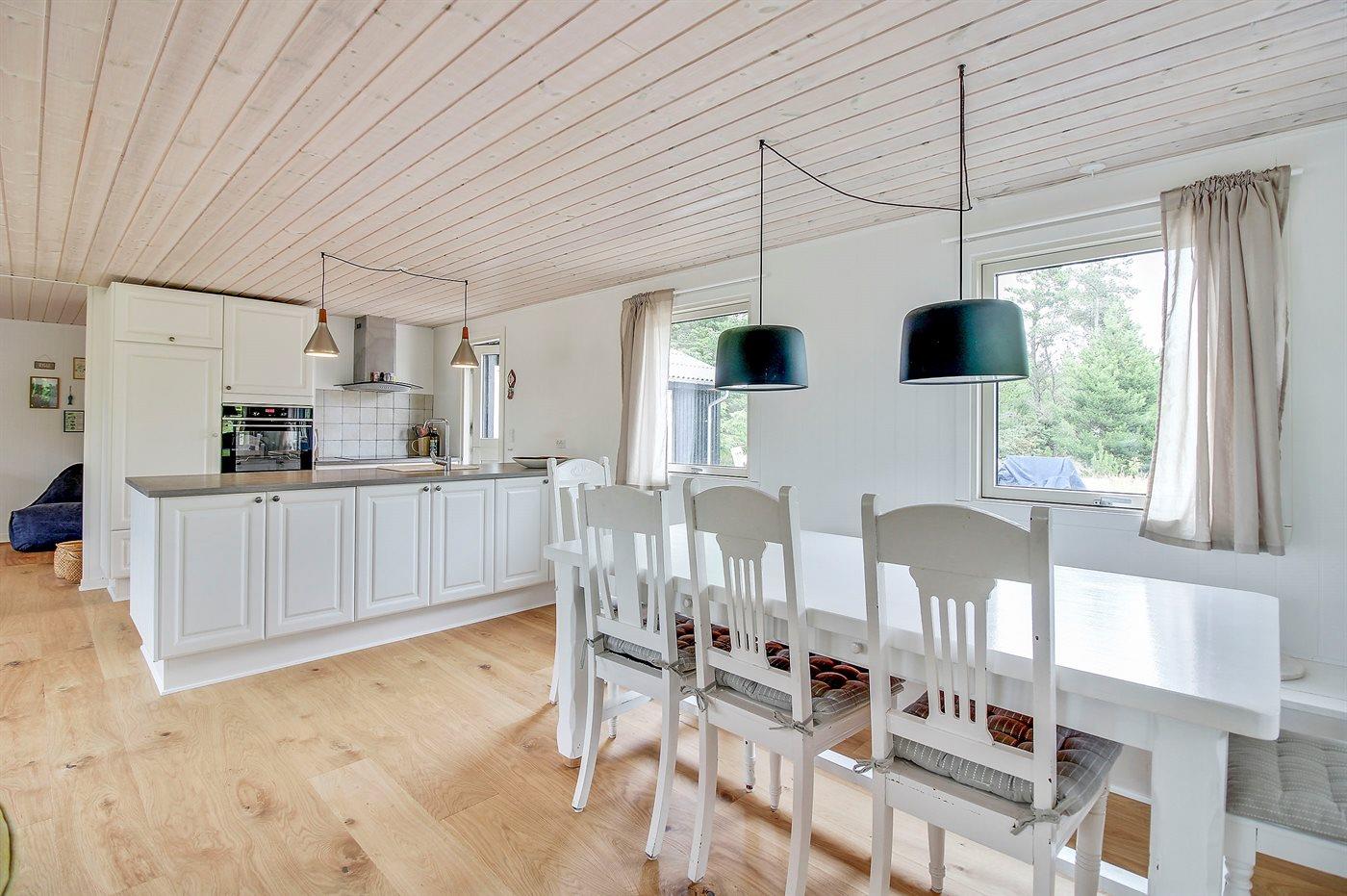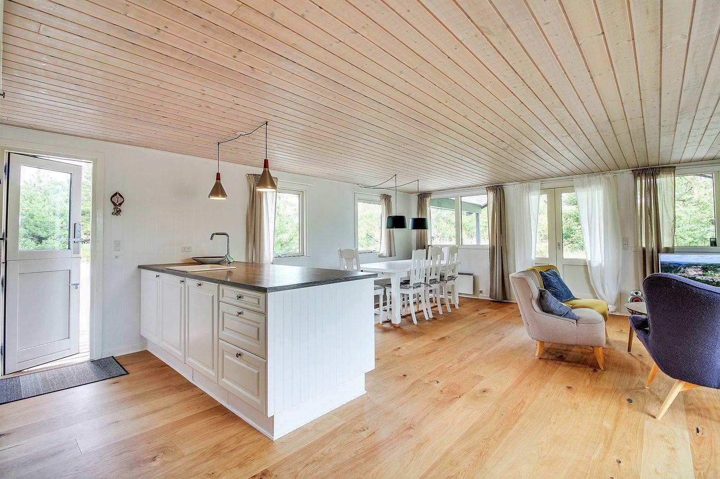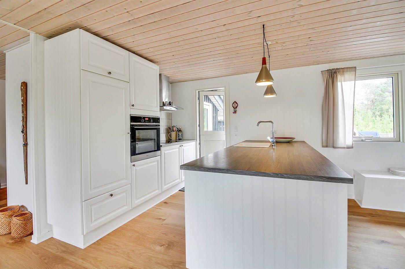 Det åbne køkken er udstyret med køleskab med 20 liter frostboks, 4 keramiske kogeplader, emhætte, bageovn samt opvaskemaskine.