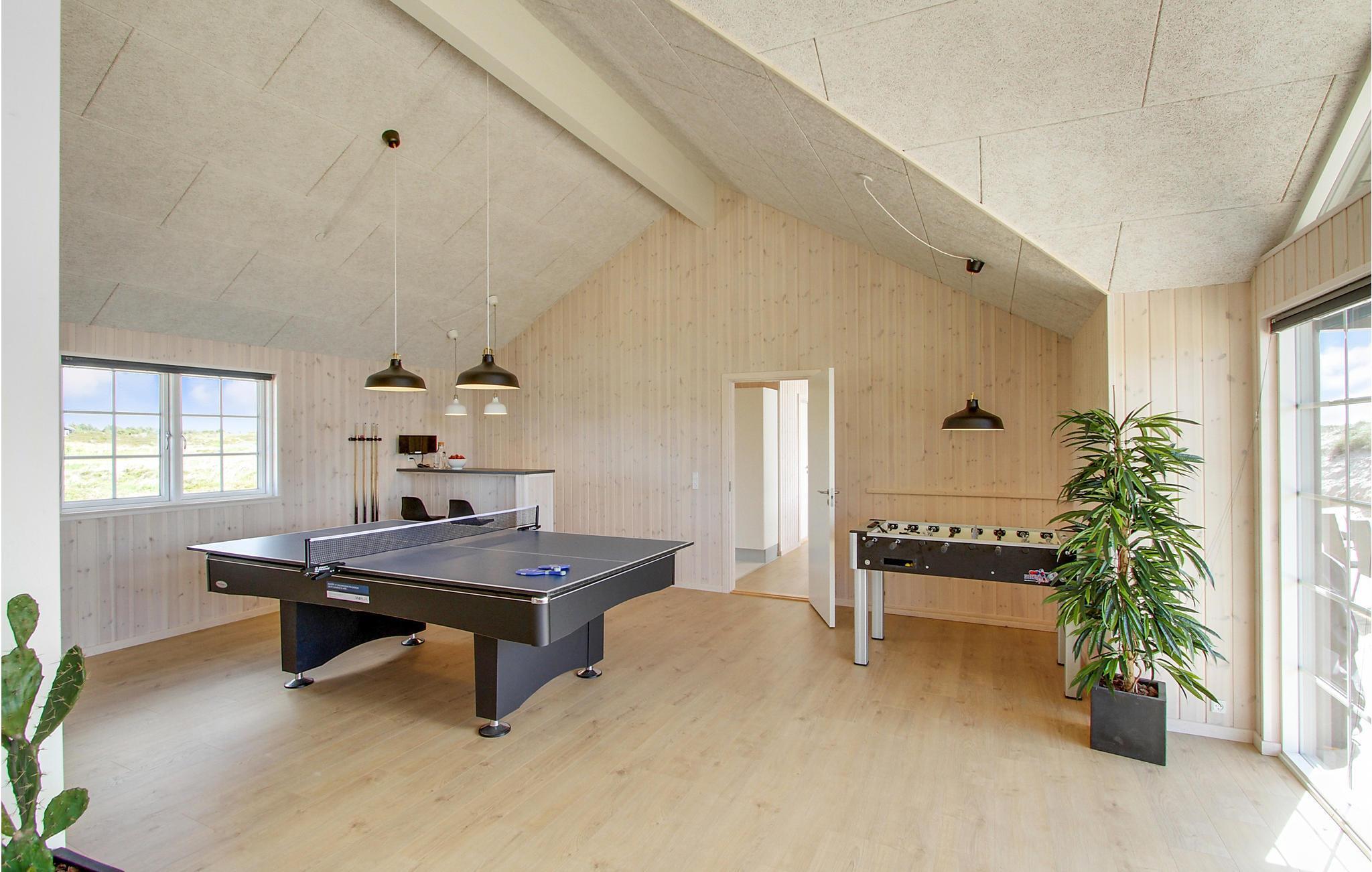 I feriebyen Henne Strand, ligger dette pragtfulde swimmingpoolhus på en kuperet naturgrund. Huset er med sine mange aktivitetsmuligheder den perfekte ramme for en succesfuld ferie året rundt. Feriehuset byder på al tænkelig komfort og luksus, og er bygget op omkring to soveafdelinger med hvert sit badeværelse, som gør det meget velegnet til flere familier, der ønsker at holde ferie sammen. Børnene vil ofte foretrække at sove på den store hems, hvor der er indrettet fire sovepladser. Huset er udstyret med lydisolerede lofter, hvilket gør det meget behageligt at opholde sig i. I husets poolafdeling er der swimmingpool med vandrutsjebane og modstrømsanlæg til svømmetræning. Endvidere er der et seks personers spabad samt sauna og et badeværelse. I det store aktivitetsrum kan I spille både billard/bordtennis, dart, bordfodbold og Playstation4. I baren er der rig mulighed for at mikse spændende drinks, eller servere kolde øl og sodavand fra barens køleskab. Køkkenet er særdeles velindrettet og udstyret med en ekstra stor kogeplade, to opvaskemaskiner samt to køle-/fryseskabe, så der uden problemer kan være mange kokke og køkkenskrivere om den fælles madlavning. Terrassen er sydvendt og helt privat. På den delvis overdækkkede terrasse står en grill til tilberedning af lækre feriemåltider.