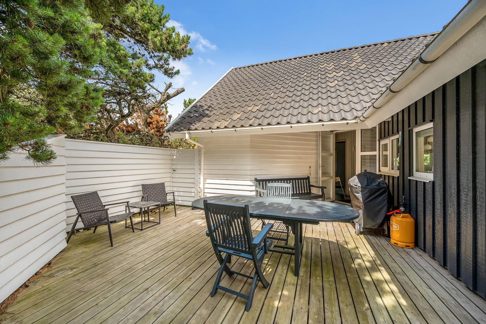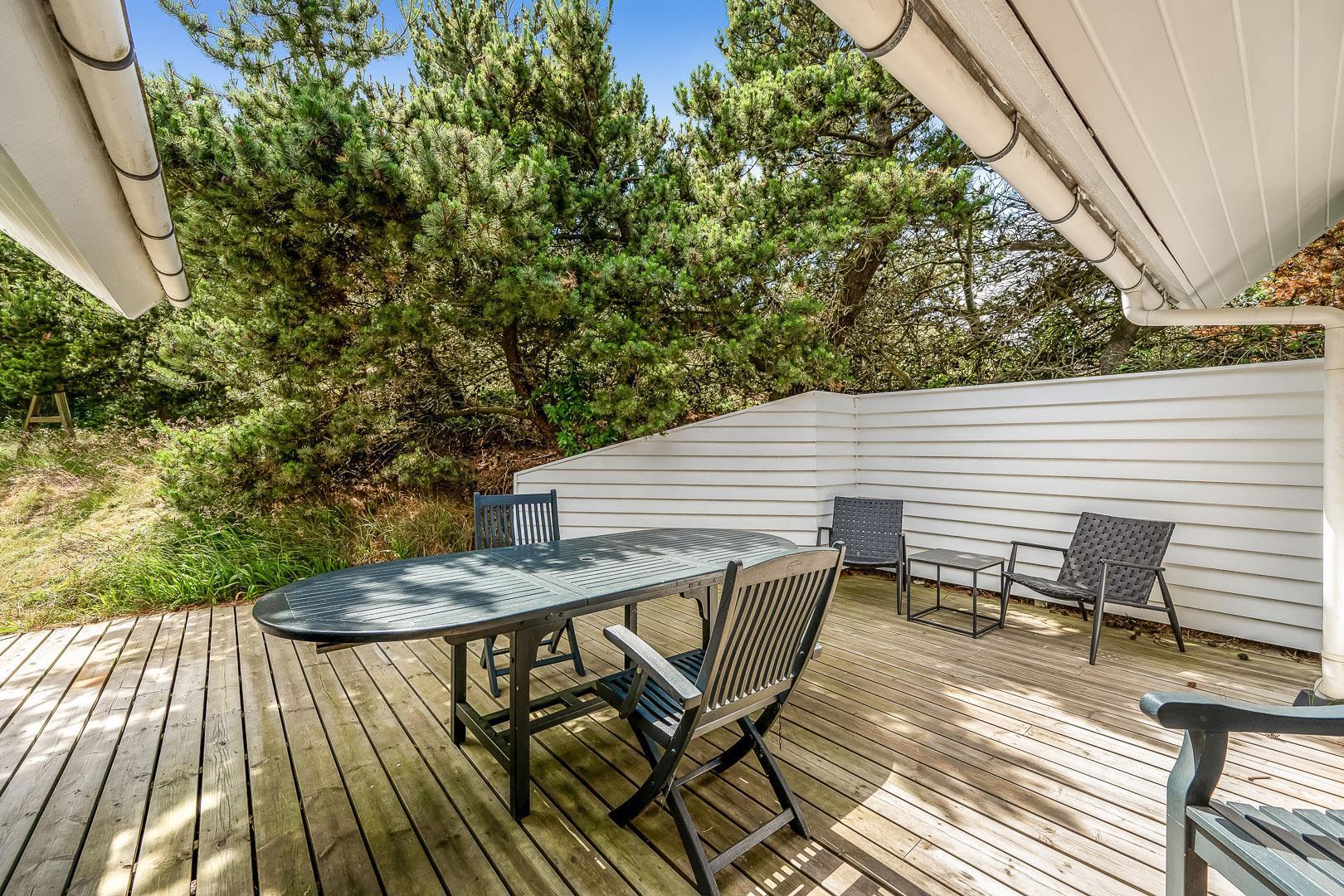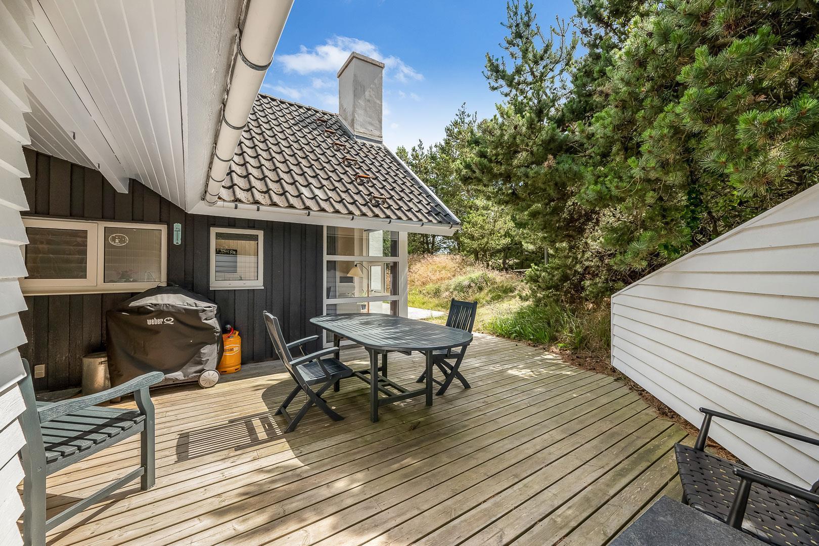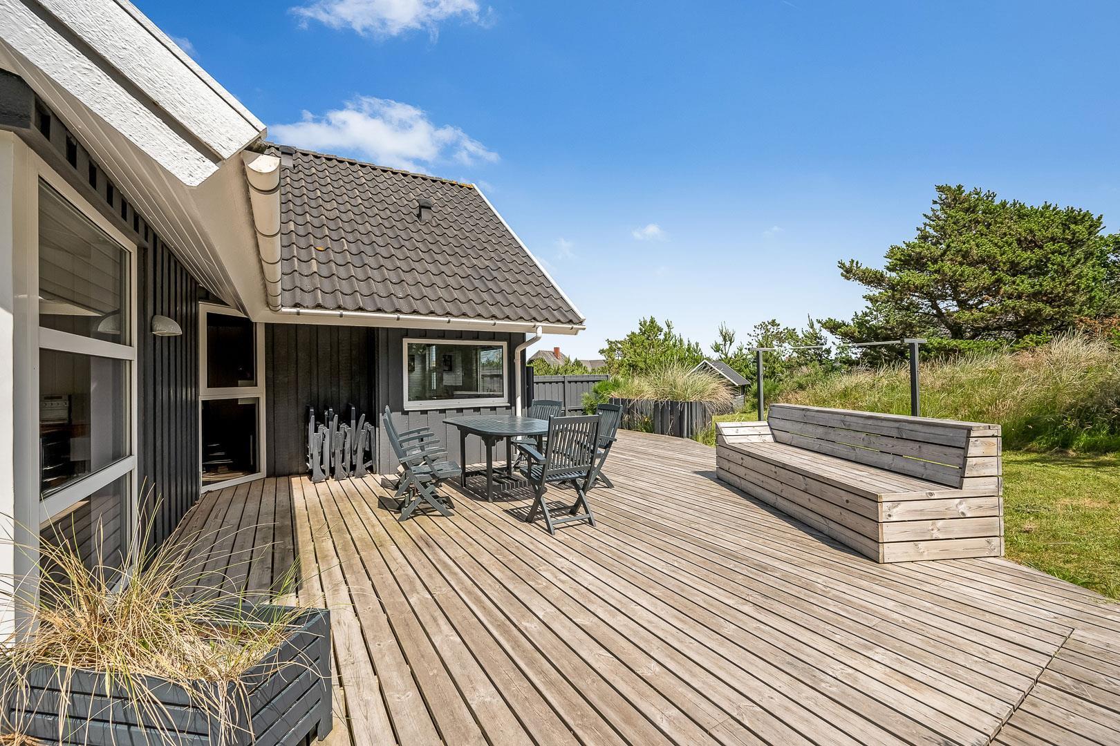 Med flere terrasser rundt om huset, kan du altid finde et hyggeligt hjørne med enten sol eller læ. Her er der havemøbler, grill, liggestole og parasol til rådighed. Fra terrasserne kan du lade blikket vandre ud på den skønne naturgrund. I 2020 er der lavet en ny stor træterrasse med integreret sandkasse.