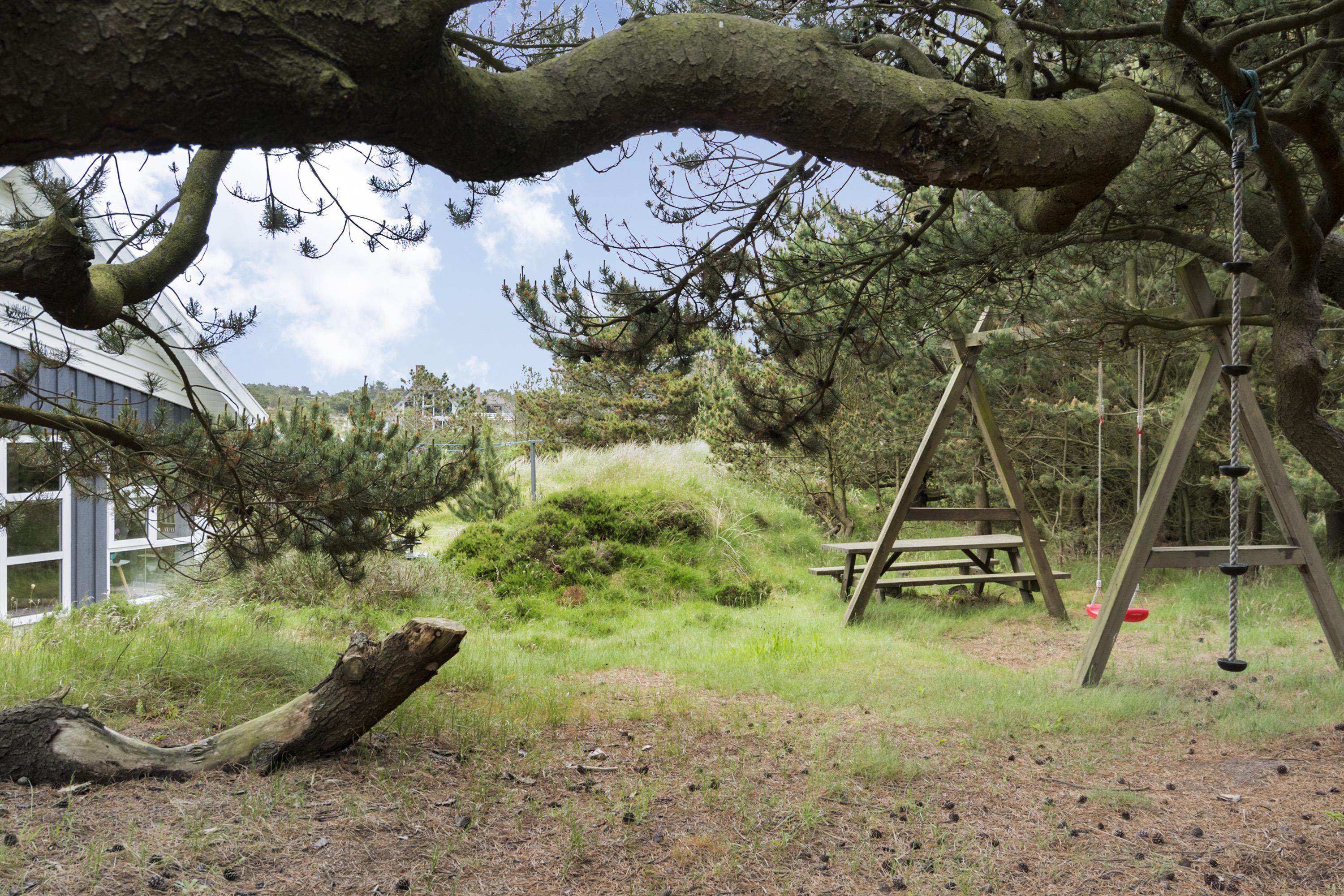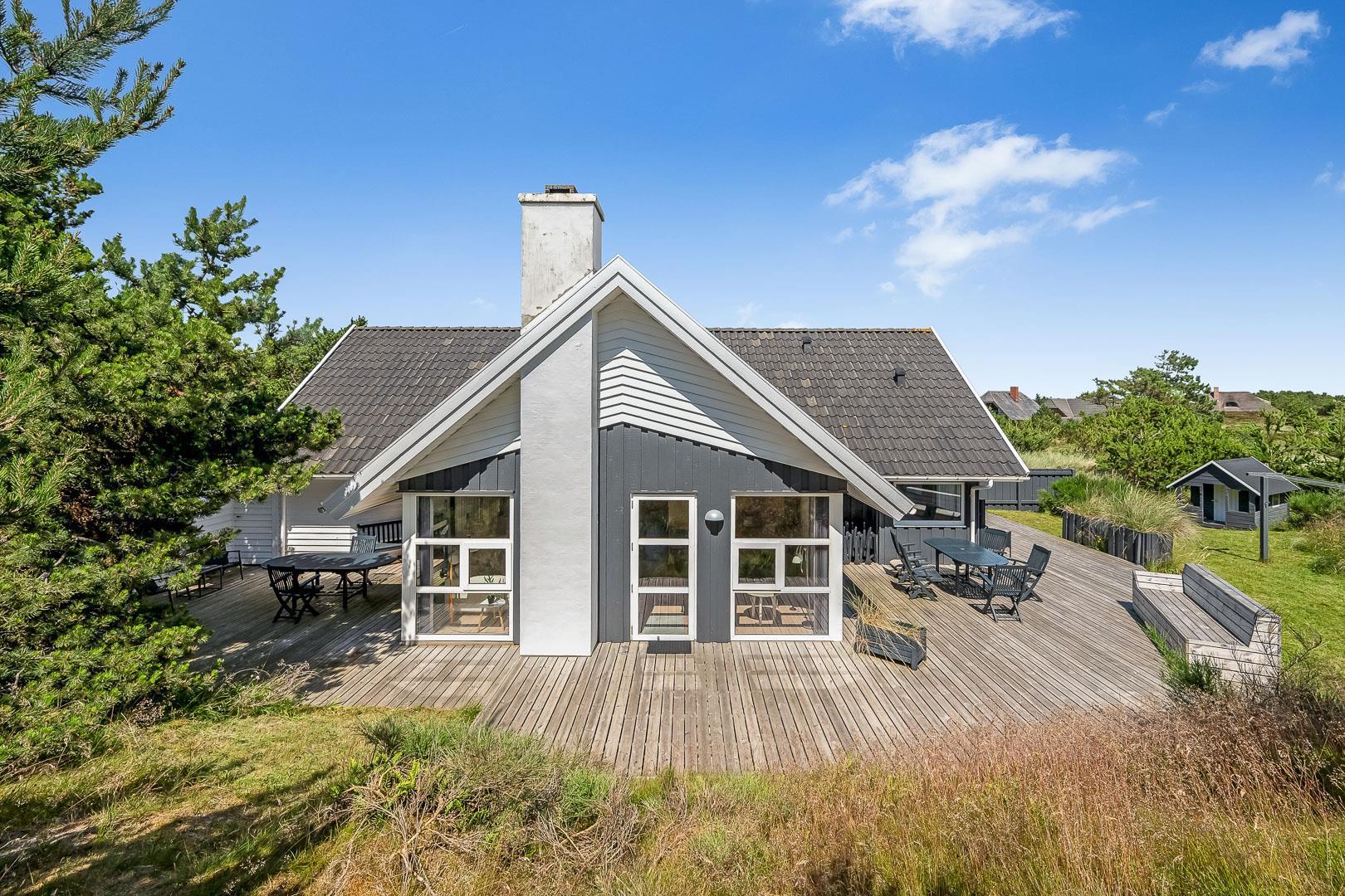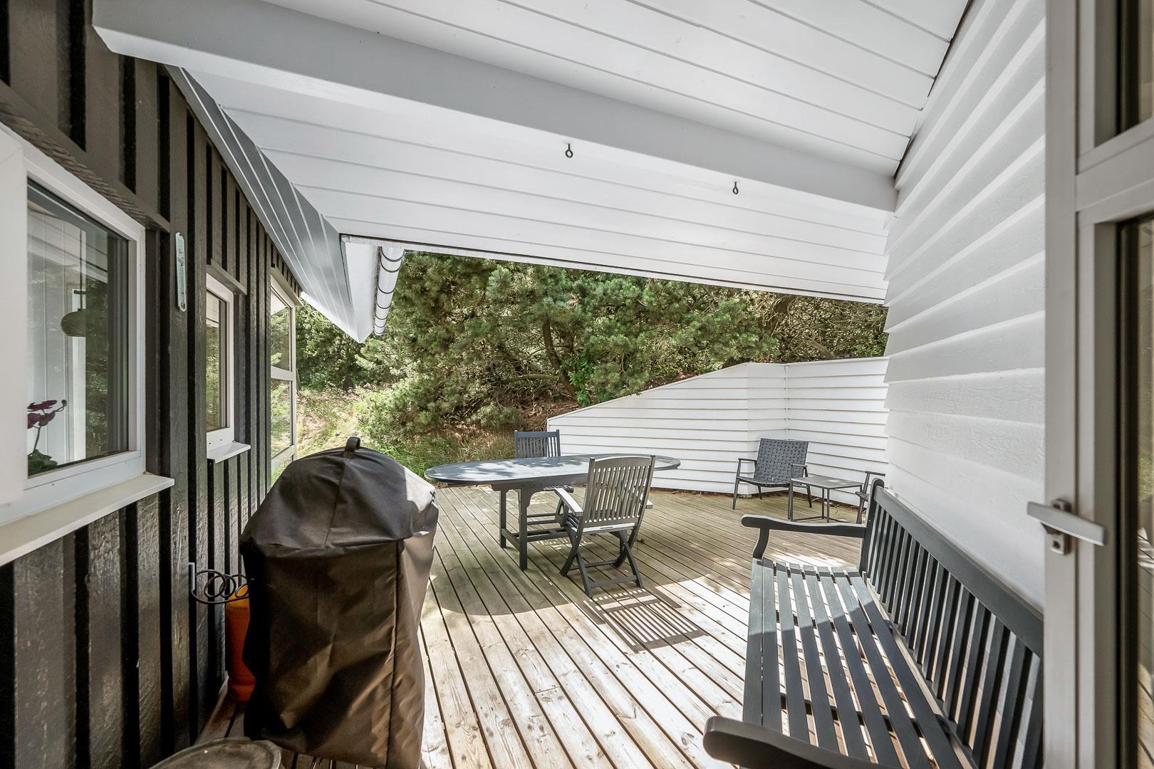 Med flere terrasser rundt om huset, kan du altid finde et hyggeligt hjørne med enten sol eller læ. Her er der havemøbler, grill, liggestole og parasol til rådighed. Fra terrasserne kan du lade blikket vandre ud på den skønne naturgrund. I 2020 er der lavet en ny stor træterrasse med integreret sandkasse.