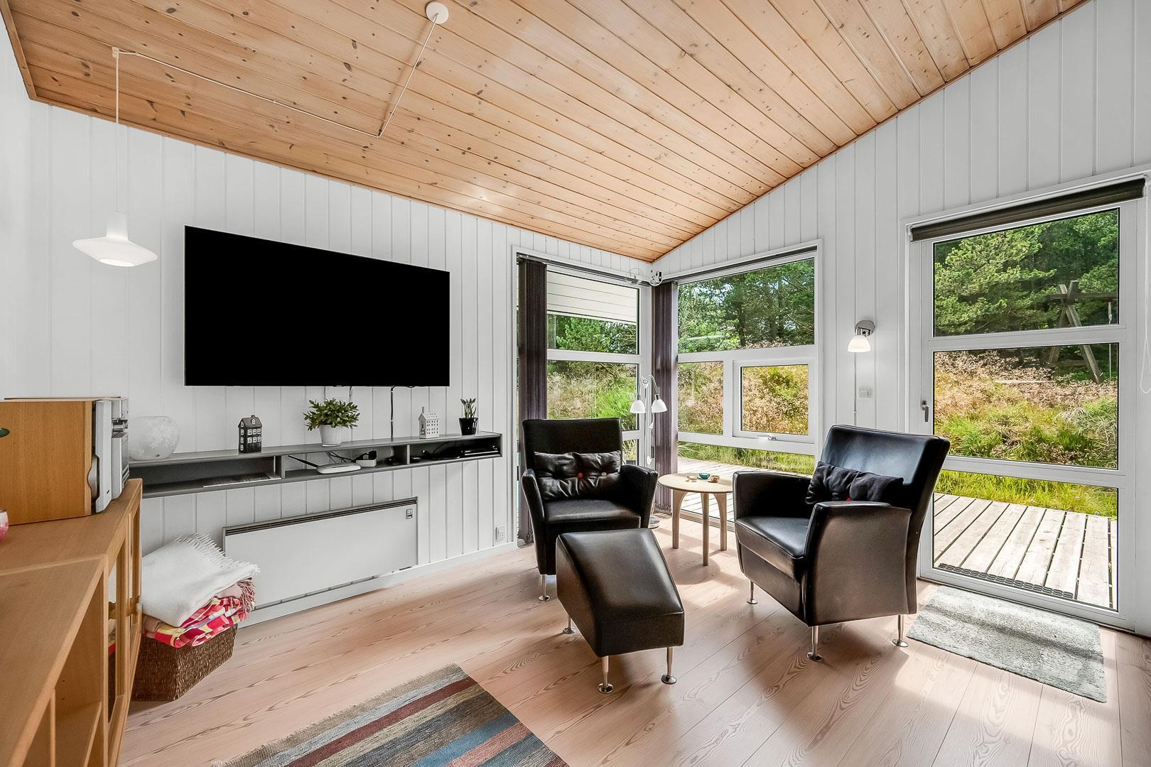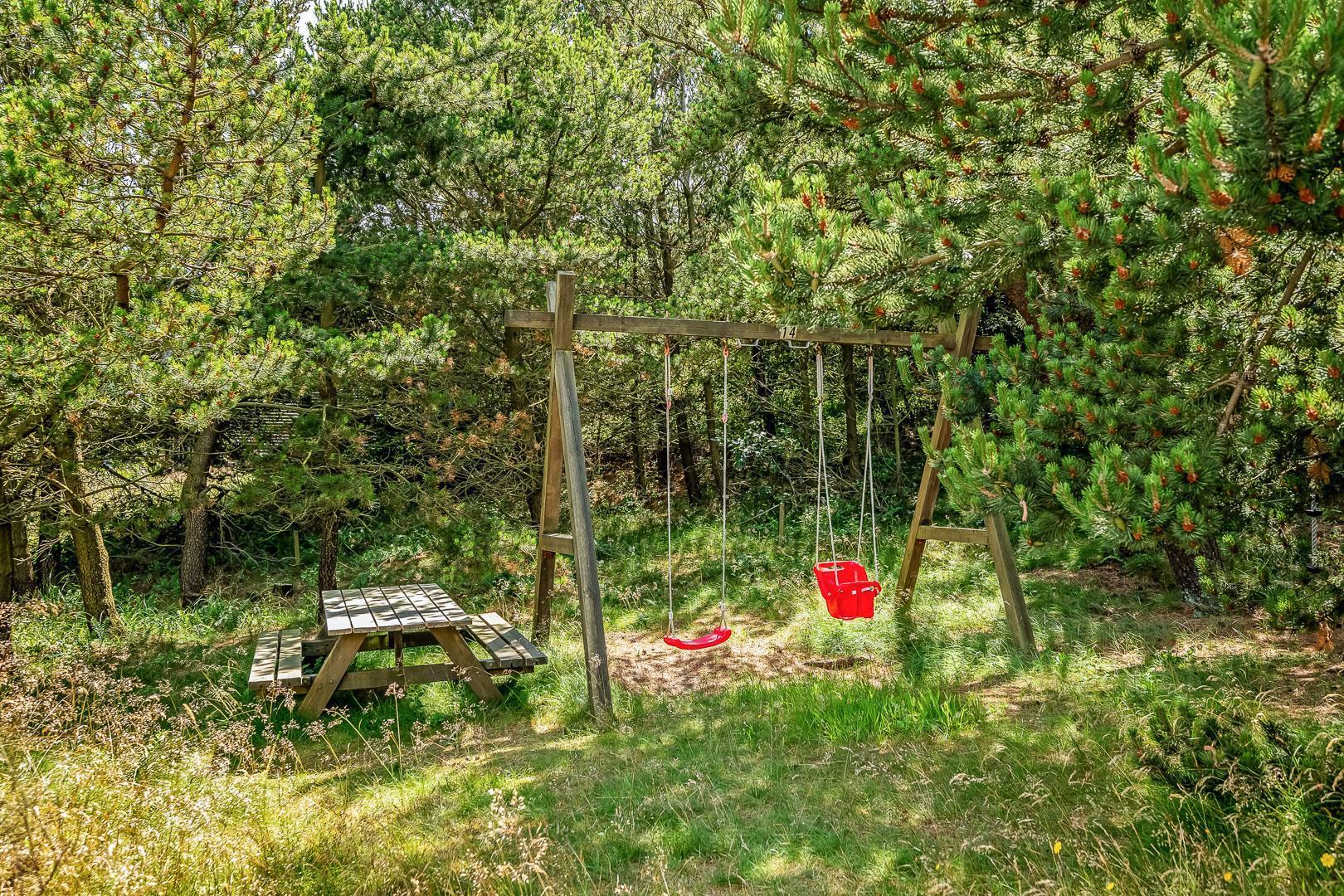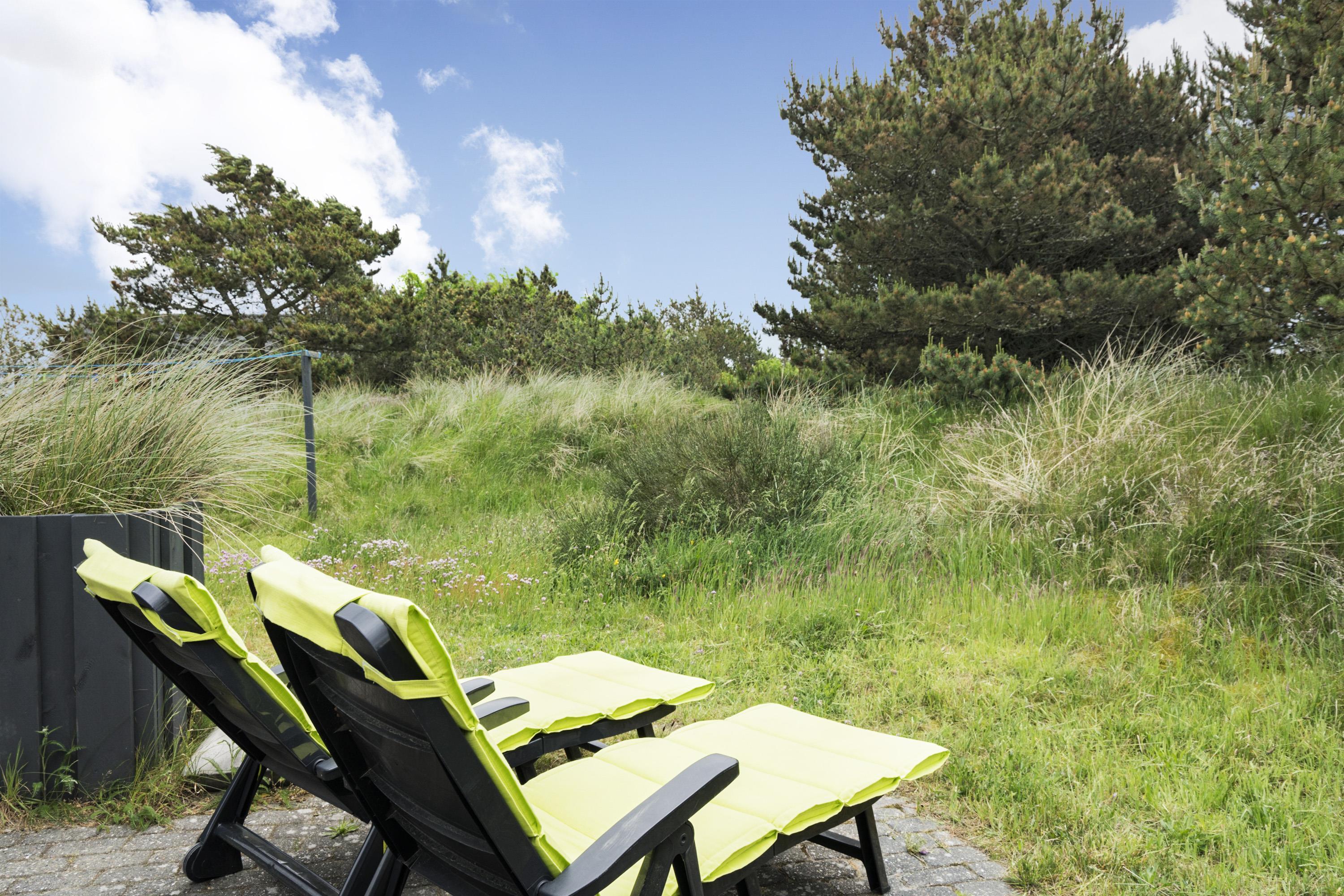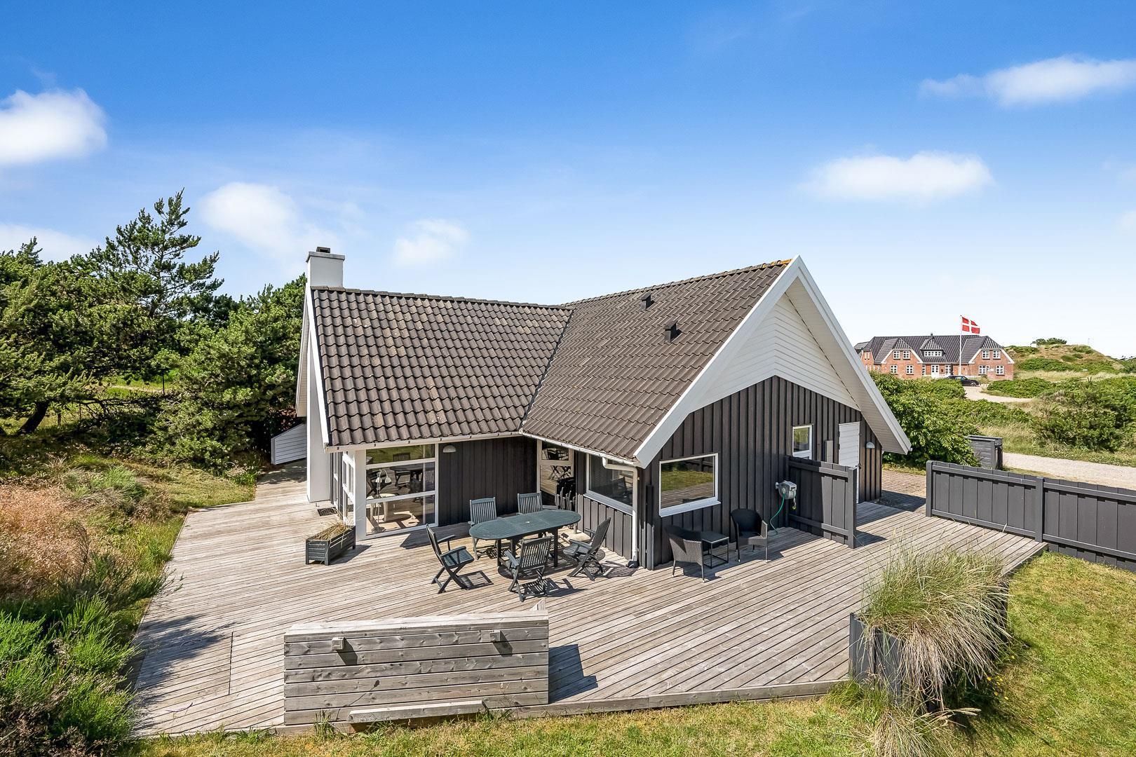 Med flere terrasser rundt om huset, kan du altid finde et hyggeligt hjørne med enten sol eller læ. Her er der havemøbler, grill, liggestole og parasol til rådighed. Fra terrasserne kan du lade blikket vandre ud på den skønne naturgrund. I 2020 er der lavet en ny stor træterrasse med integreret sandkasse.
