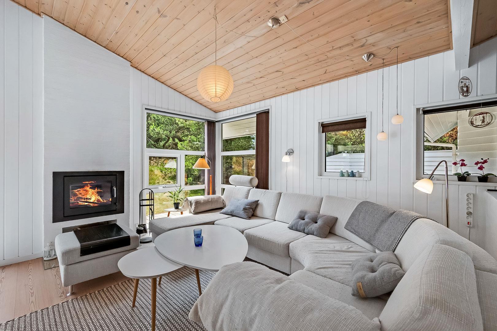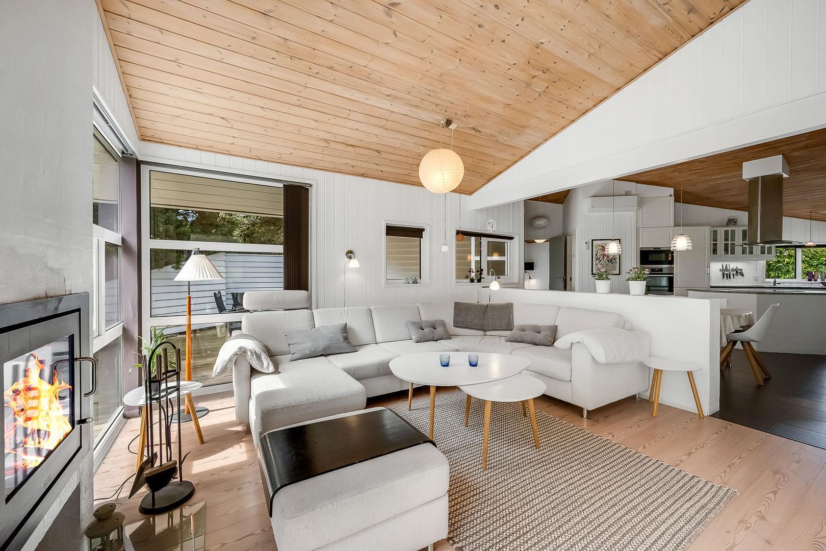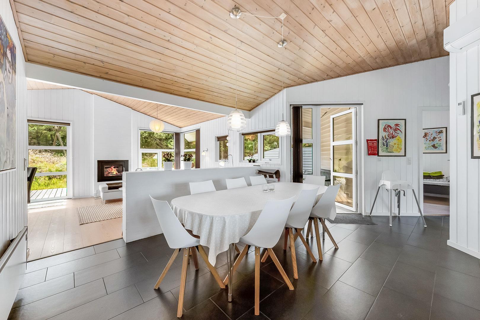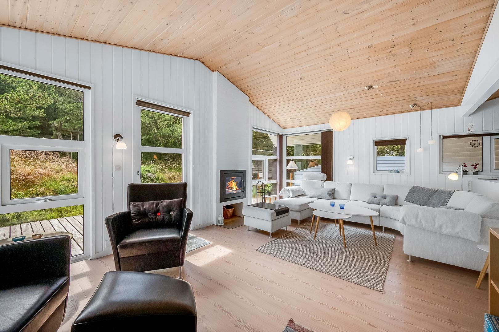 Dejligt feriehus tæt på by og strand. Huset er til 8 personer, rigtigt godt indrettet med mange hyggelige kroge. Fra entréen kommer du ind i et dejlig stort køkken alrum. Køkkenet og spisestuen grænser op til en stor opholds stue med brændeovn. På hver side af stuen ligger der 2 gode soverum og et badeværelse. Er i 2 familier, kan i trække jer tilbage i hver jeres ende af huset. Der er flise gulv med gulvvarme i begge badeværelser. Det ene badeværelse byder også på både sauna og spa.