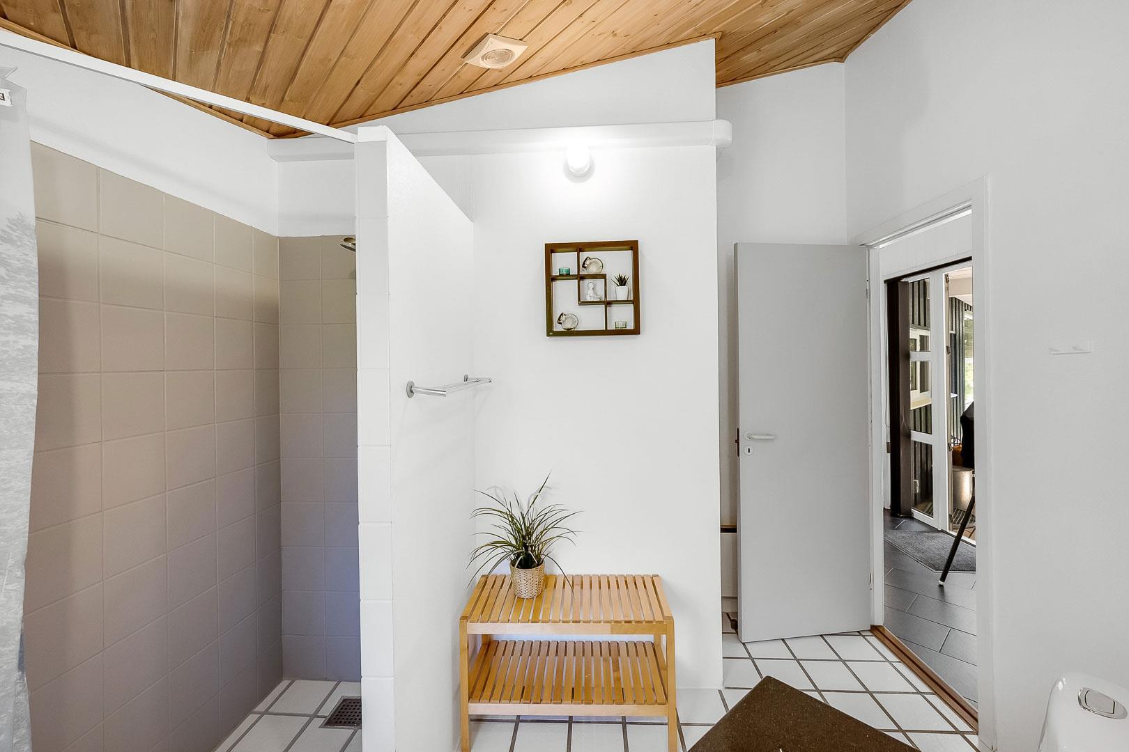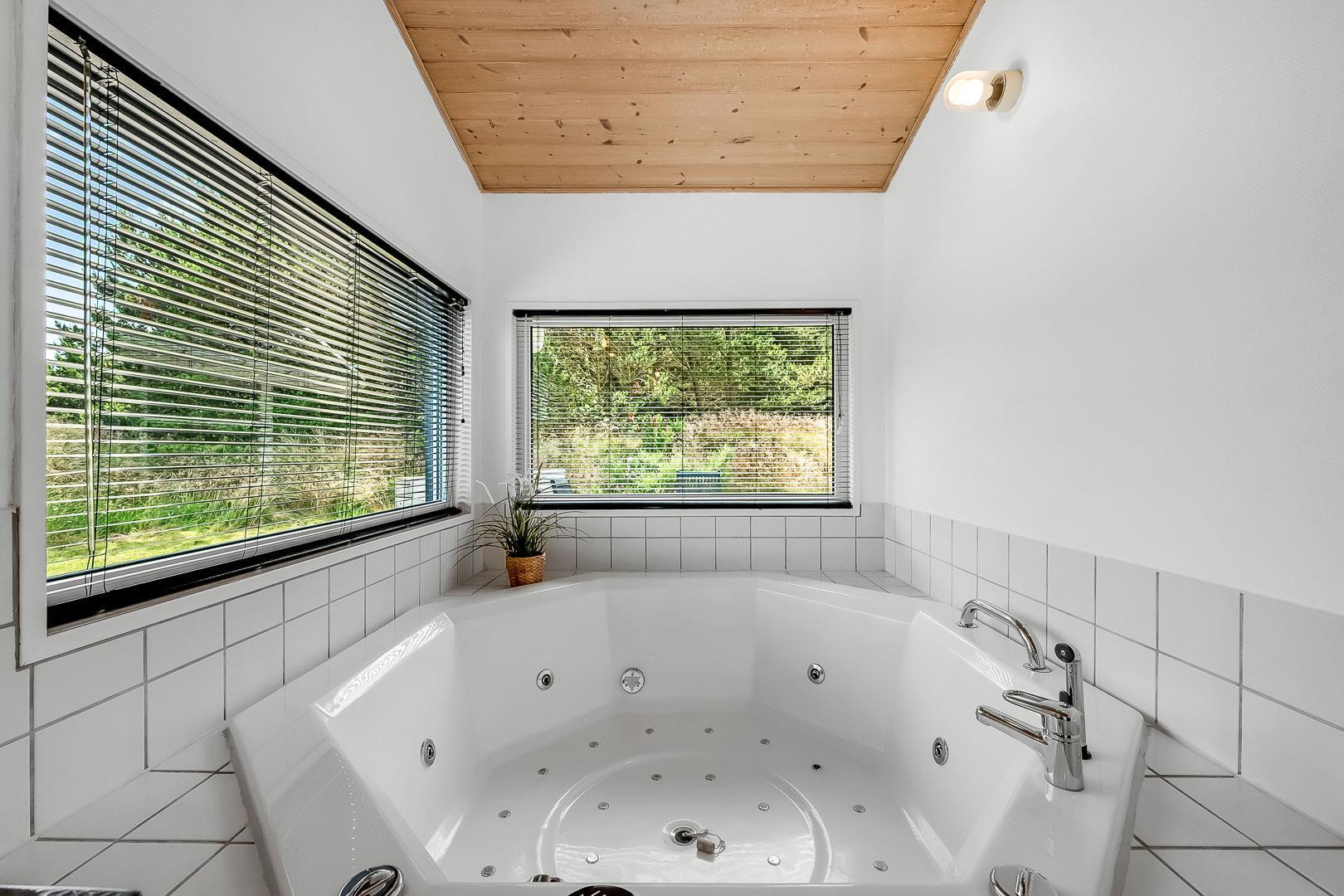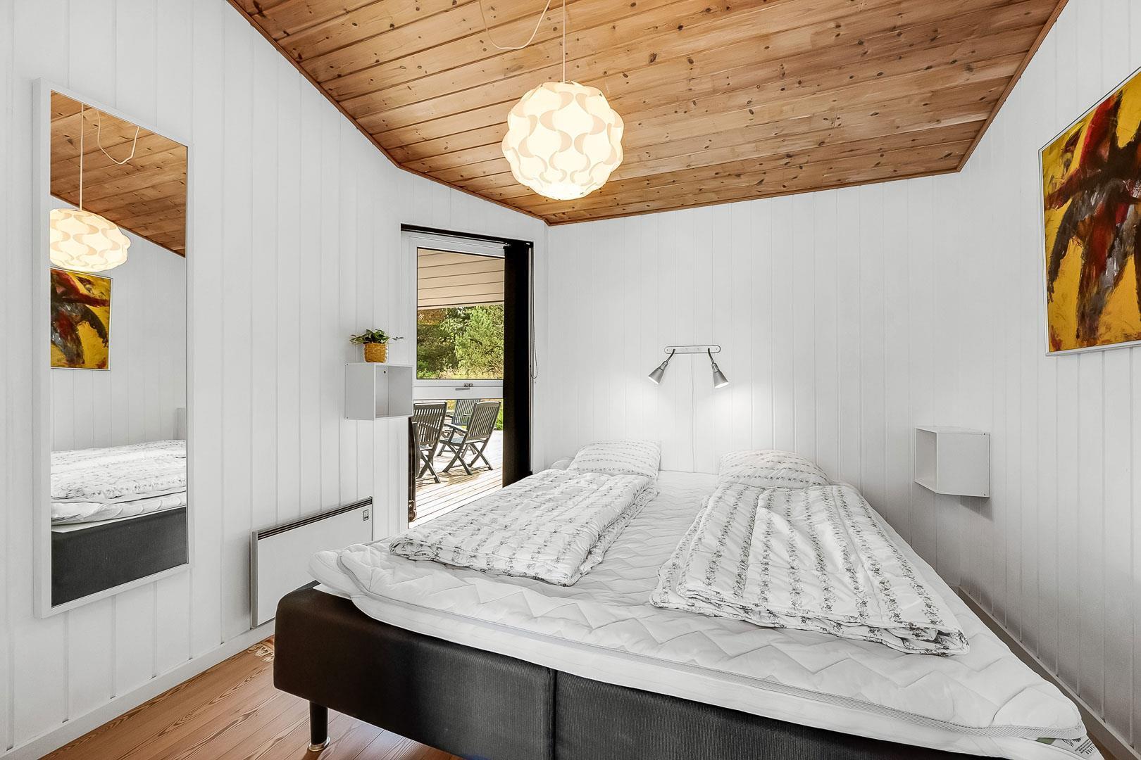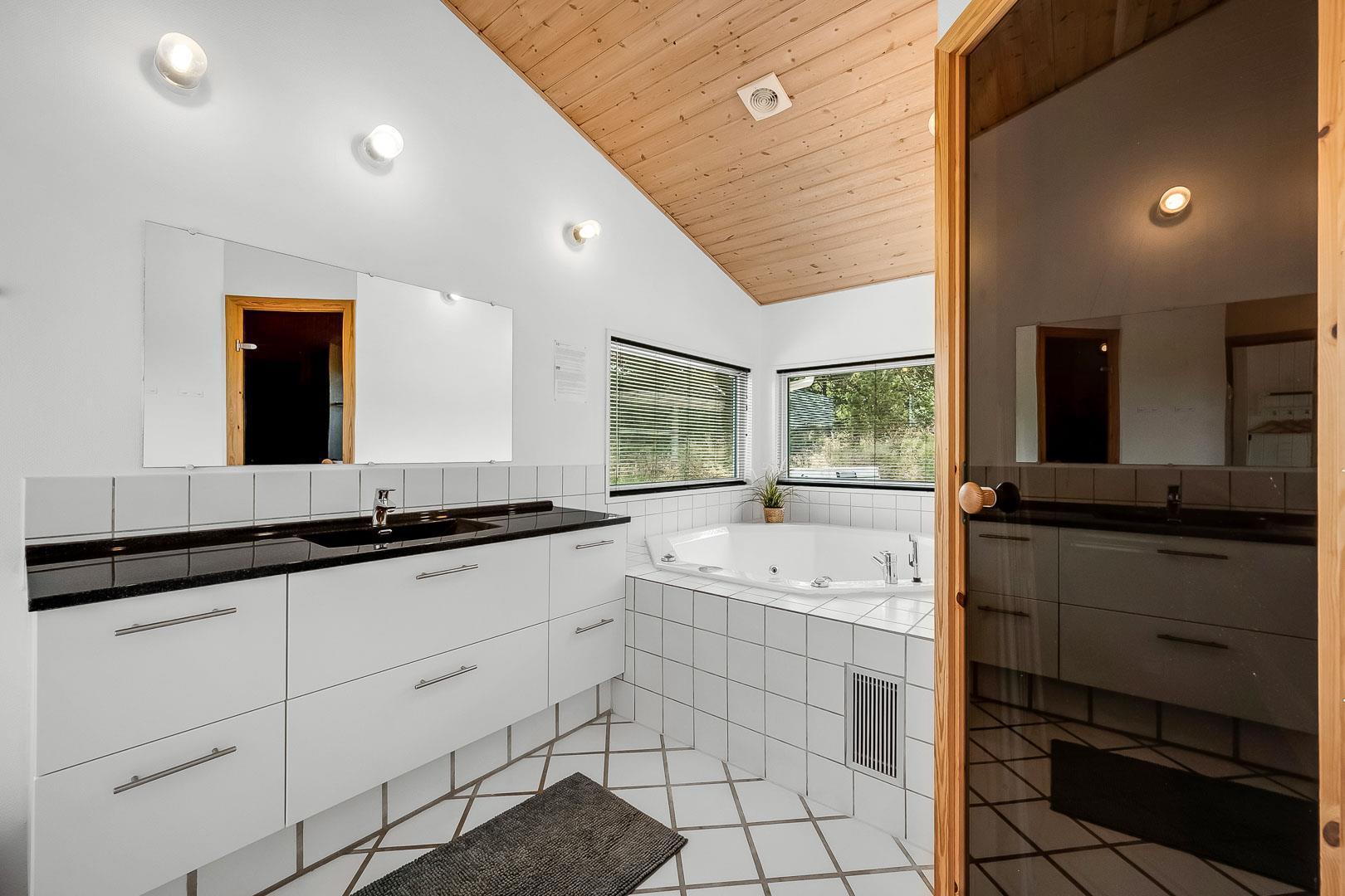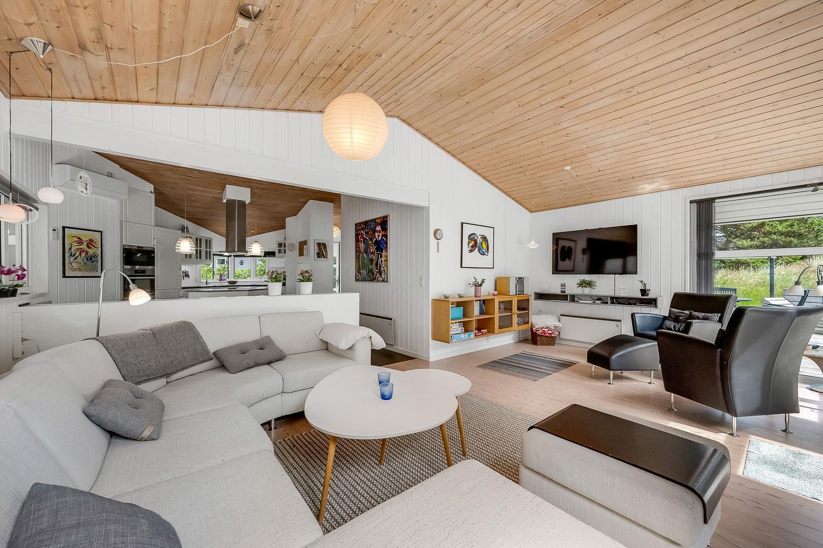 Dejligt feriehus tæt på by og strand. Huset er til 8 personer, rigtigt godt indrettet med mange hyggelige kroge. Fra entréen kommer du ind i et dejlig stort køkken alrum. Køkkenet og spisestuen grænser op til en stor opholds stue med brændeovn. På hver side af stuen ligger der 2 gode soverum og et badeværelse. Er i 2 familier, kan i trække jer tilbage i hver jeres ende af huset. Der er flise gulv med gulvvarme i begge badeværelser. Det ene badeværelse byder også på både sauna og spa.