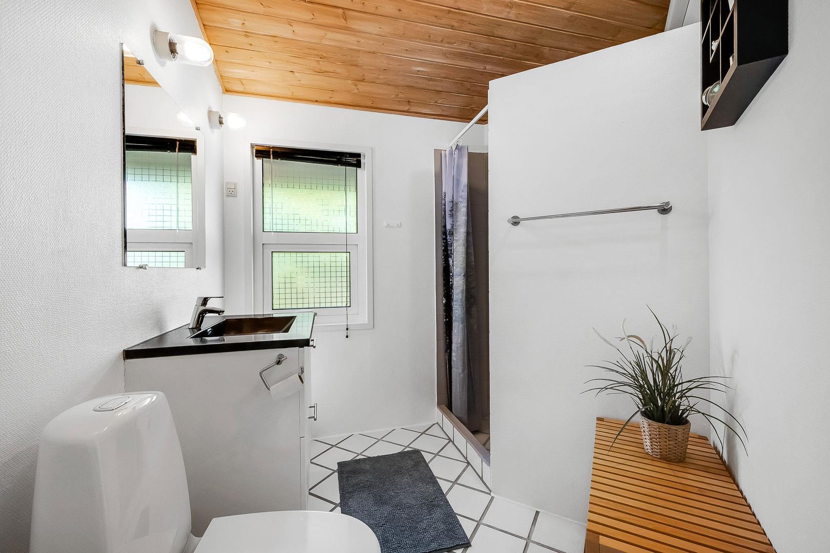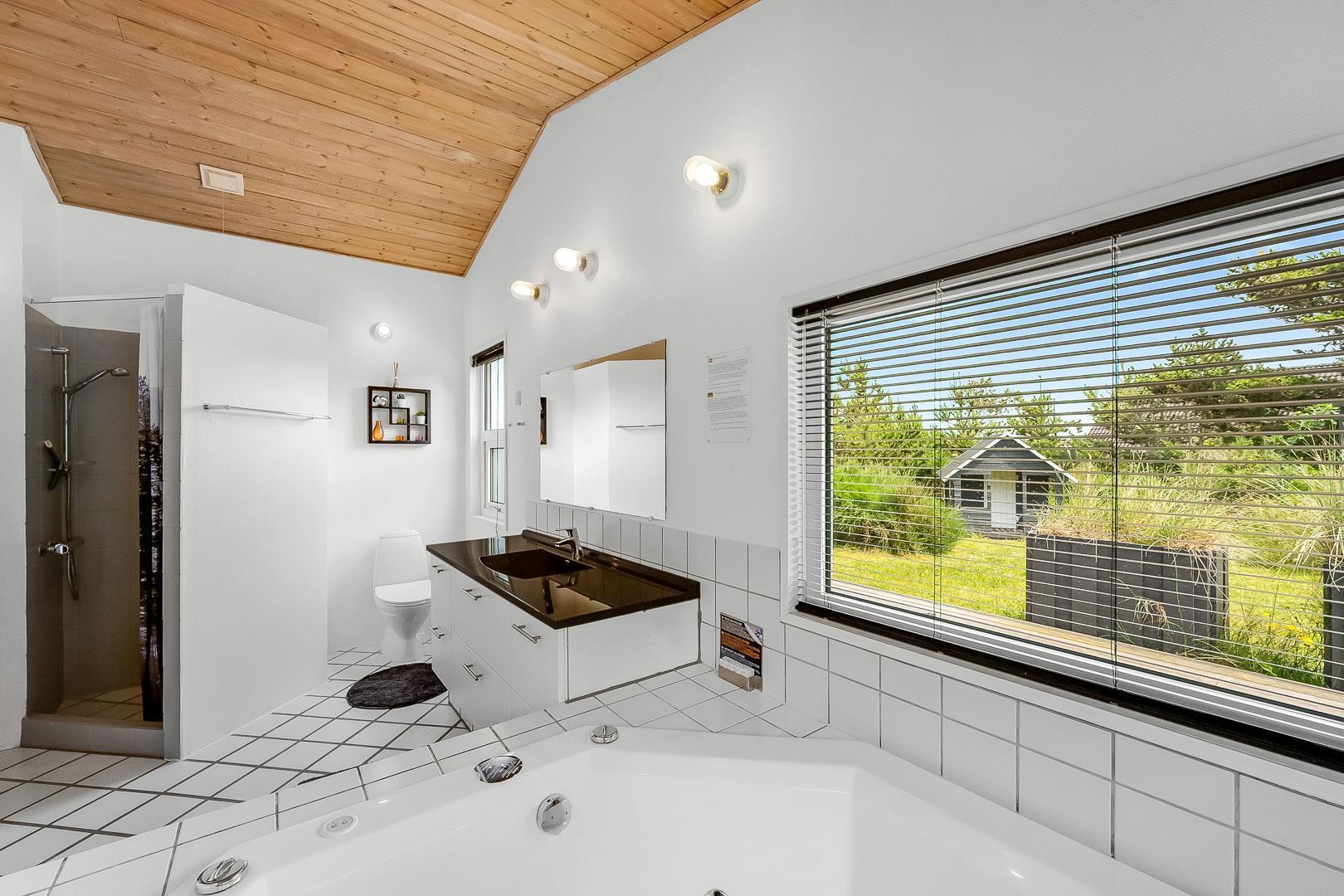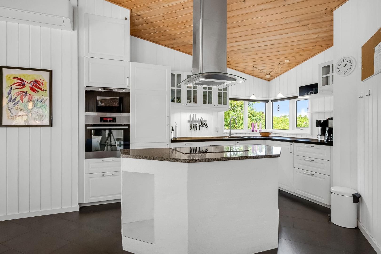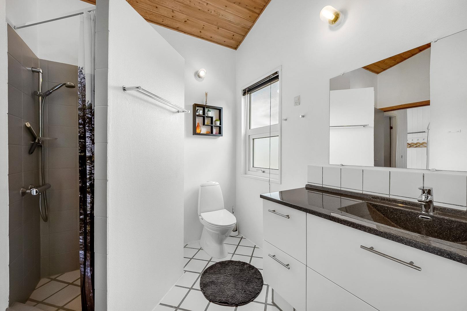 Dejligt feriehus tæt på by og strand. Huset er til 8 personer, rigtigt godt indrettet med mange hyggelige kroge. Fra entréen kommer du ind i et dejlig stort køkken alrum. Køkkenet og spisestuen grænser op til en stor opholds stue med brændeovn. På hver side af stuen ligger der 2 gode soverum og et badeværelse. Er i 2 familier, kan i trække jer tilbage i hver jeres ende af huset. Der er flise gulv med gulvvarme i begge badeværelser. Det ene badeværelse byder også på både sauna og spa.