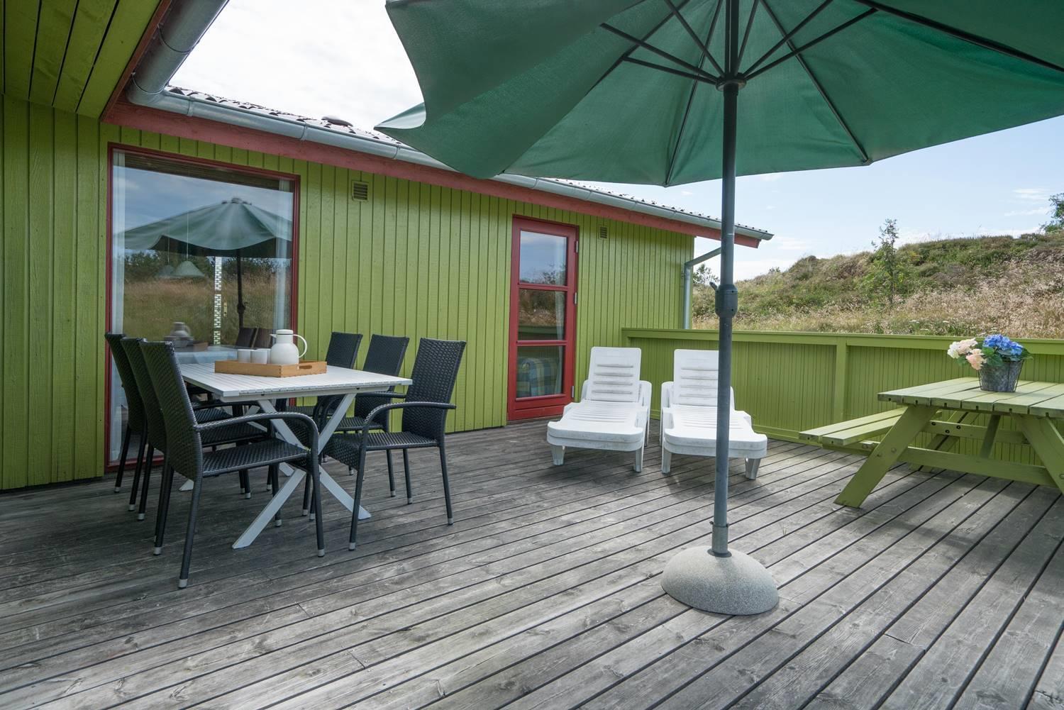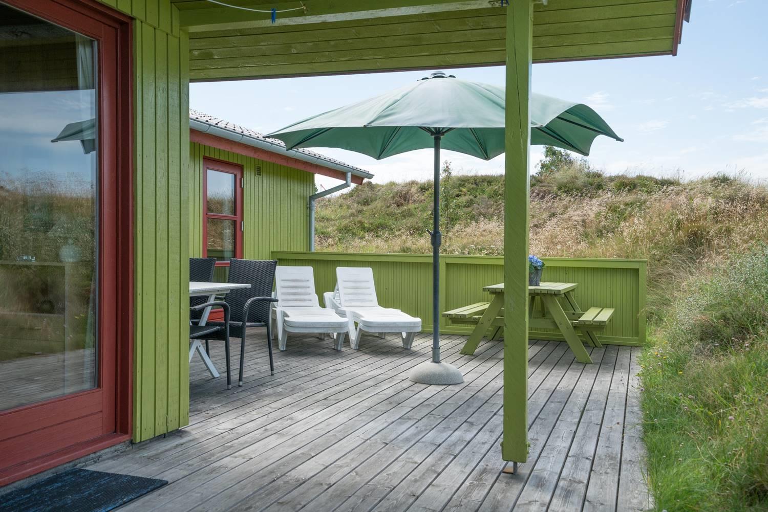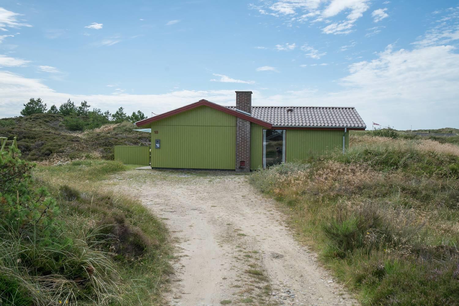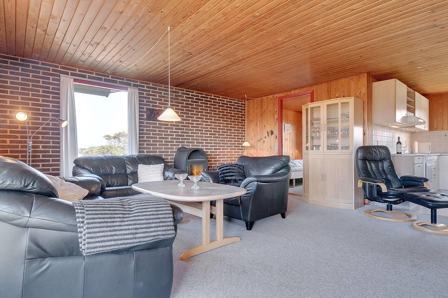 For enden af blind vej, på en kuperet klitgrund ligger dette dejlige feriehus. Det er 2 gode træterrasser, hvoraf den ene er delvis overdækket og den anden er indhegnet. Gode værelser og nyere badeværelse og køkken. Stor stue med brændeovn med glaslåge og udgang terrasse.