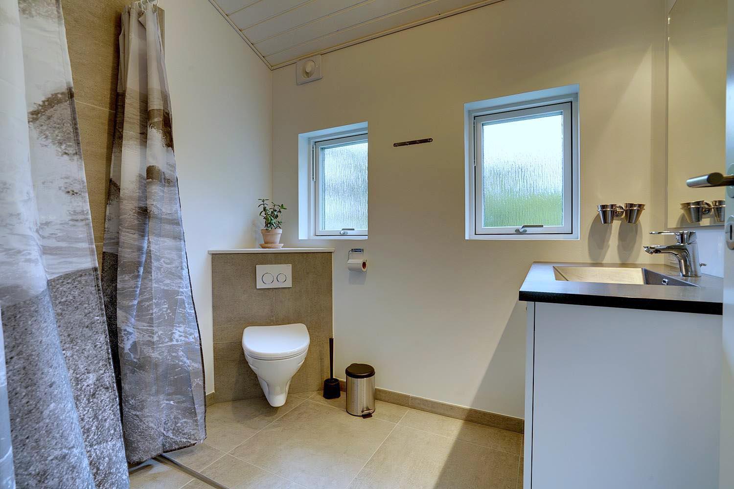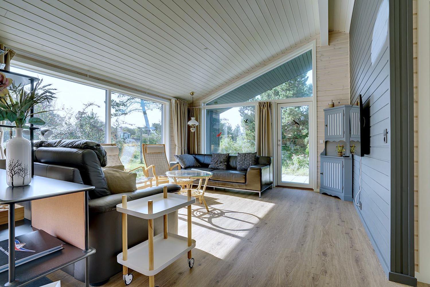 Feriehuset er opført i 2021. Lofterne går til kip, og rummene er badet i naturligt lys, som strømmer ind gennem de store vinduespartier.