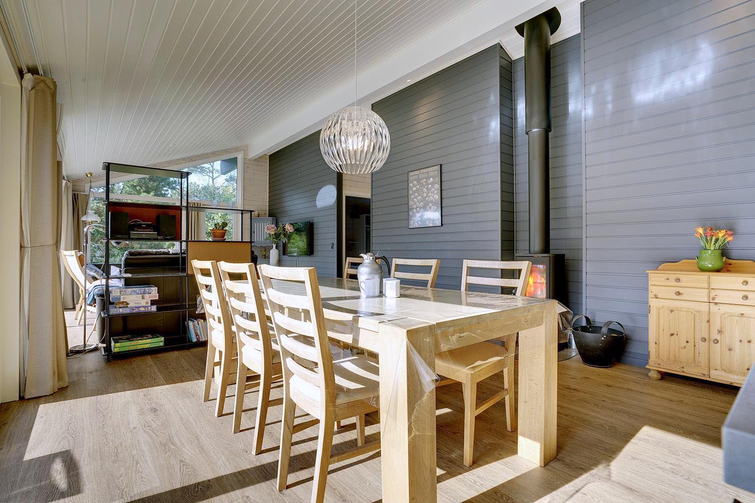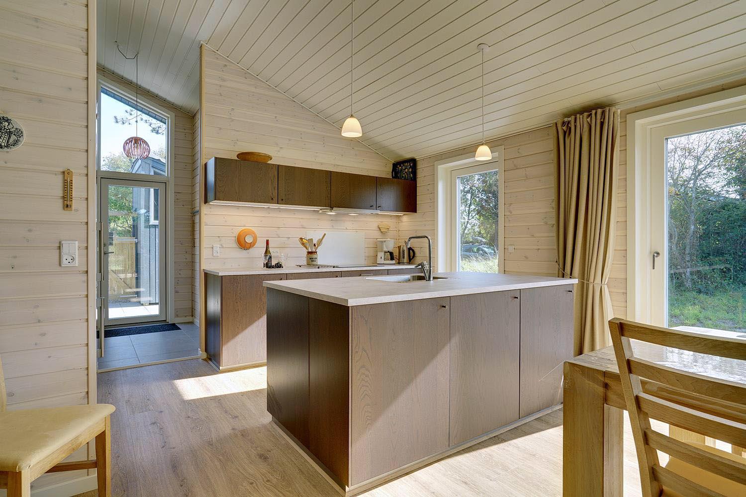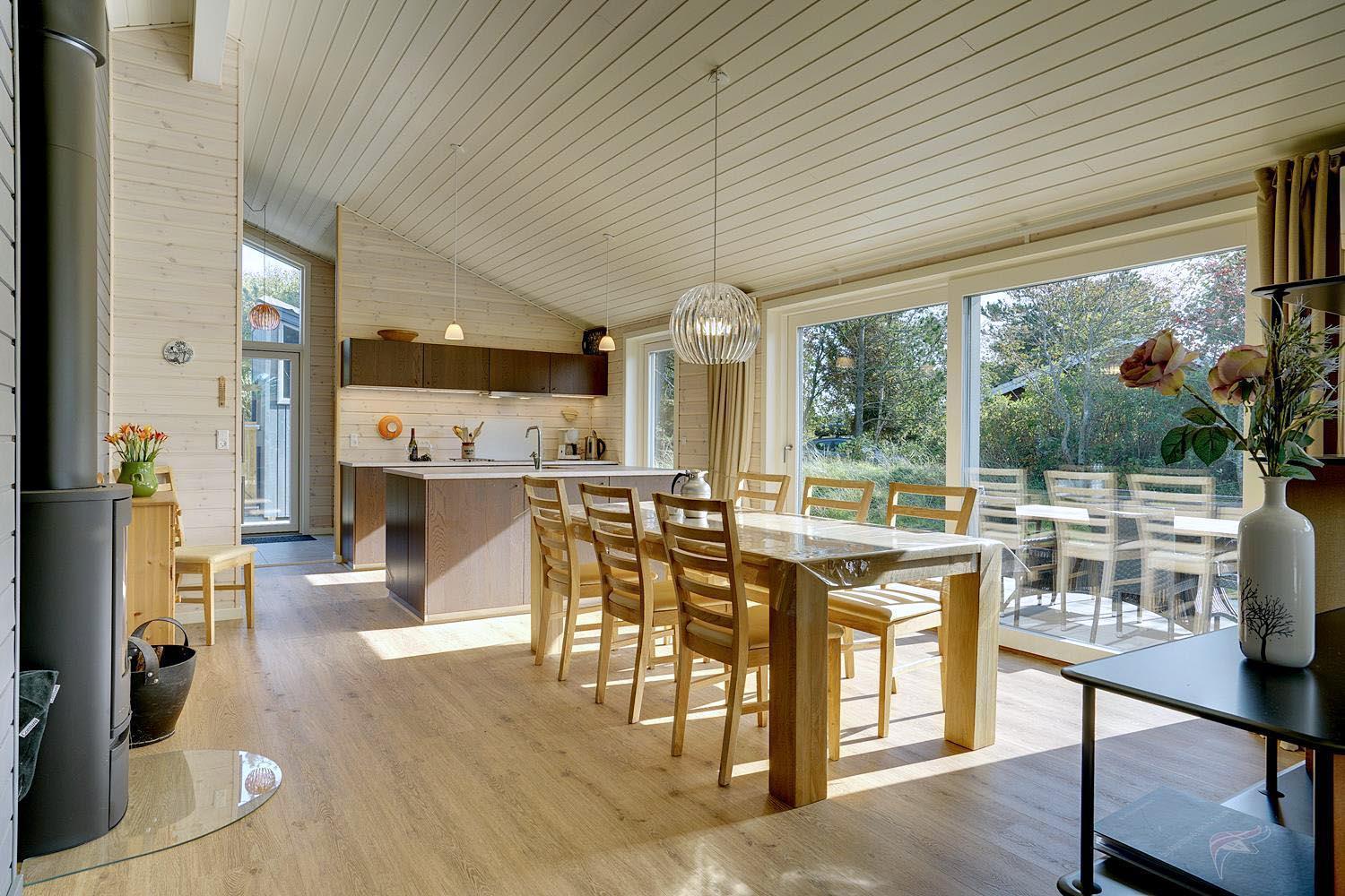 Flot køkken i åben forbindelse med stuen, og herudover byder huset på 3 soverum med seks sovepladser.