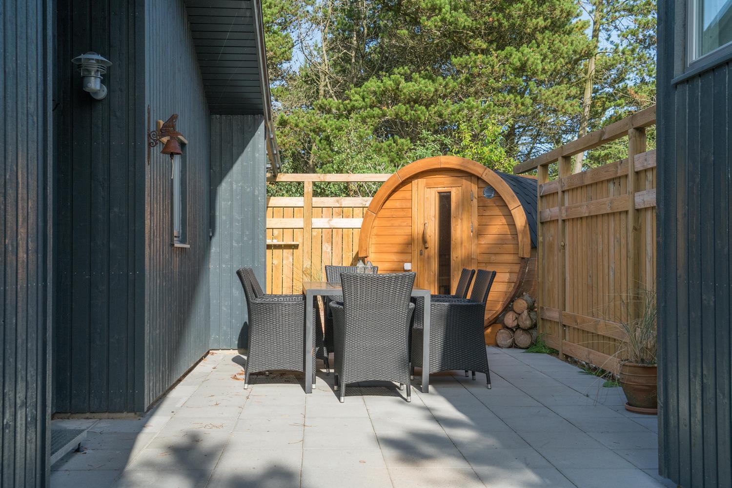 Der er udendørs sauna i forbindelse med lækkert udemiljø på endnu en terrasse.