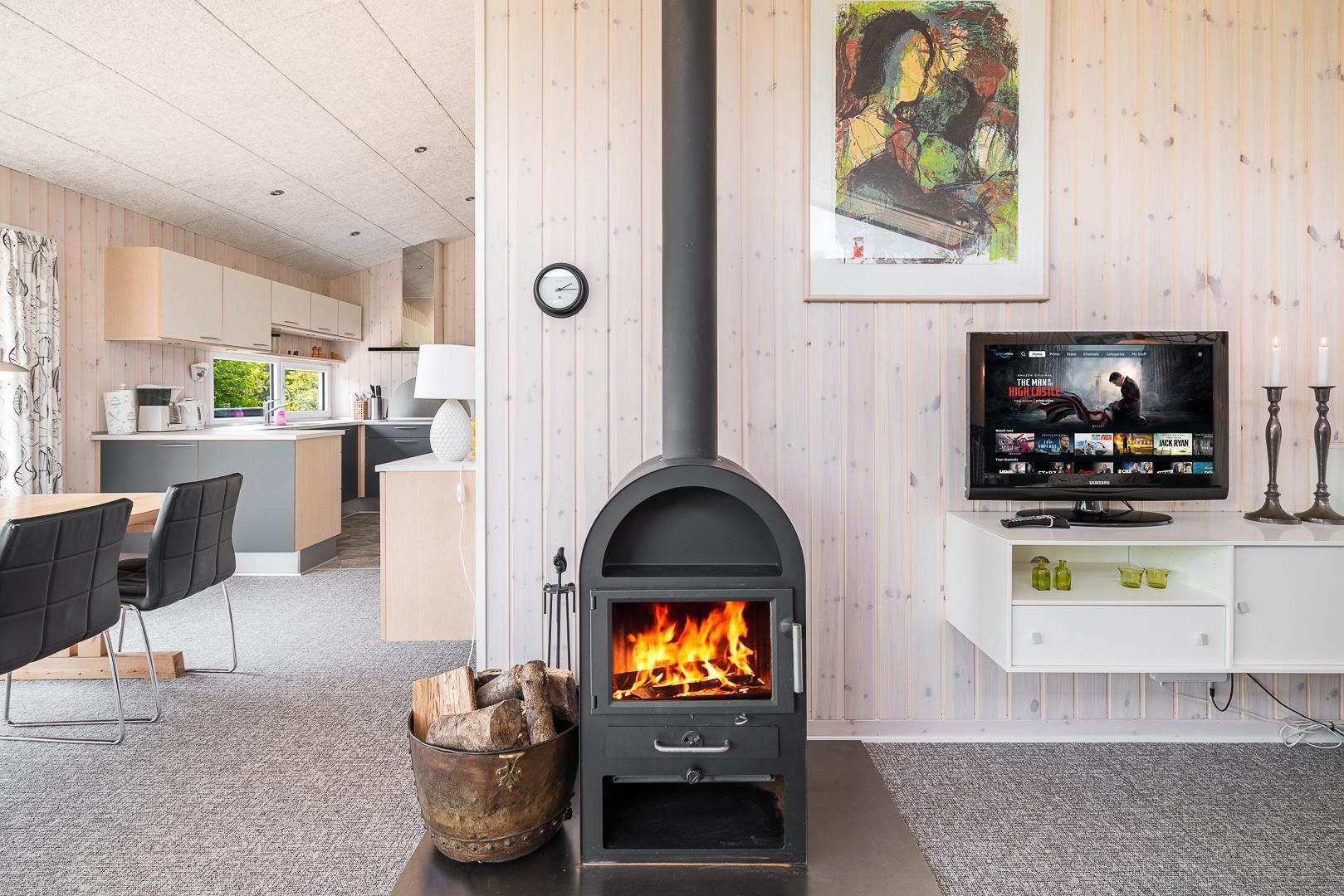 Huset byder på en hyggelig stue med loft til kip, brændeovn og en stor hjørnesofa, der skaber en varm og indbydende atmosfære. Den åbne forbindelse til det lækre, nye køkken gør det nemt at samles om madlavning og hyggelige stunder.