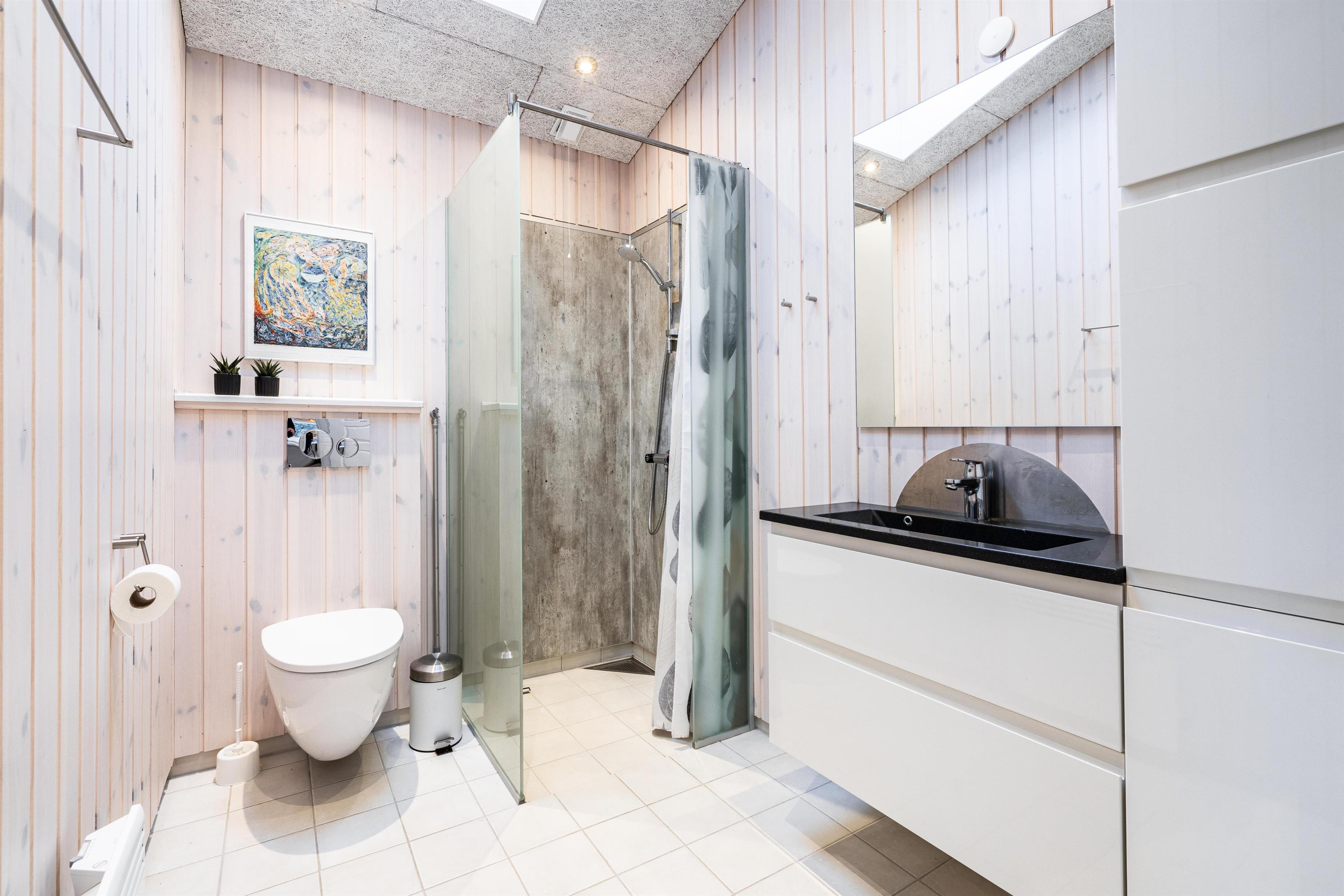 Det flotte badeværelse med gulvvarme sikrer ekstra komfort, og med tre gode værelser med skabe er der god plads til hele familien.