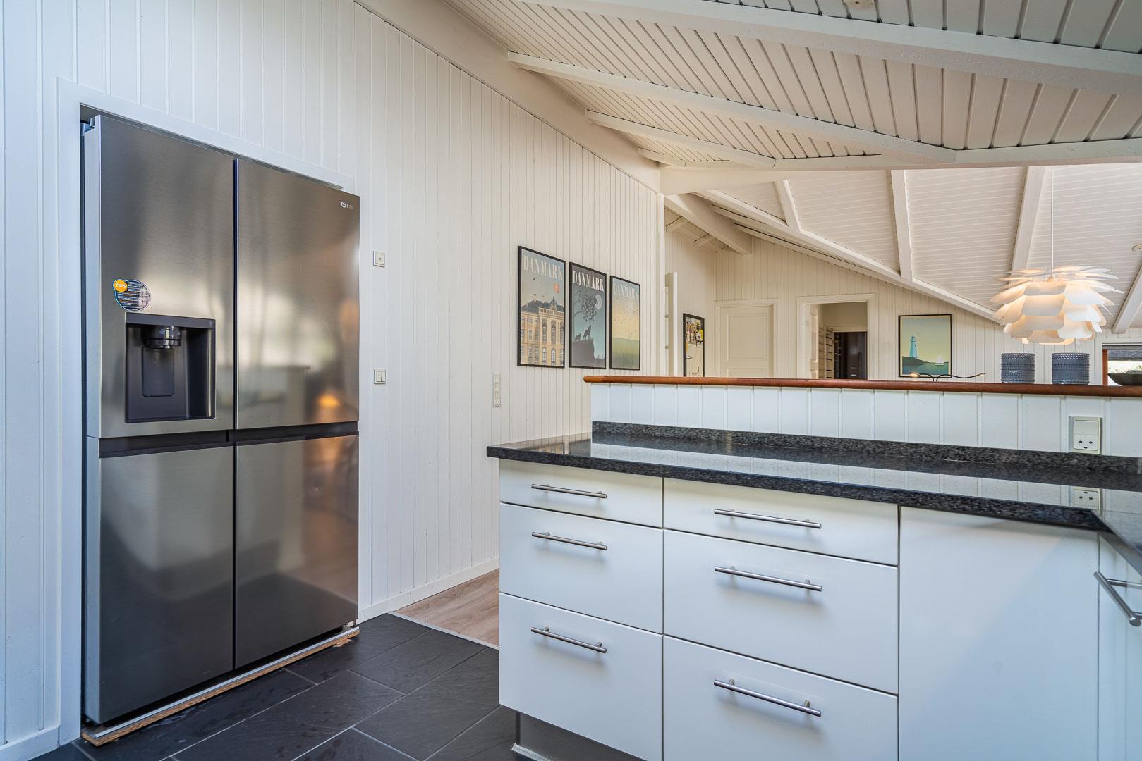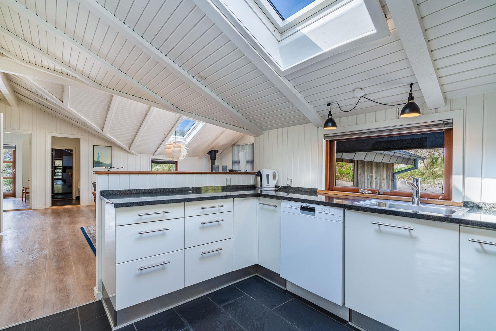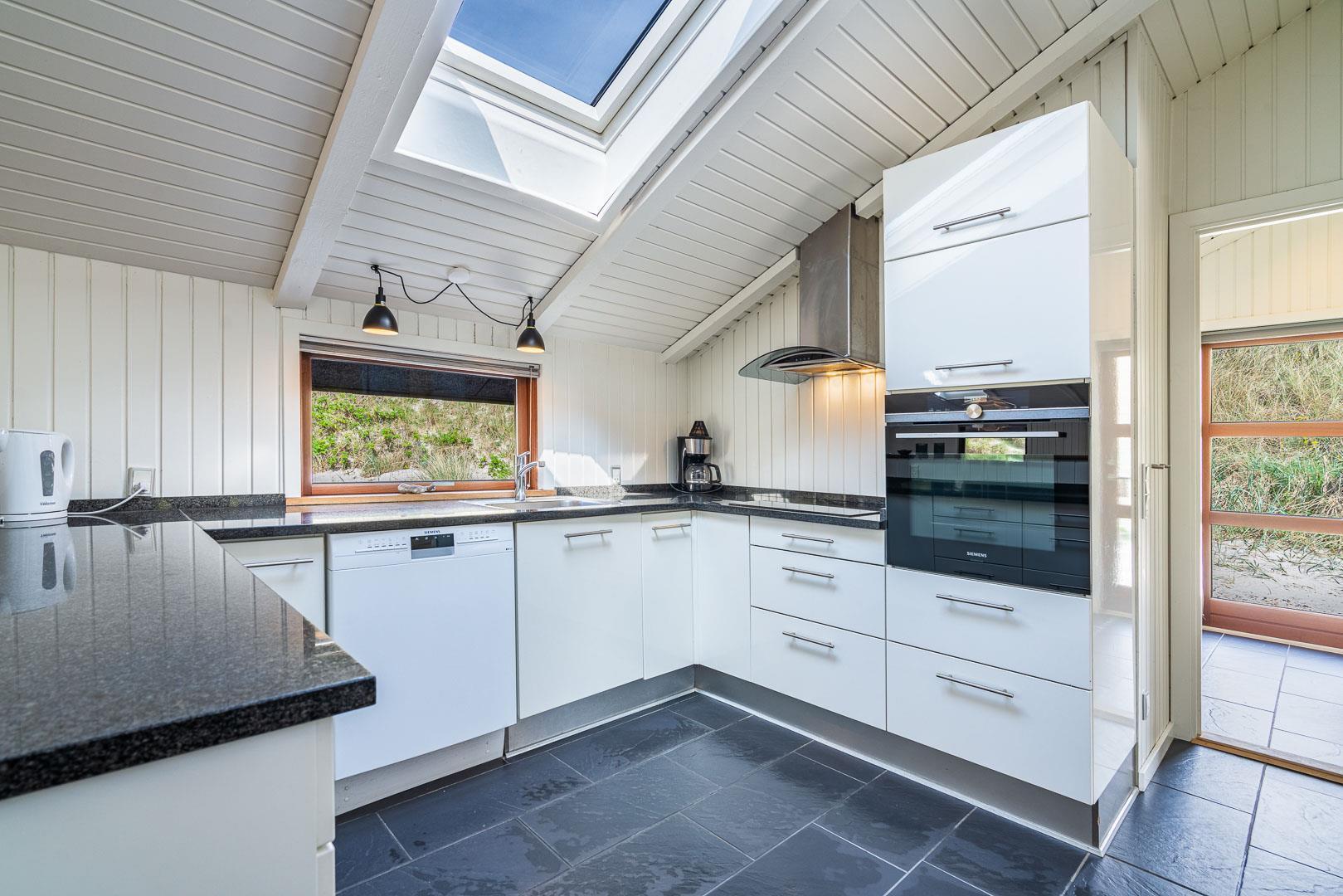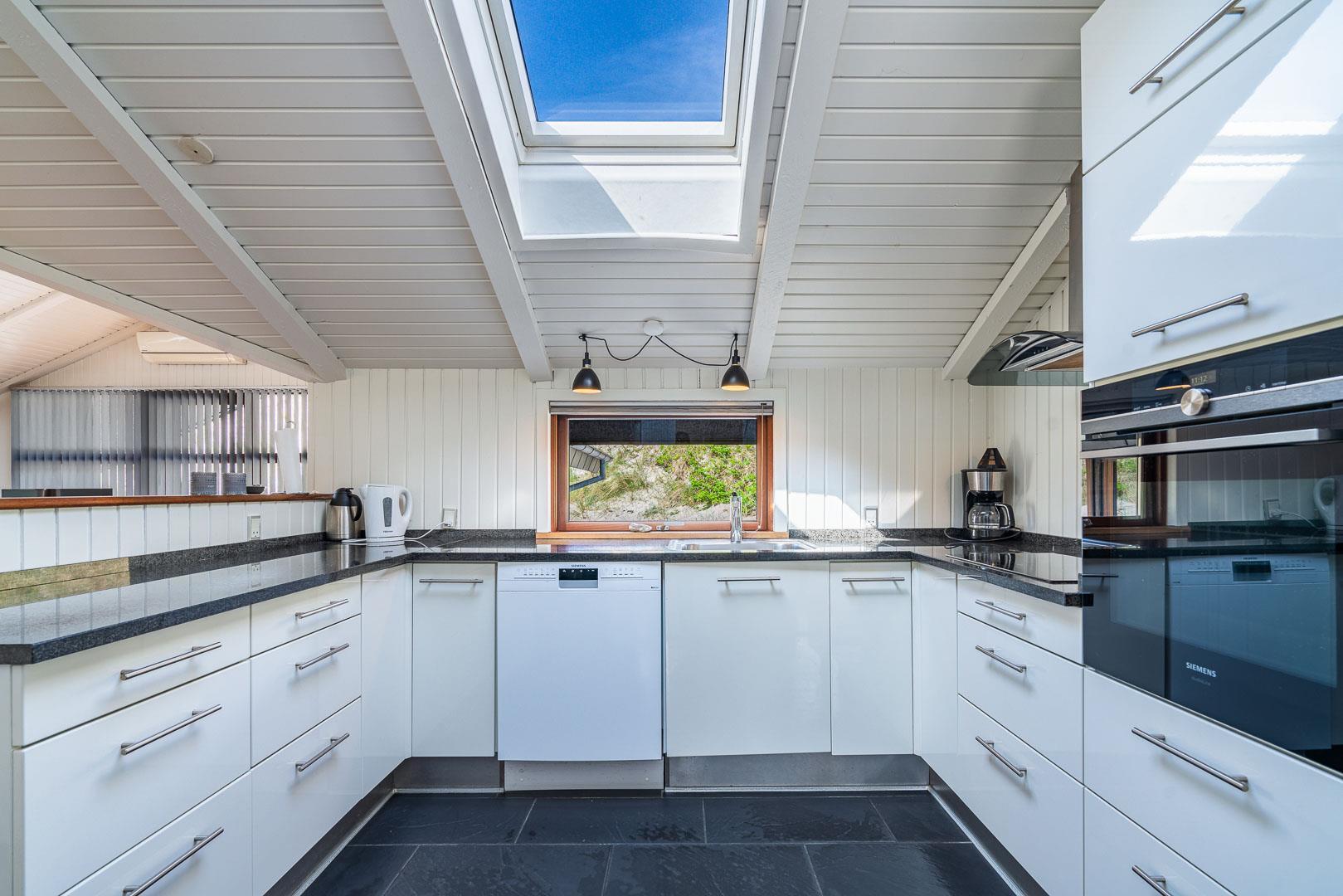 Feriehuset er indrettet med et dejligt lyst og åbent køkken, udstyret med gode faciliteter, herunder et amerikanerkøleskab. Køkkenet ligger i forlængelse af den hyggelige stue med brændeovn og direkte udsigt til 1. klitrække.