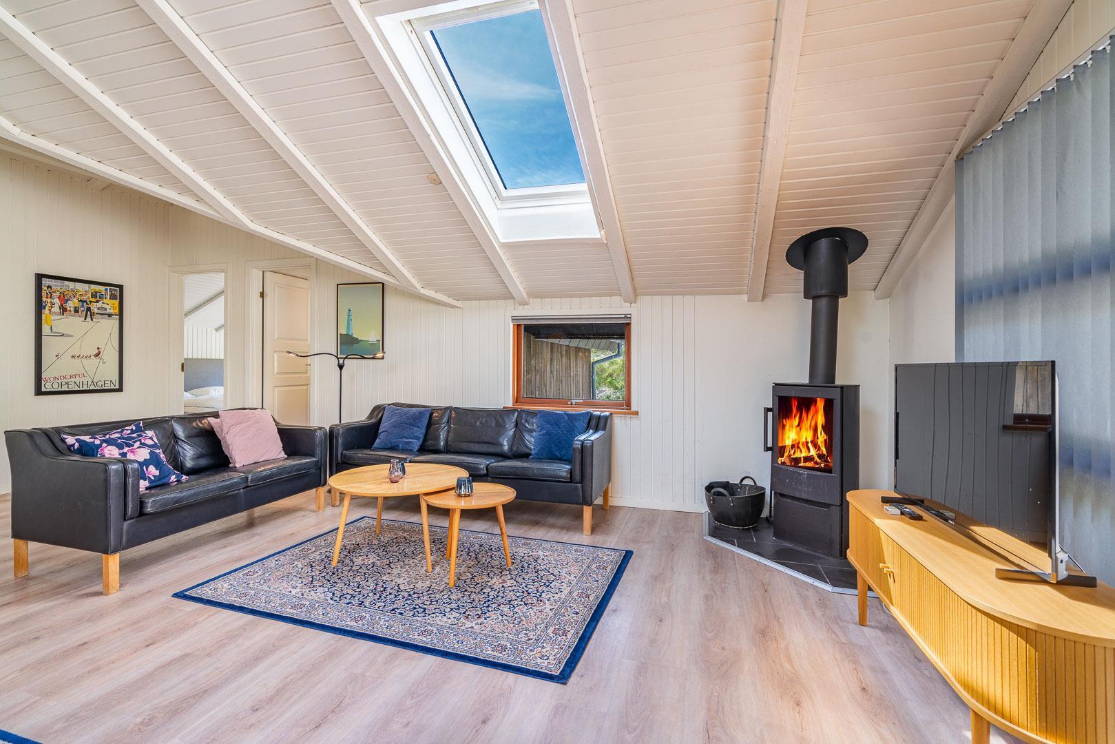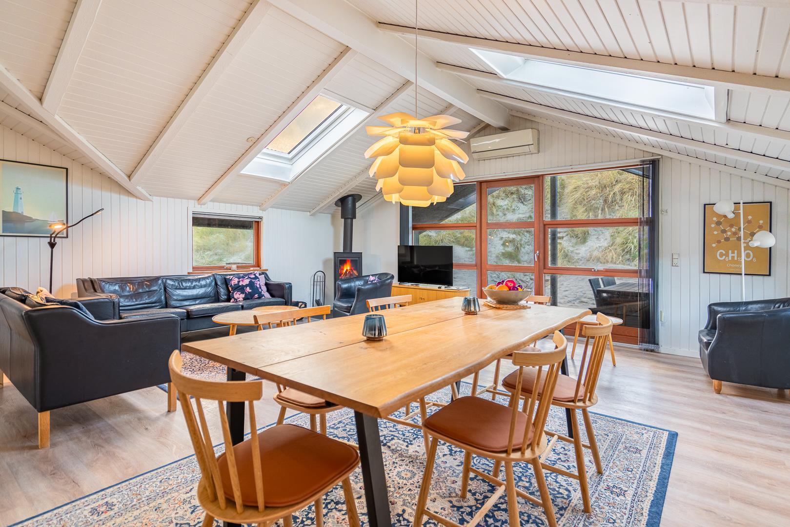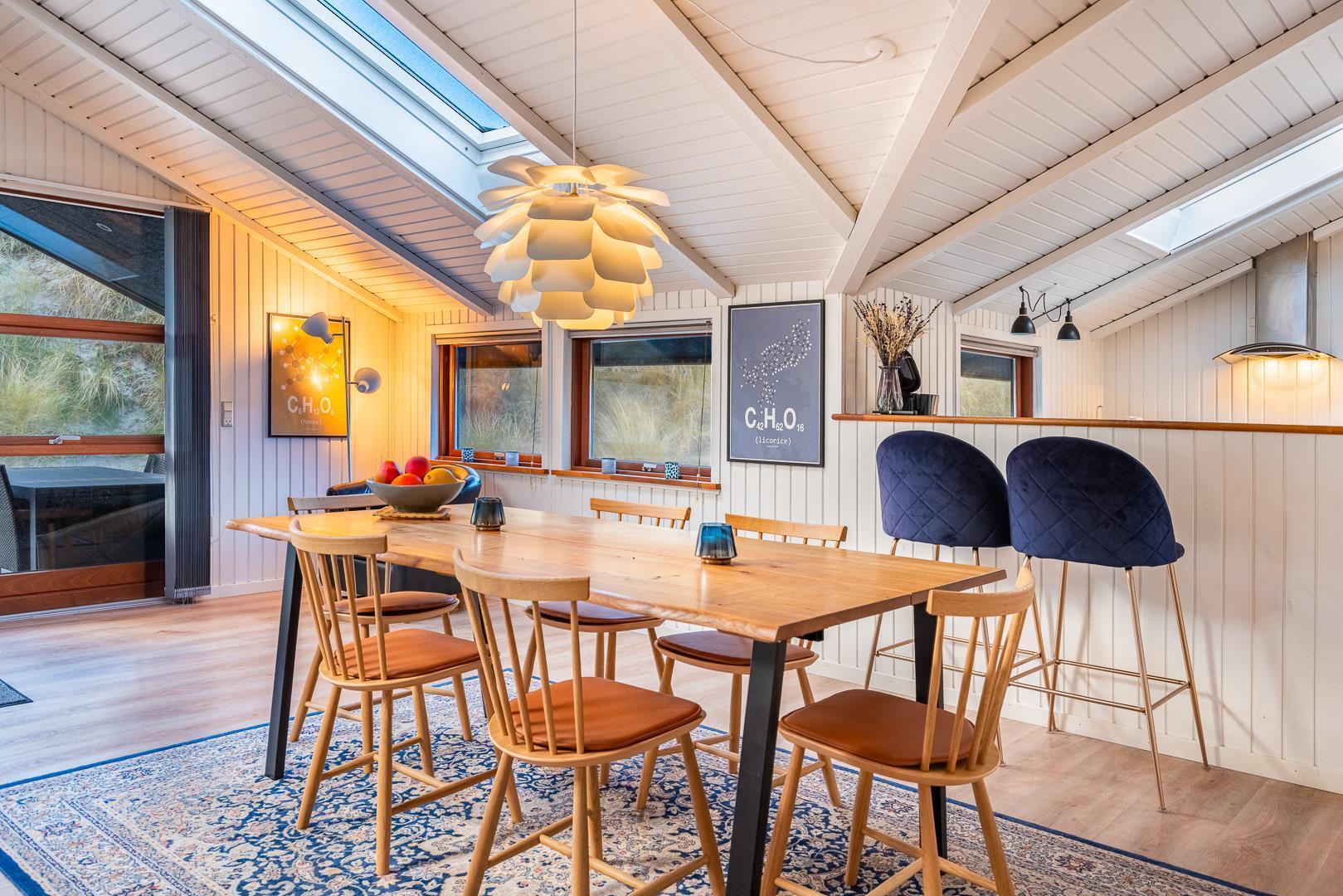Feriehuset er indrettet med et dejligt lyst og åbent køkken, udstyret med gode faciliteter, herunder et amerikanerkøleskab. Køkkenet ligger i forlængelse af den hyggelige stue med brændeovn og direkte udsigt til 1. klitrække.