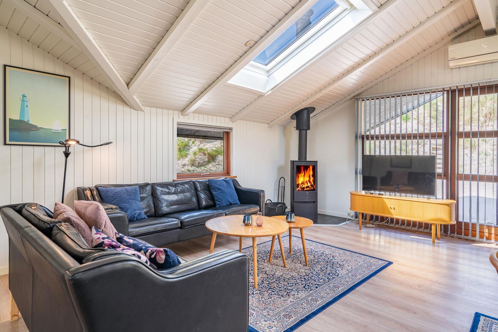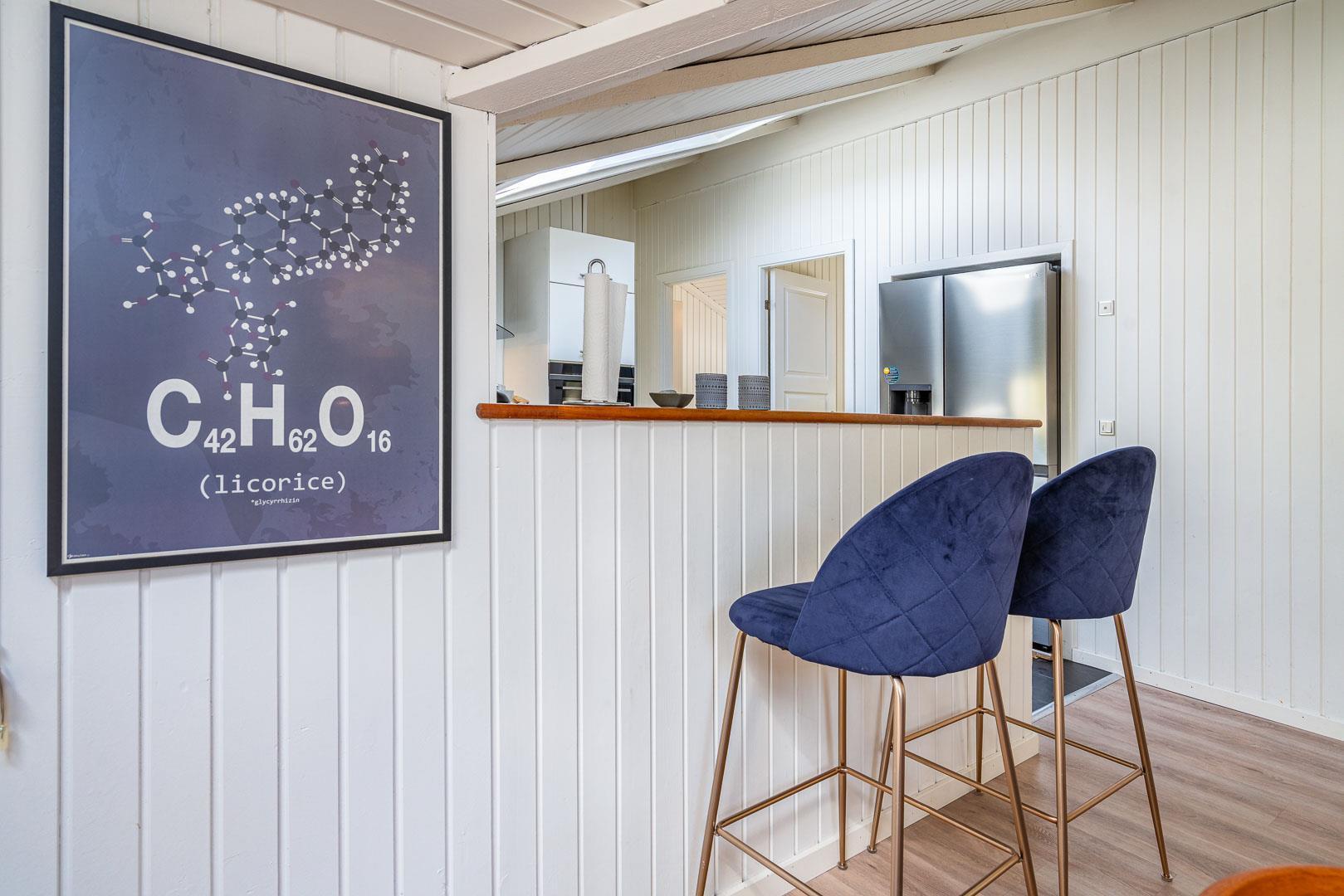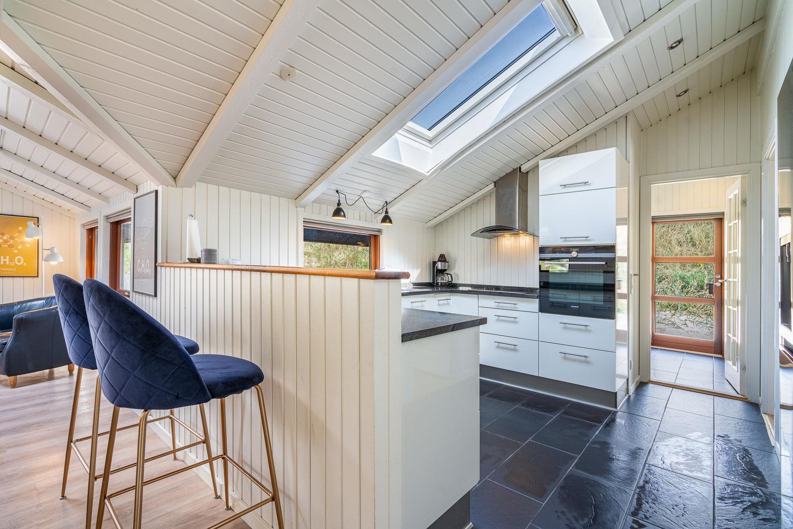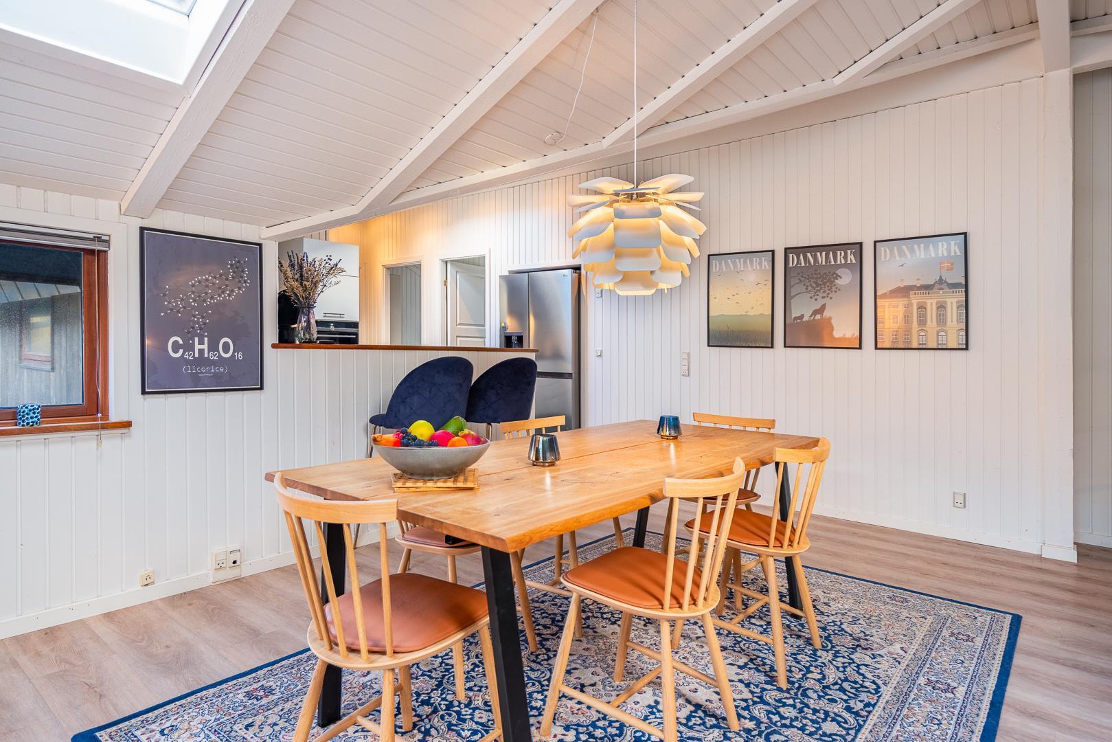 Feriehuset er indrettet med et dejligt lyst og åbent køkken, udstyret med gode faciliteter, herunder et amerikanerkøleskab. Køkkenet ligger i forlængelse af den hyggelige stue med brændeovn og direkte udsigt til 1. klitrække.