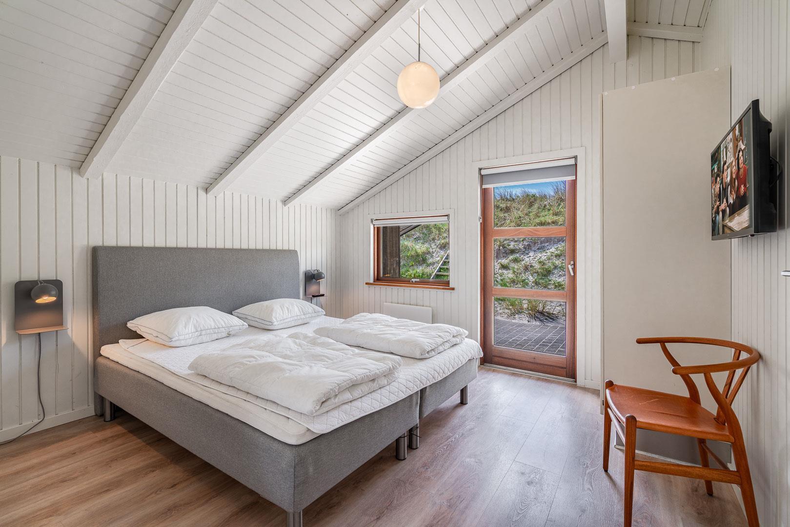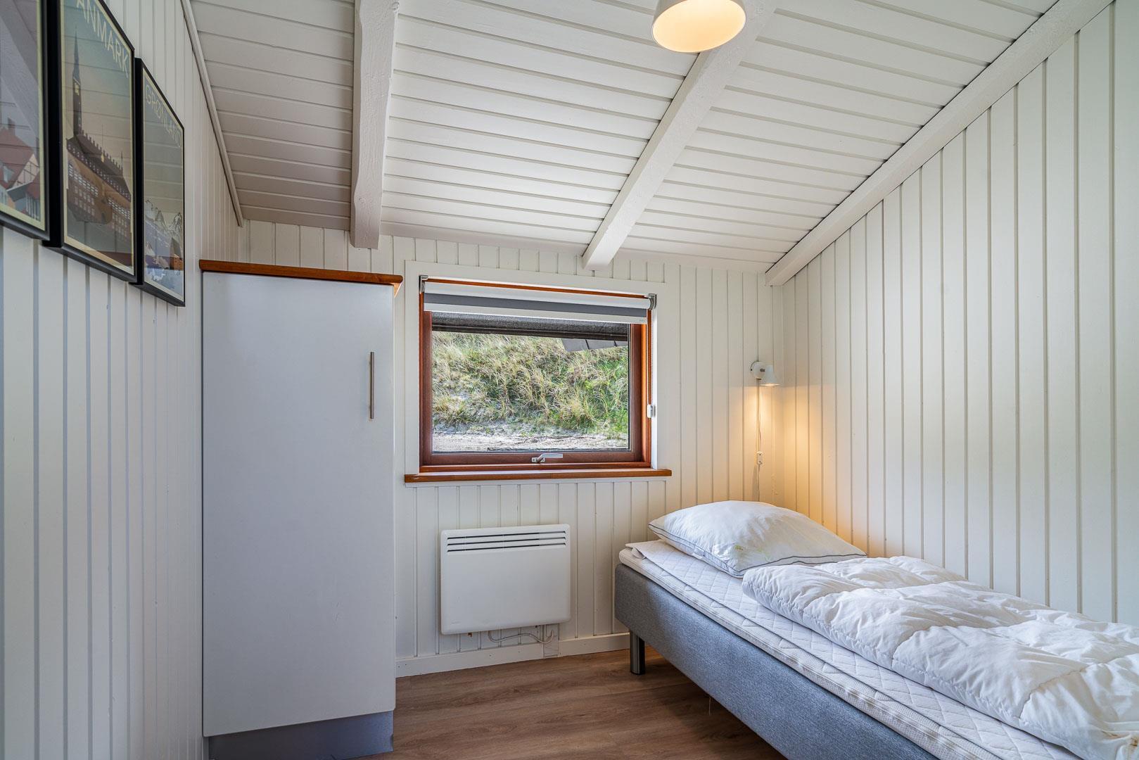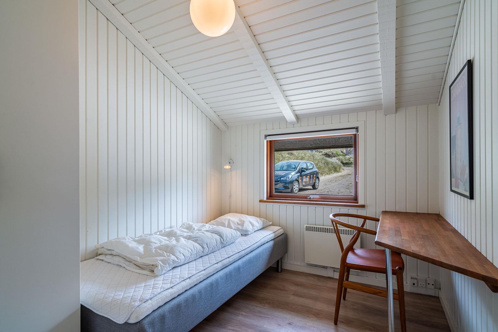 Her er plads til 6 personer med fire skønne soveværelser og to badeværelser. To af værelserne er med dobbeltsenge og derudover er her to værelser med en enkeltseng – perfekt hvis du rejser med teenagere der ønsker sit eget rum. Fra et af soveværelserne kan du træde direkte ud på morgenterrassen, hvor både morgensolen og morgenkaffen kan nydes, samtidig med at du hører det brusende Vesterhav.