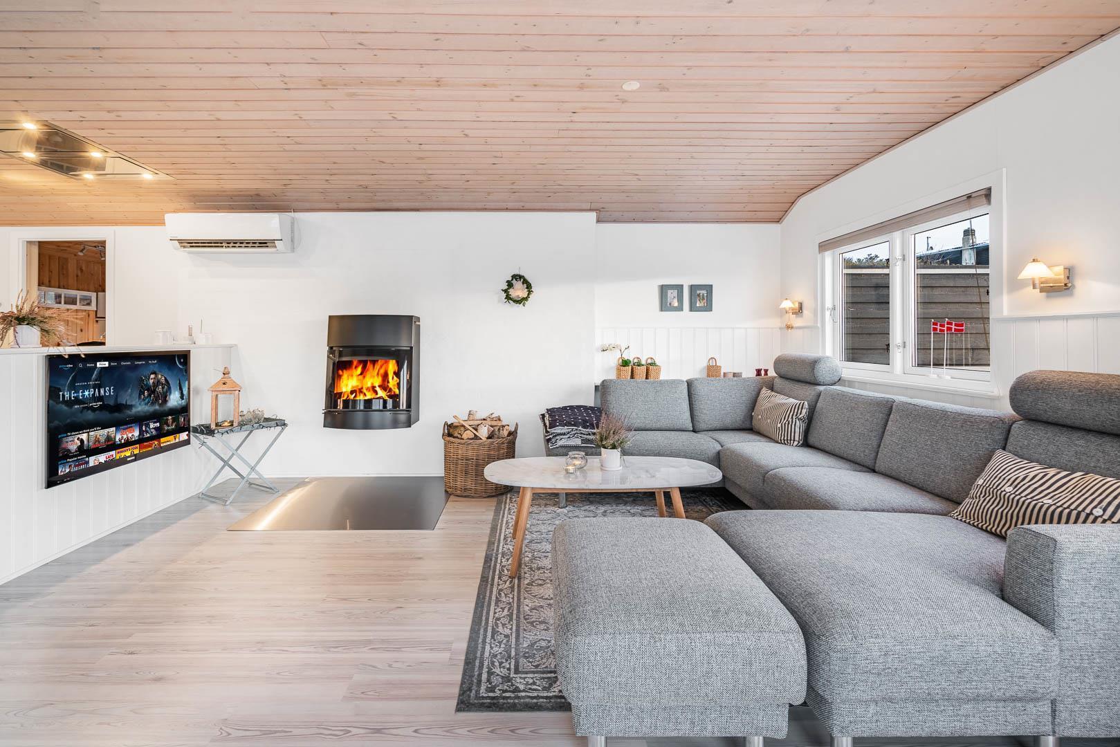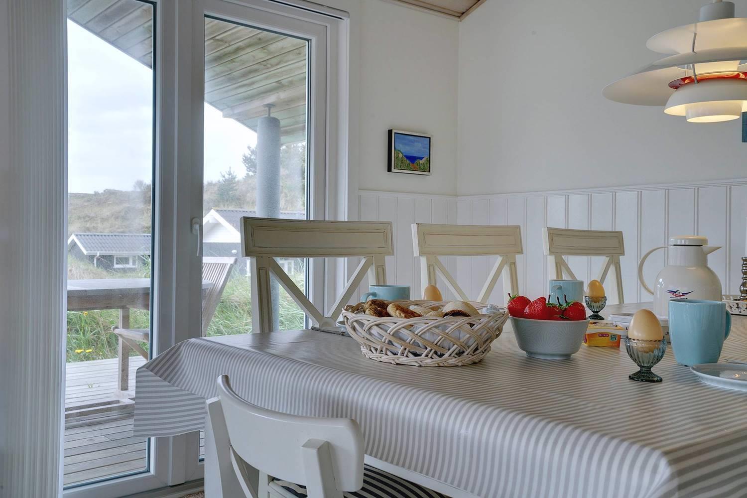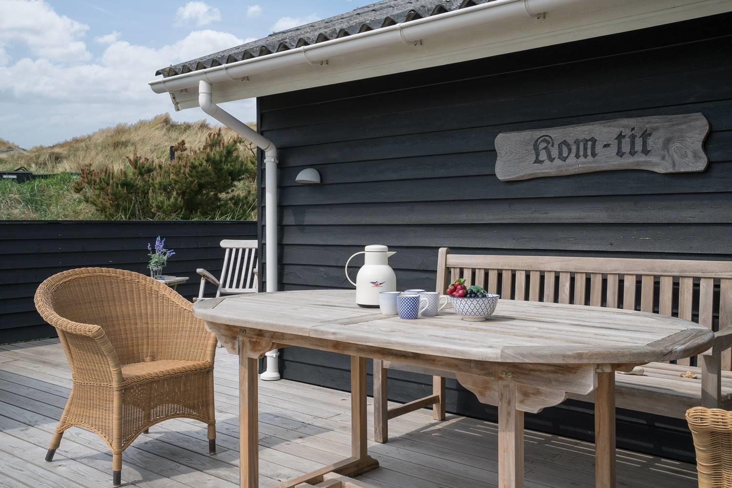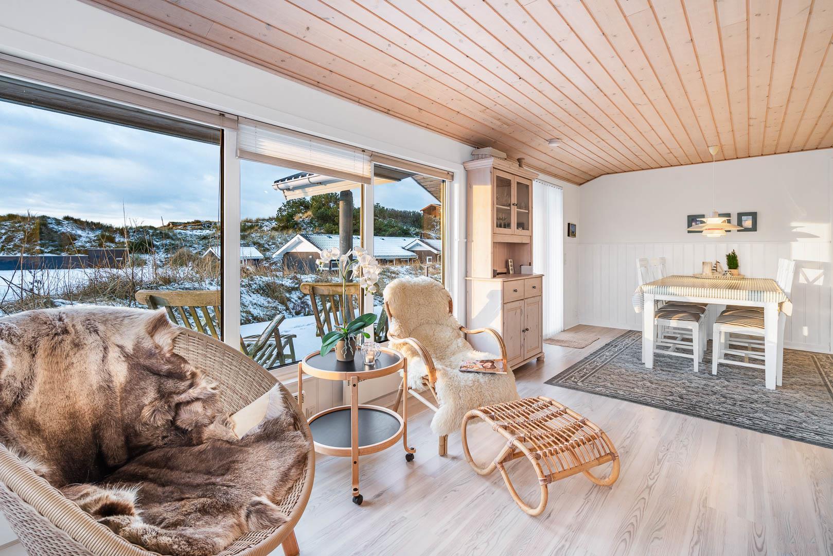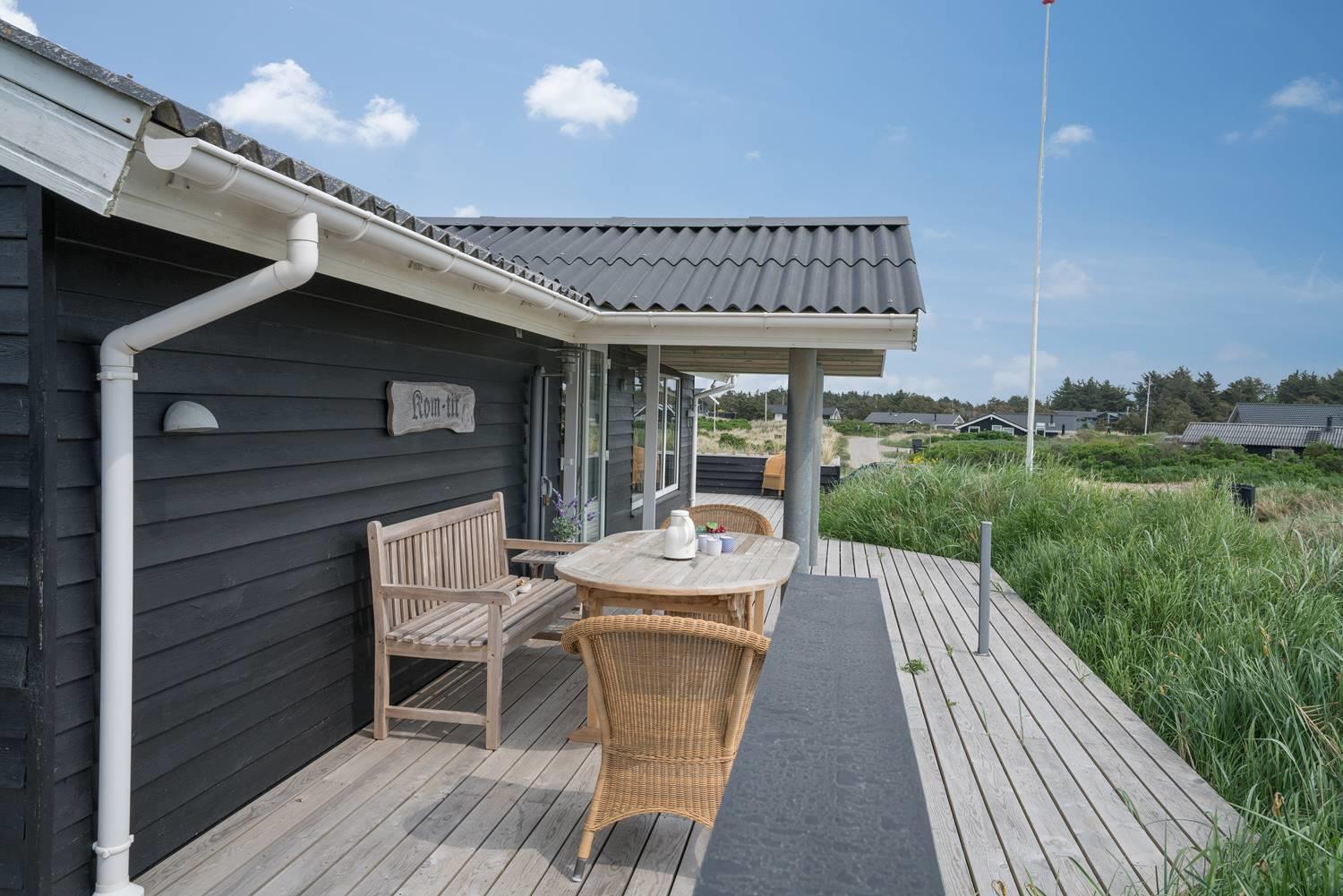 Flot og lyst feriehus på klitgrund nær havet i Henne Strand, perfekt til en hyggelig ferie for fire personer.