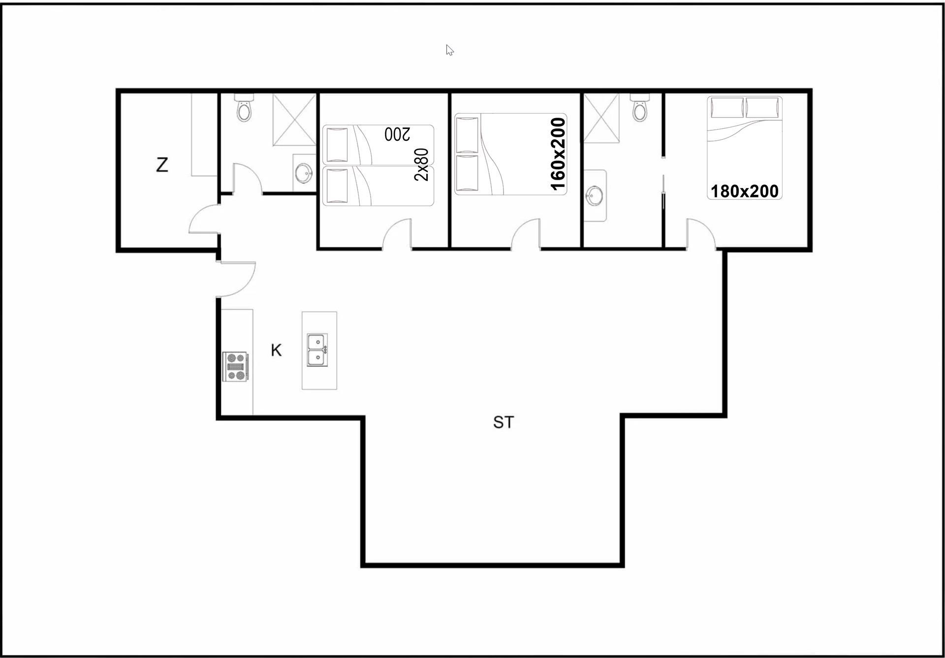 Sengestørrelse: 1 dobbeltsenge med 2 madrasser 80 x 200 cm + 1 dobbeltseng 160 x 200 cm + 1 dobbeltseng 180 x 200 cm