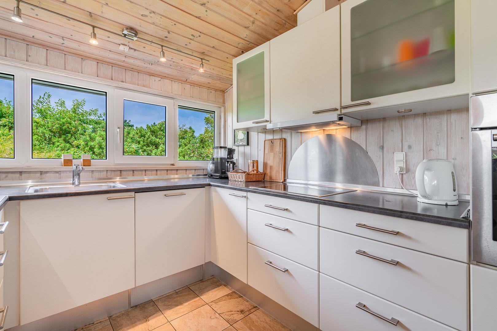 Sommerhuset er funktionelt indrettet med store glaspartier, der inviterer dagslyset indenfor. Møblerne og interiøret er tidssvarende, lofterne går til kip og den hyggeligt knitrende brændeovn er flot integreret.